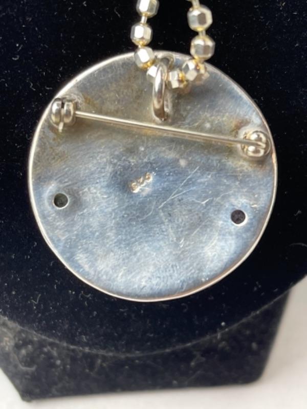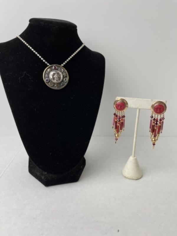 Necklace is 20” long with moon face pendant/pin measuring 1.5” round and earrings are marked tabra on back and posts are stamped 14k and measure 2.5” long