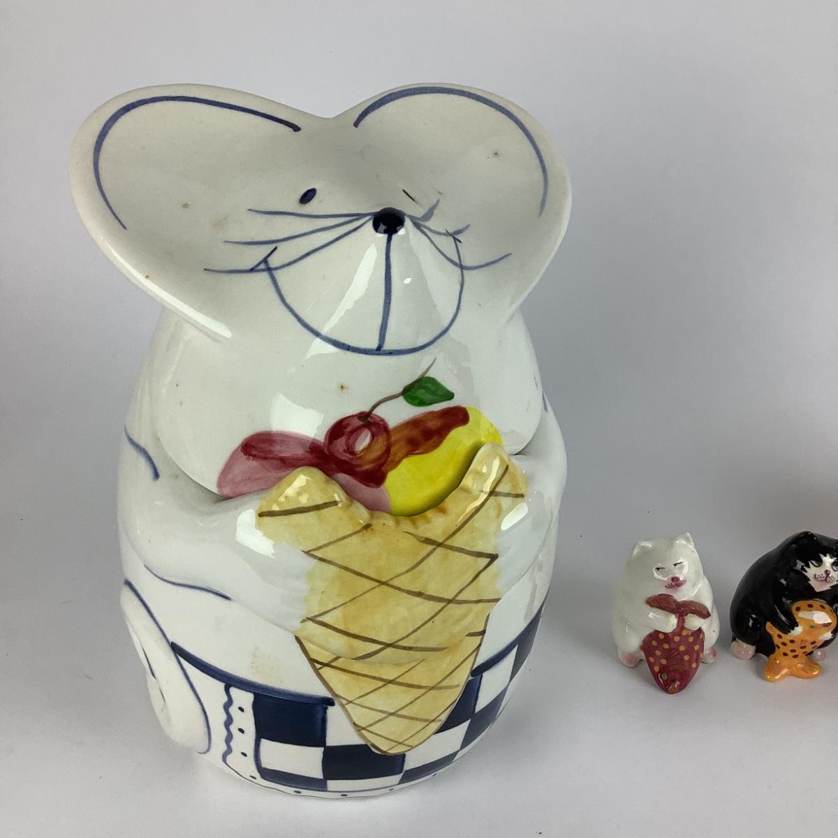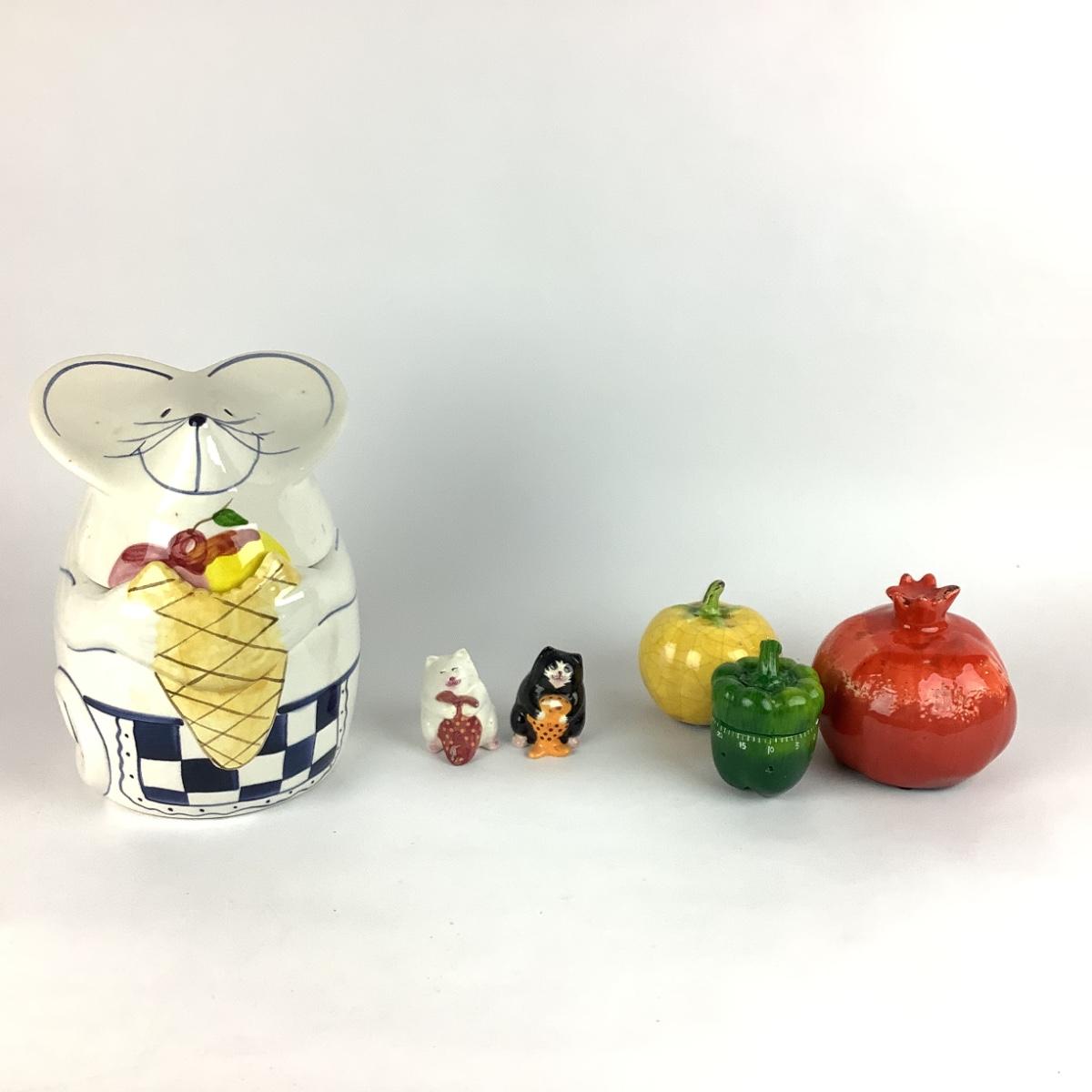 K739 Large Mouse Cookie Jar with Cat Salt and Pepper , Pepper Kitchen Timer and Decor