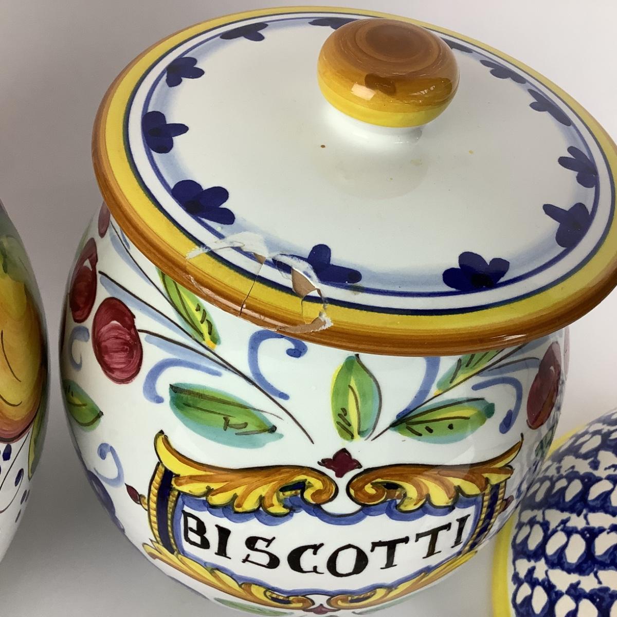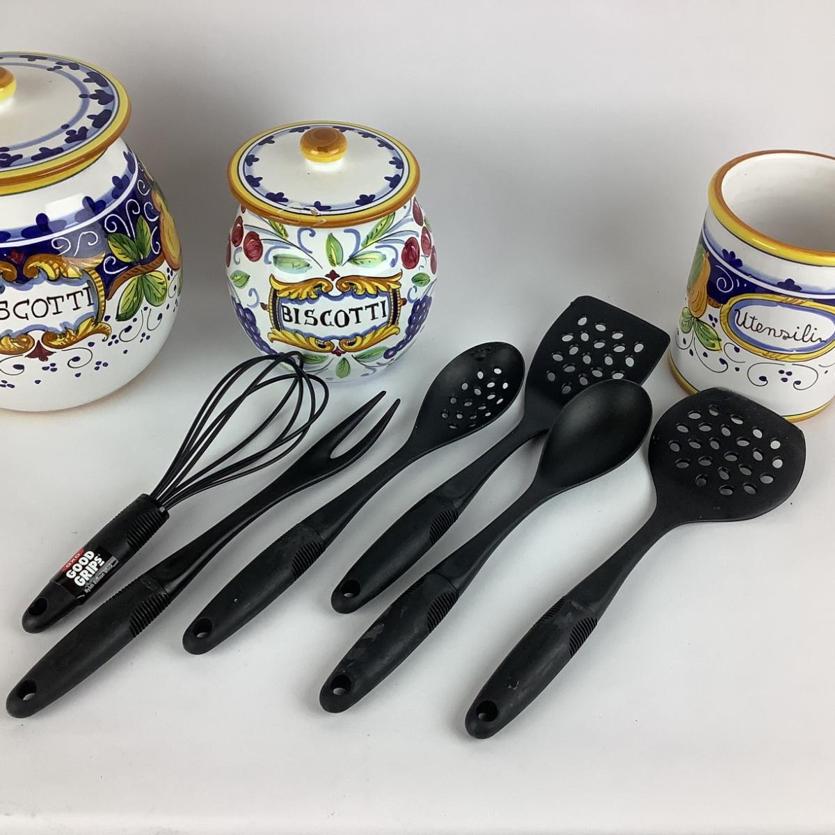 7" and 9" high biscotti jars, with OXO Utensils , blue bowl and four small oil bowls