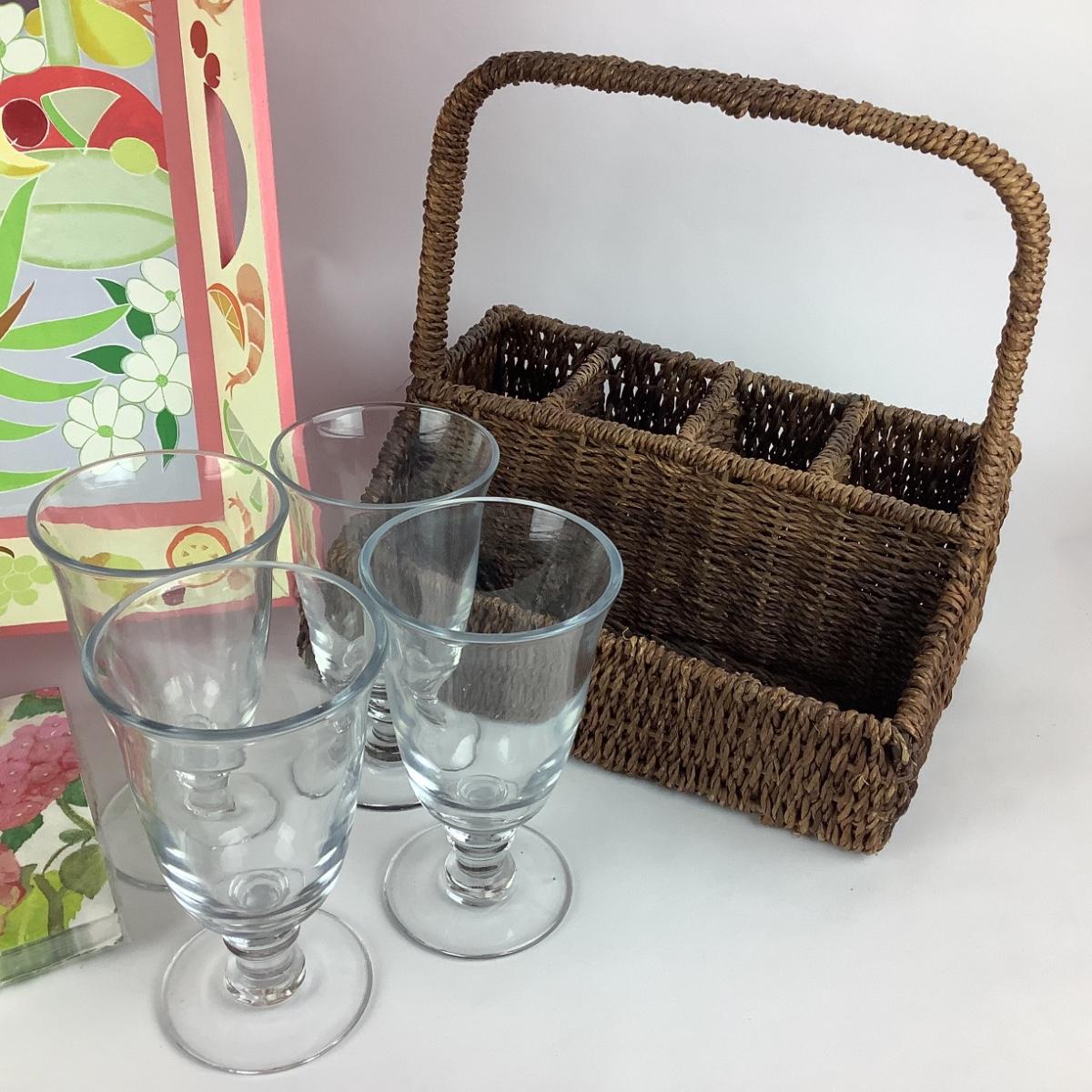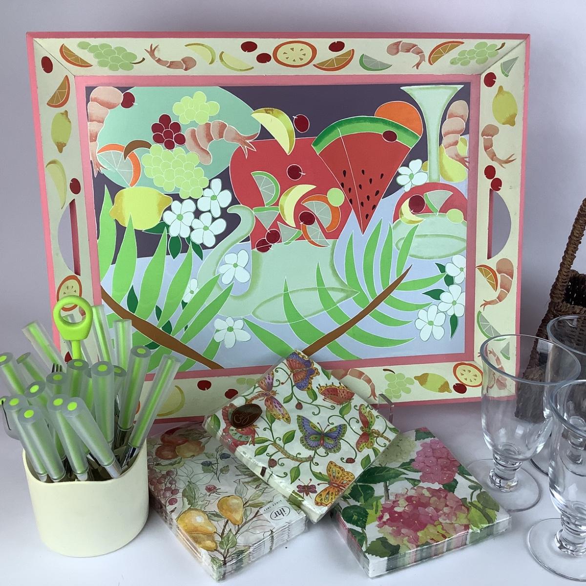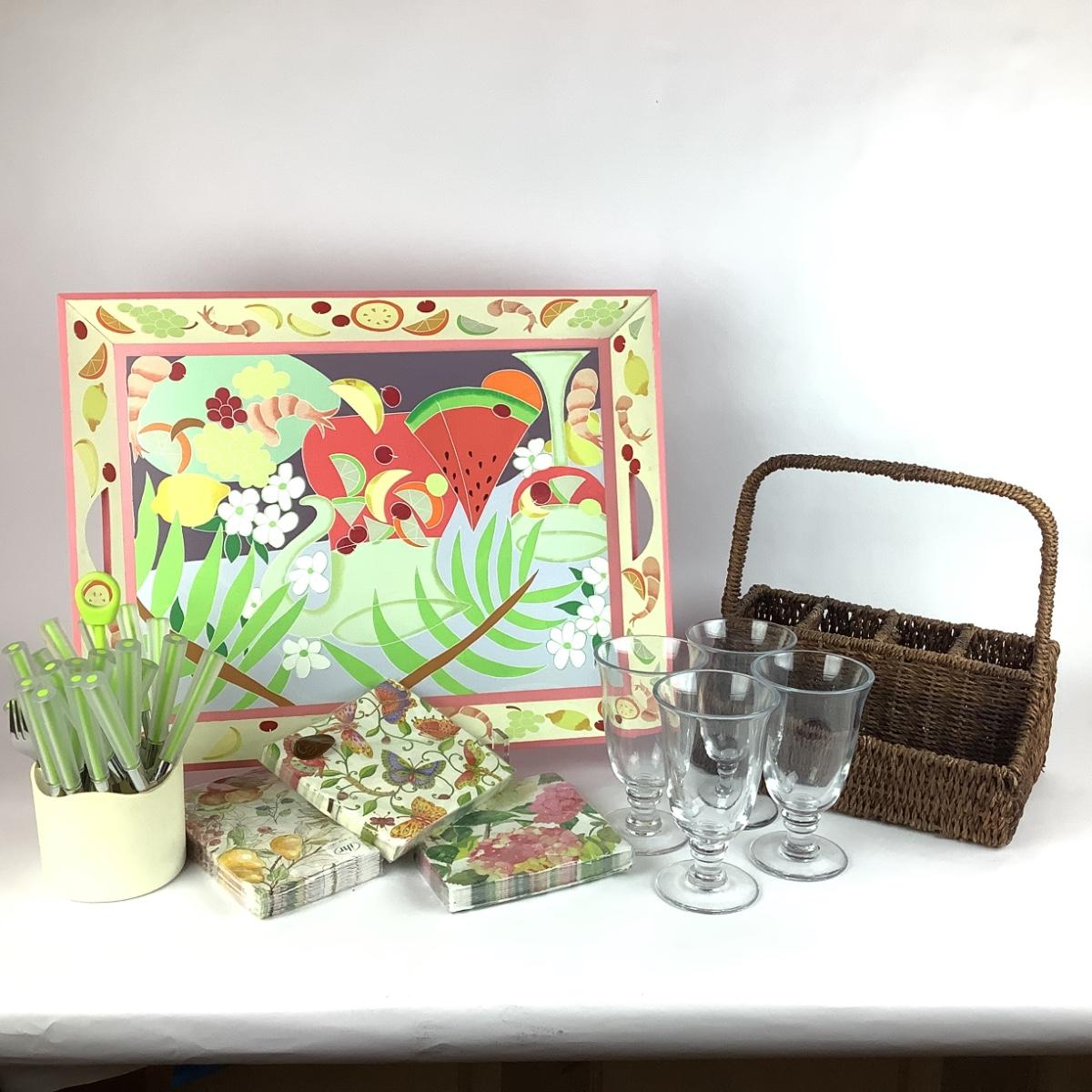 K746 Entertainment Lot: Wooden Serving Platter with Utensils, Ice tea Goblets, Napkins