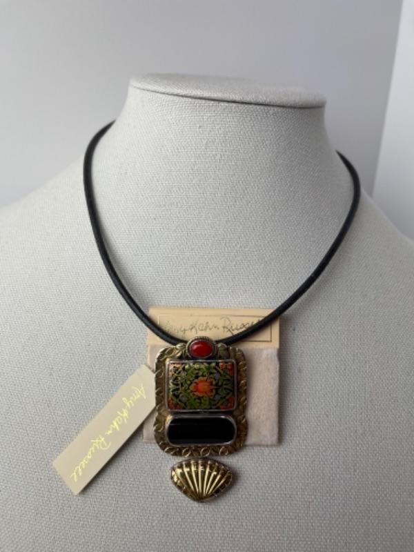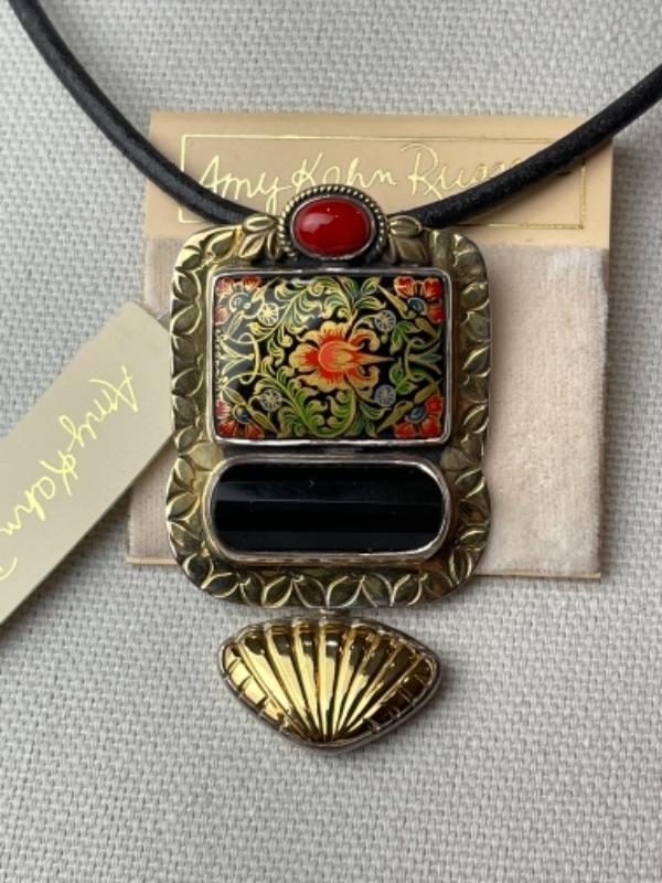 K768 14k Leather Handpainted Sterling Silver Necklace by Amy Kahn Russell