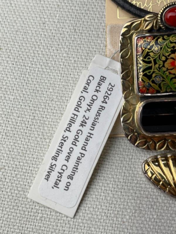 The pin pendant is Russian handpainting on black onyx, 24k gold over crystal, coral , gold filled , sterling silver on a black leather 16” necklace with 14k yellow gold clasp
