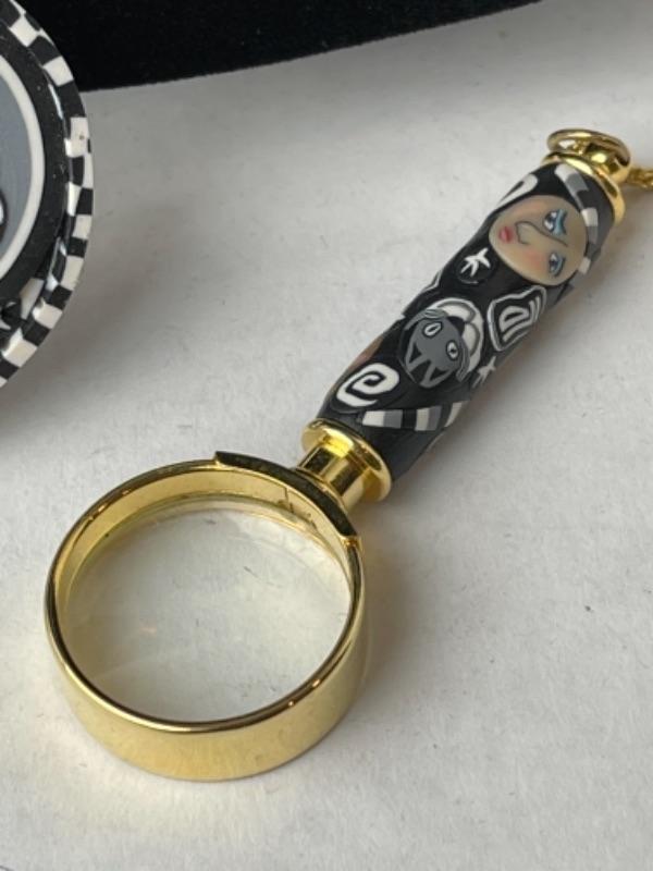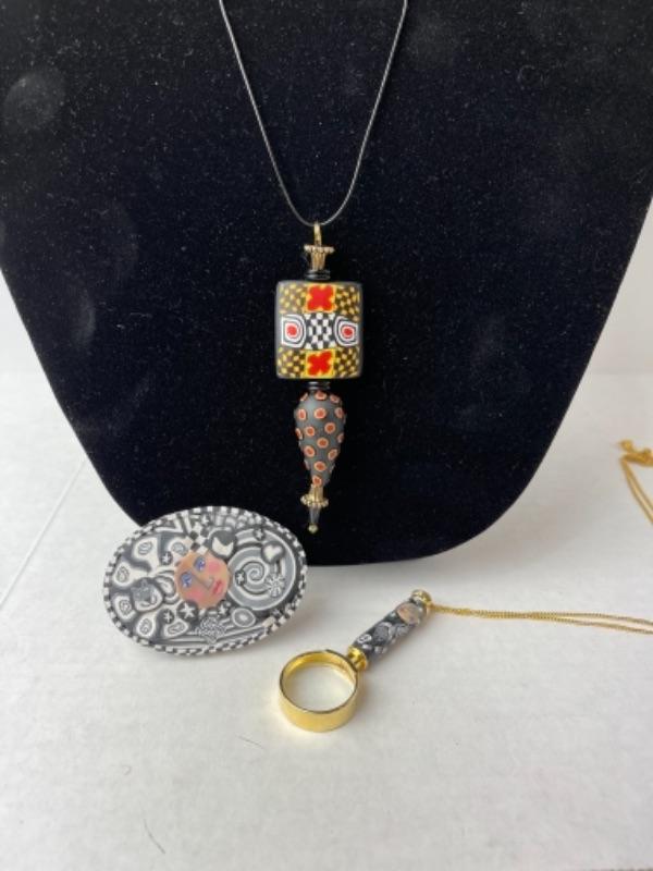 Clay necklace is on plastic sting and measures 30” long the clay handle magnifying pendant measures 26” long and the pin is signed LD and measures 2.75” x 2” tall