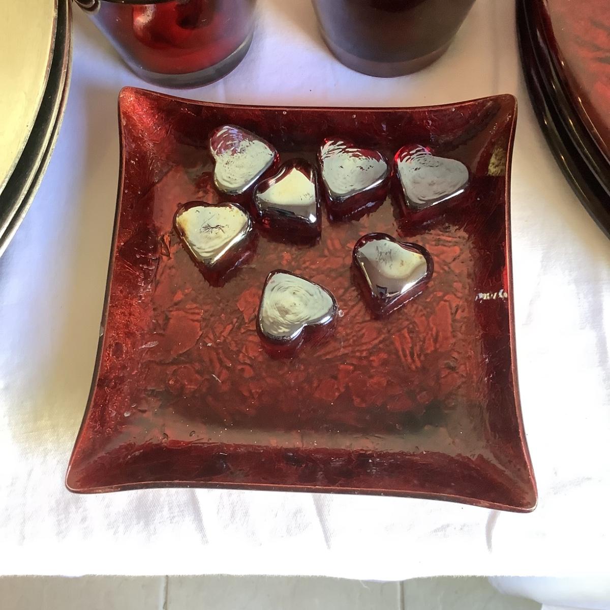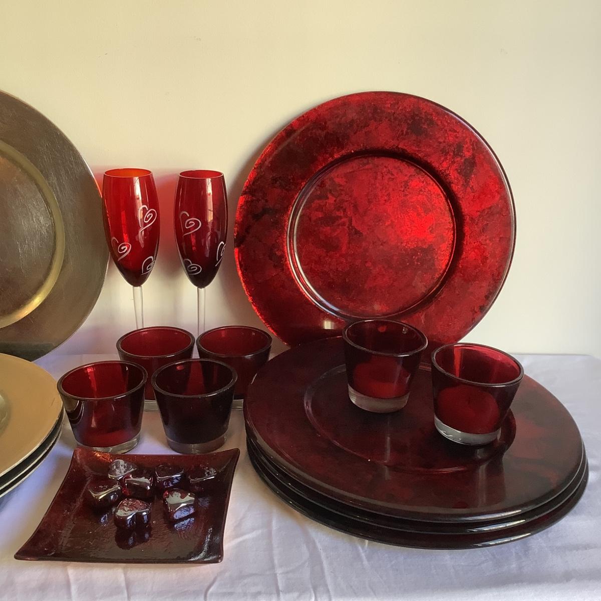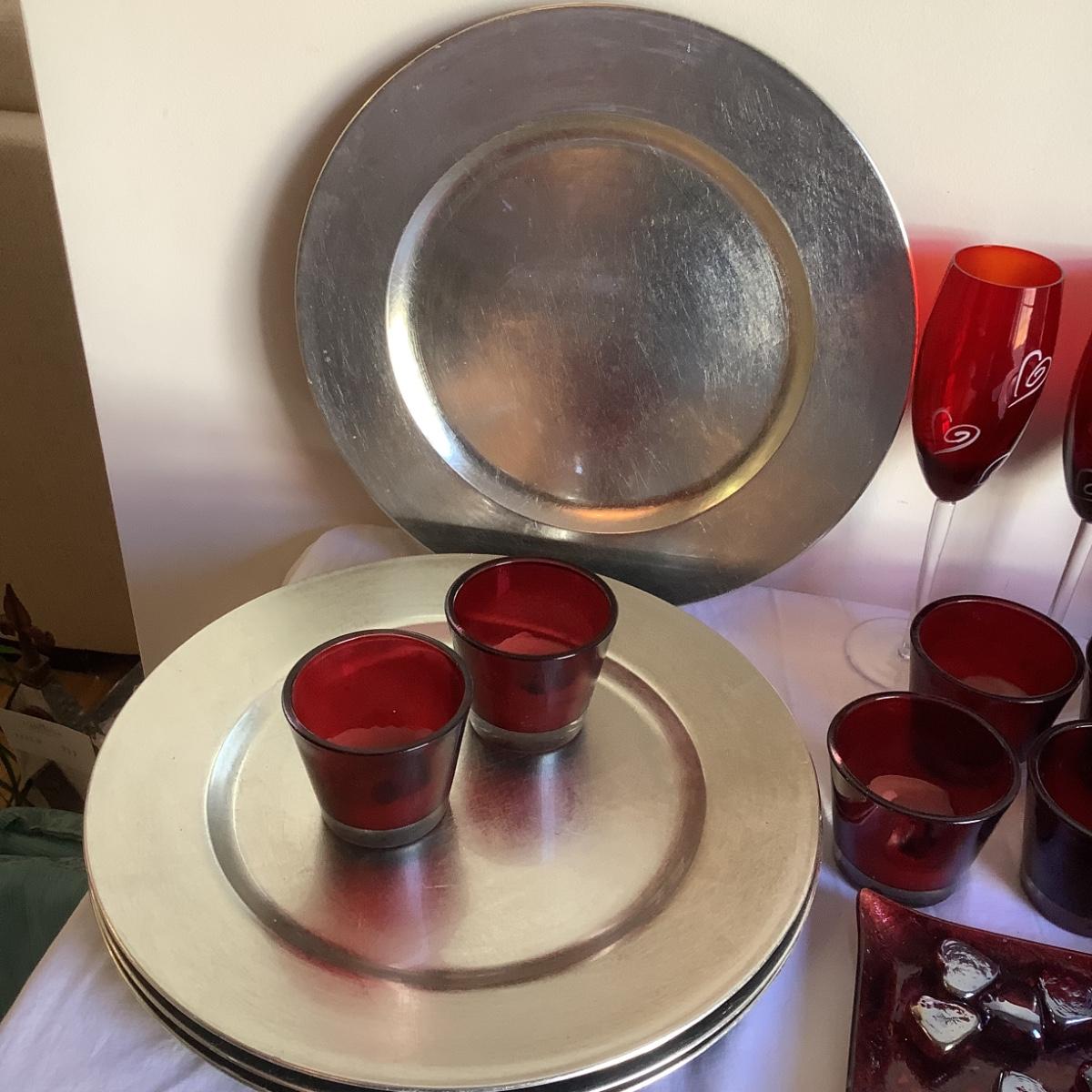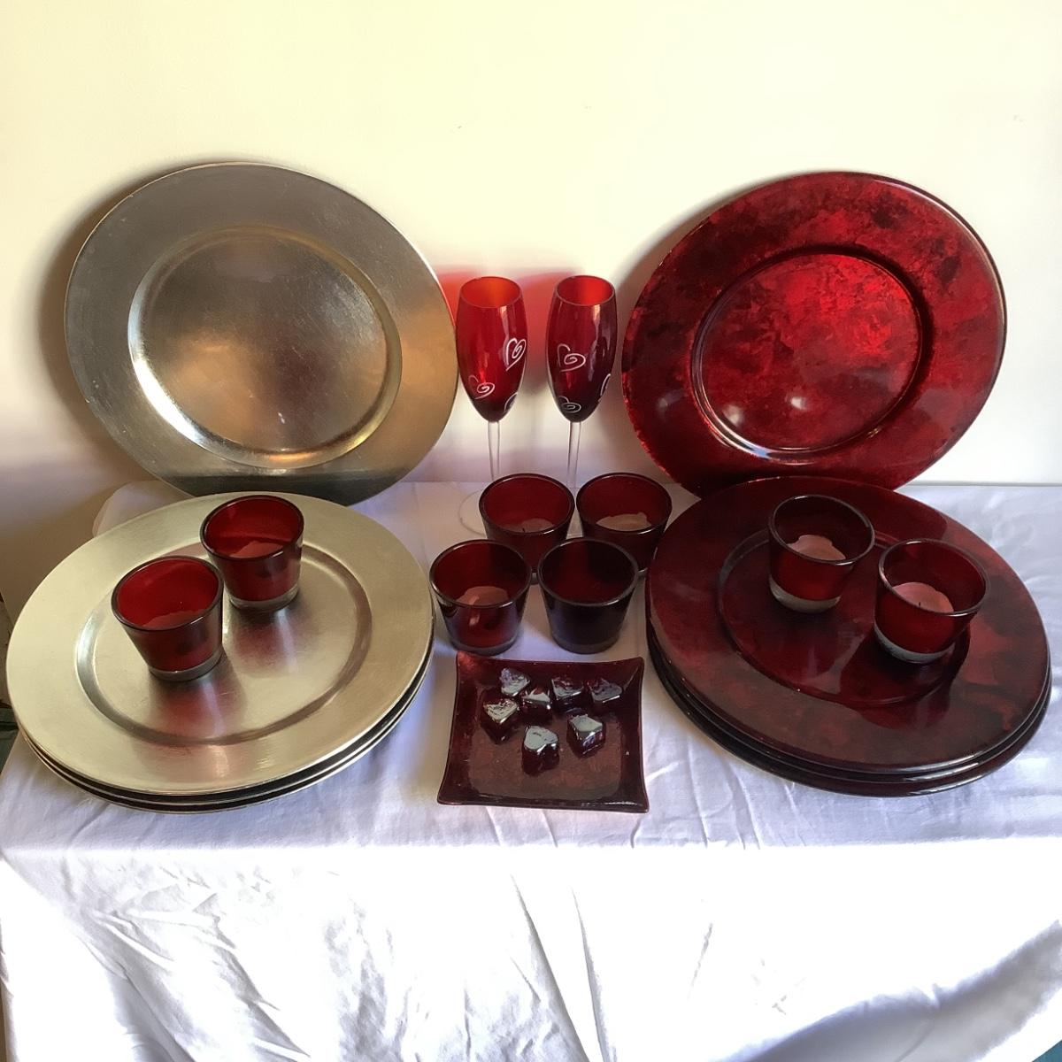 Included are 4 Silver-colored plates, 2 heart designed champagne glasses, 8 candle glasses, 1 red square dish, and 4 Red glass plates.