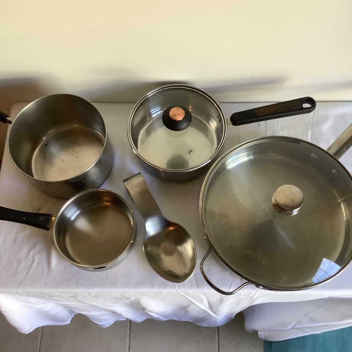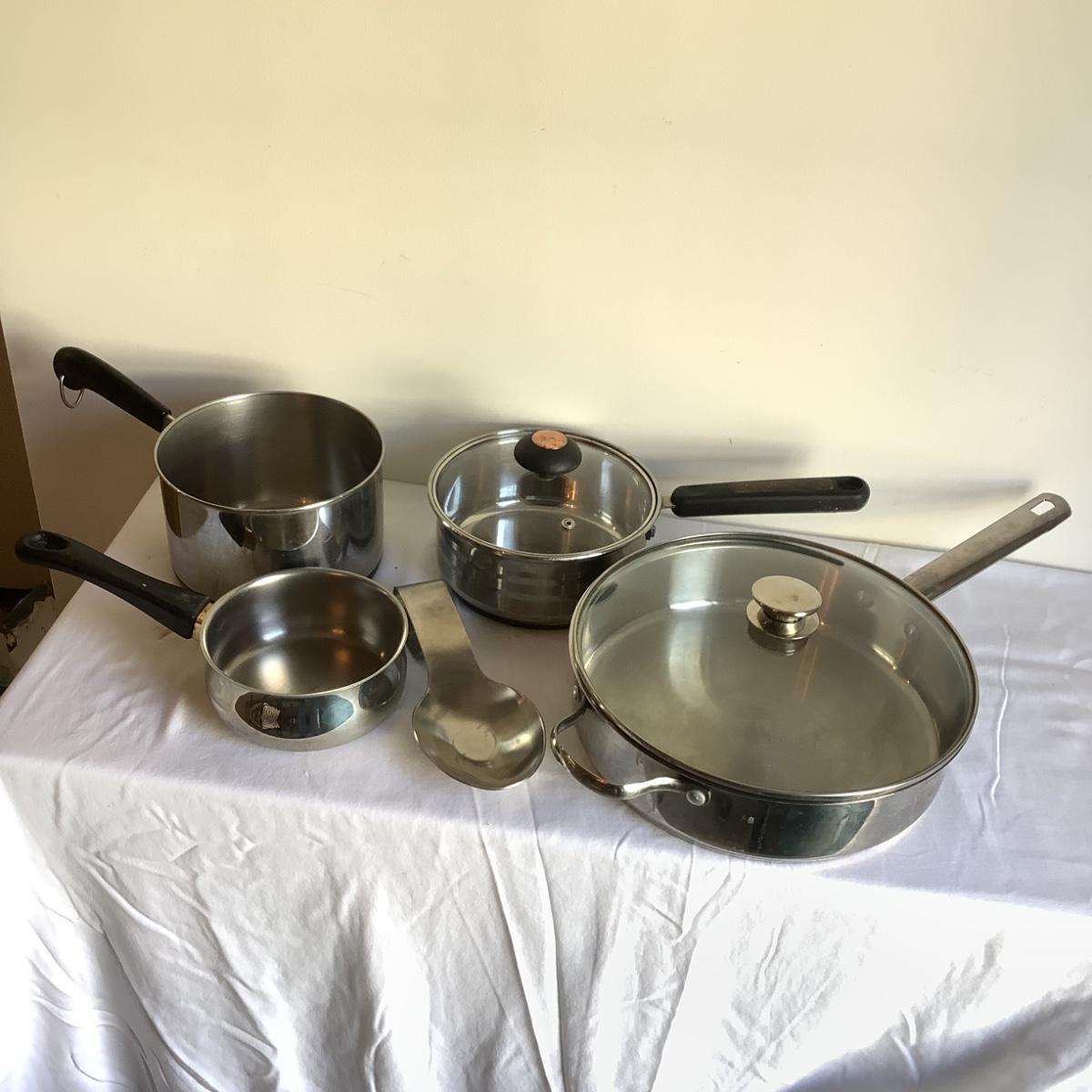 This lot includes one large stainless steel pot with lid, one medium stainless steel pot with lid, two small stainless steel saucepan, and one stainless steel slotted spoon rest.