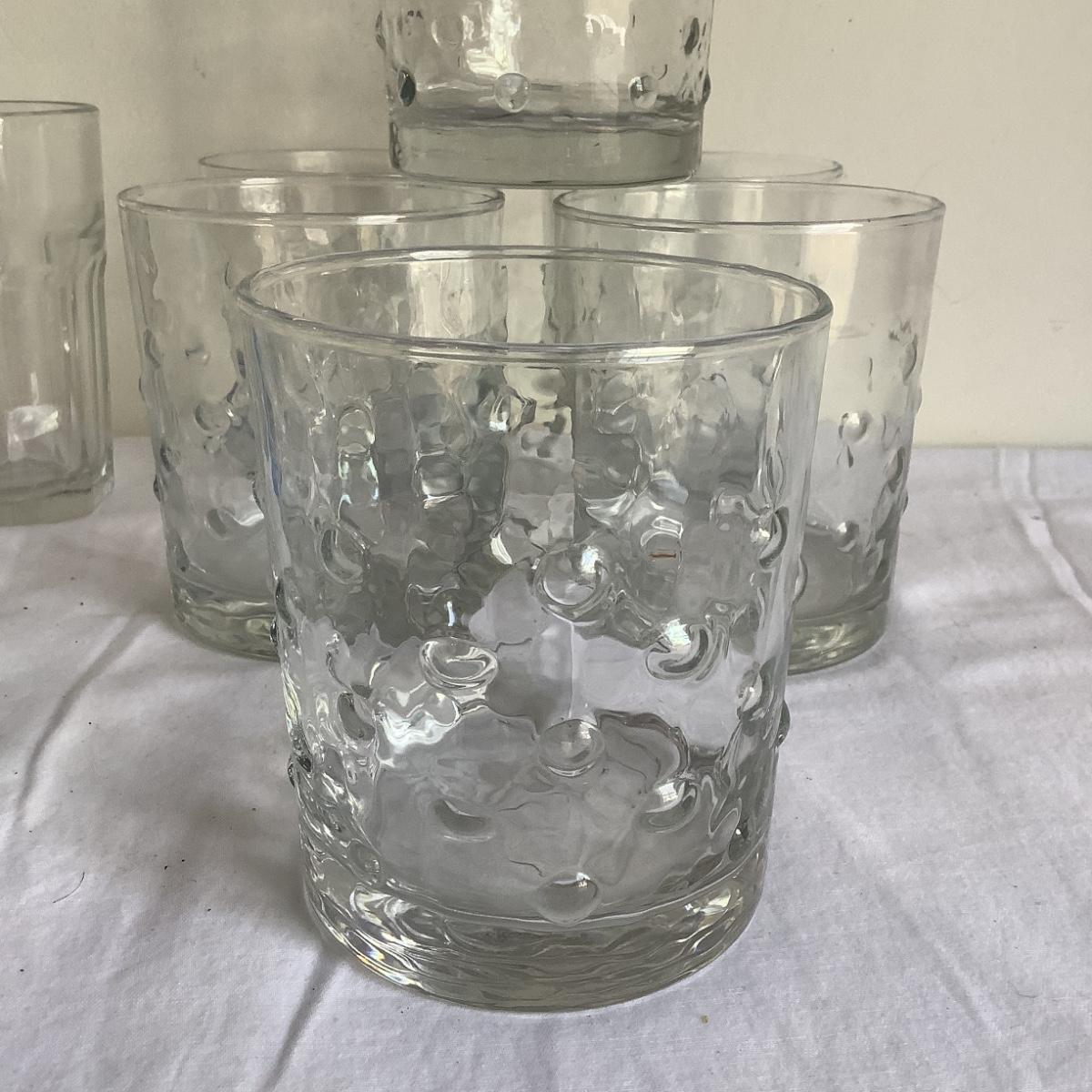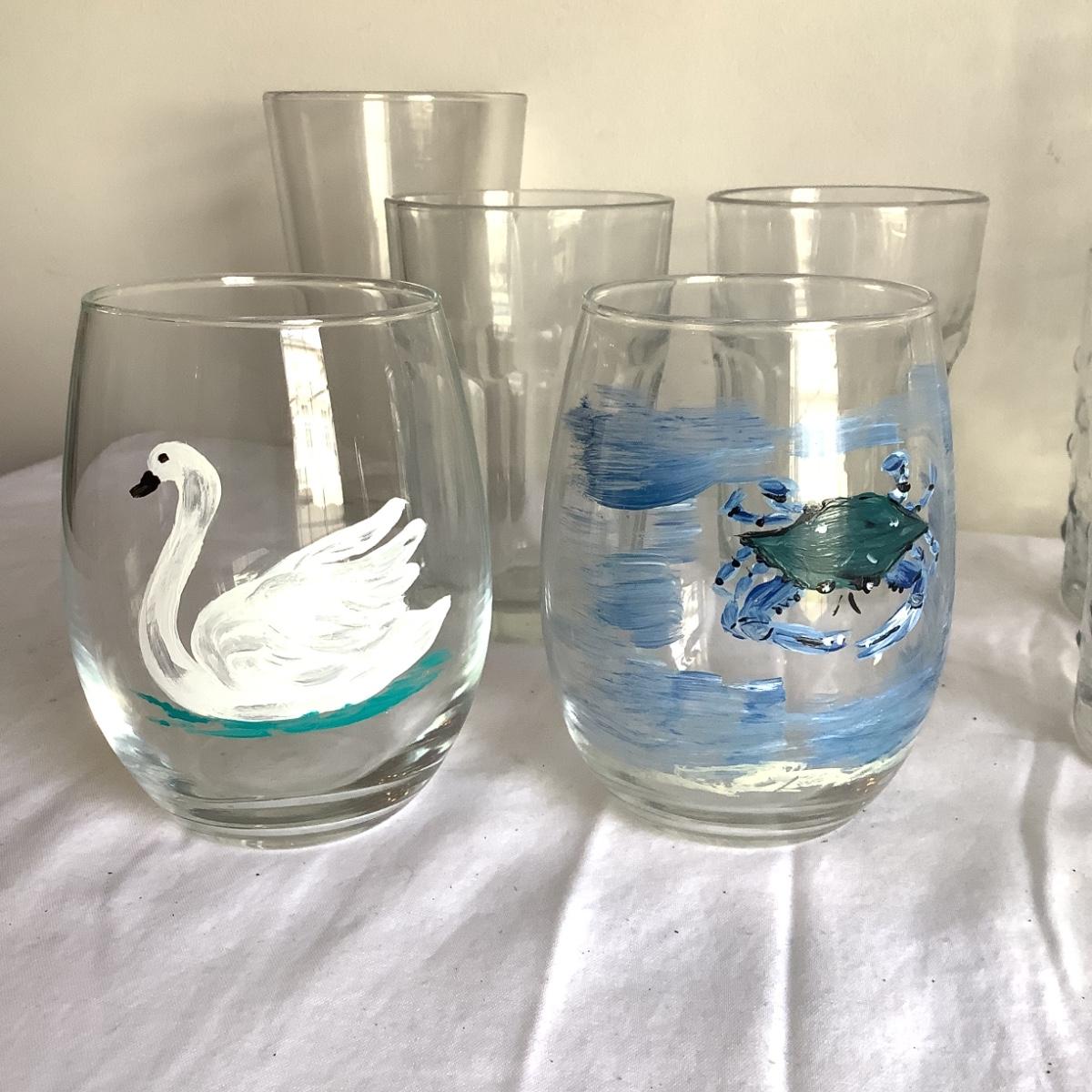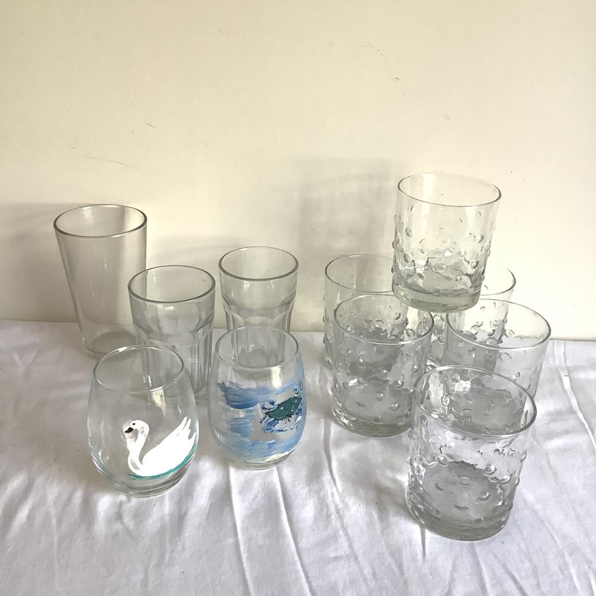 This assortment of glasses comes with, one tall clear vase-shaped glass, two textured glasses, one small round glass with hand painted swan, one small round glass with hand painted crab, and 6 bubbled-textured glasses.