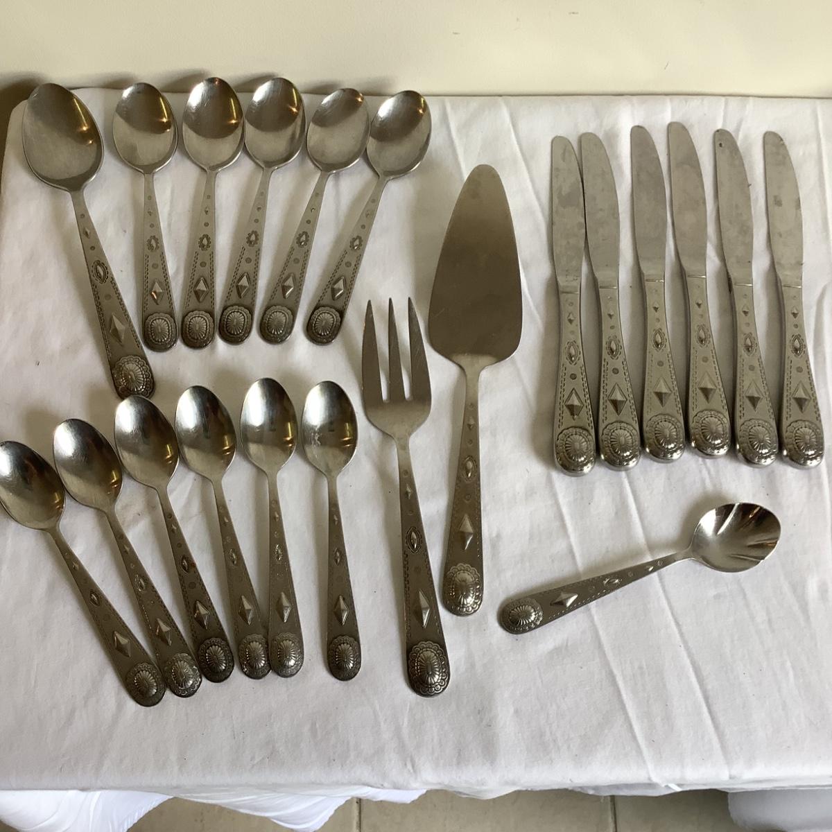 6 dinner spoons, 6 teaspoons, 6 dinner knives, 1 serving fork, 1 cake/pie server, and 1 small serving spoon.
