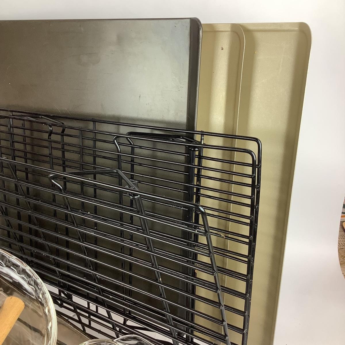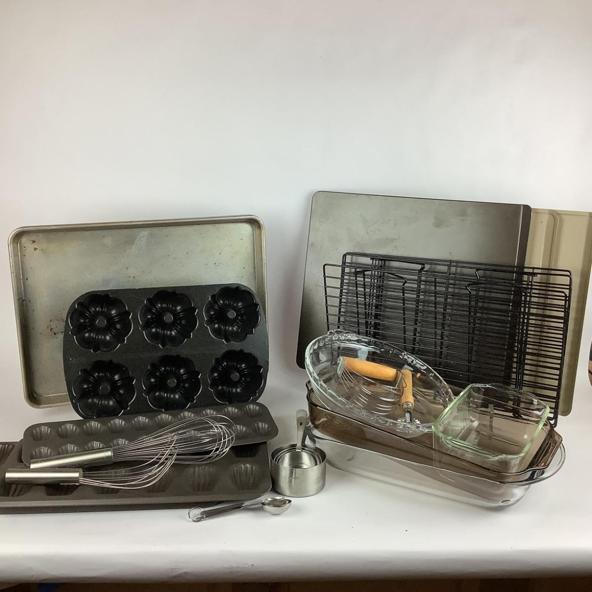 K816 Lot of Baking Sheet, Cooling Rack, and Pyrex Bowls