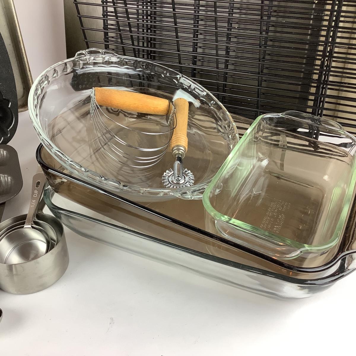 Pyrex bowls, measuring cups , pie and mixers, cooling racks and more