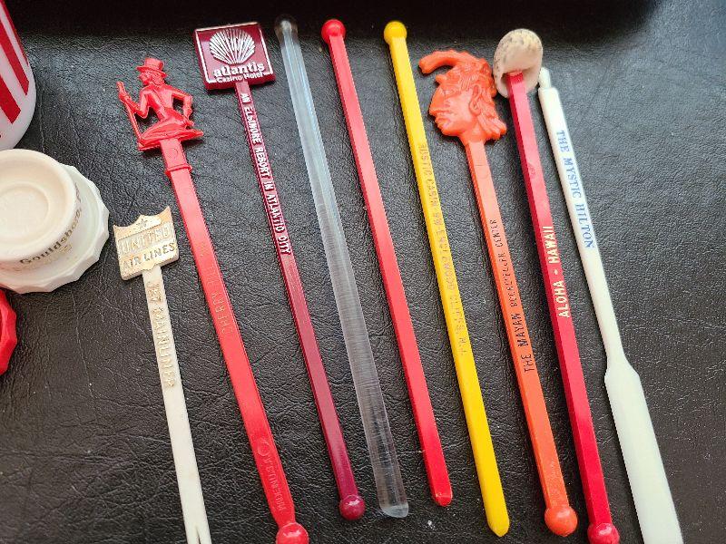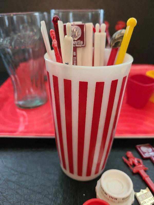 Fun Vintage Stir Sticks and striped milk glass! This is a fun lot for serving drinks! Please see all pictures for exact contents of the lot, condition of the items, and if measurements if taken. Thank you for looking and have fun bidding.