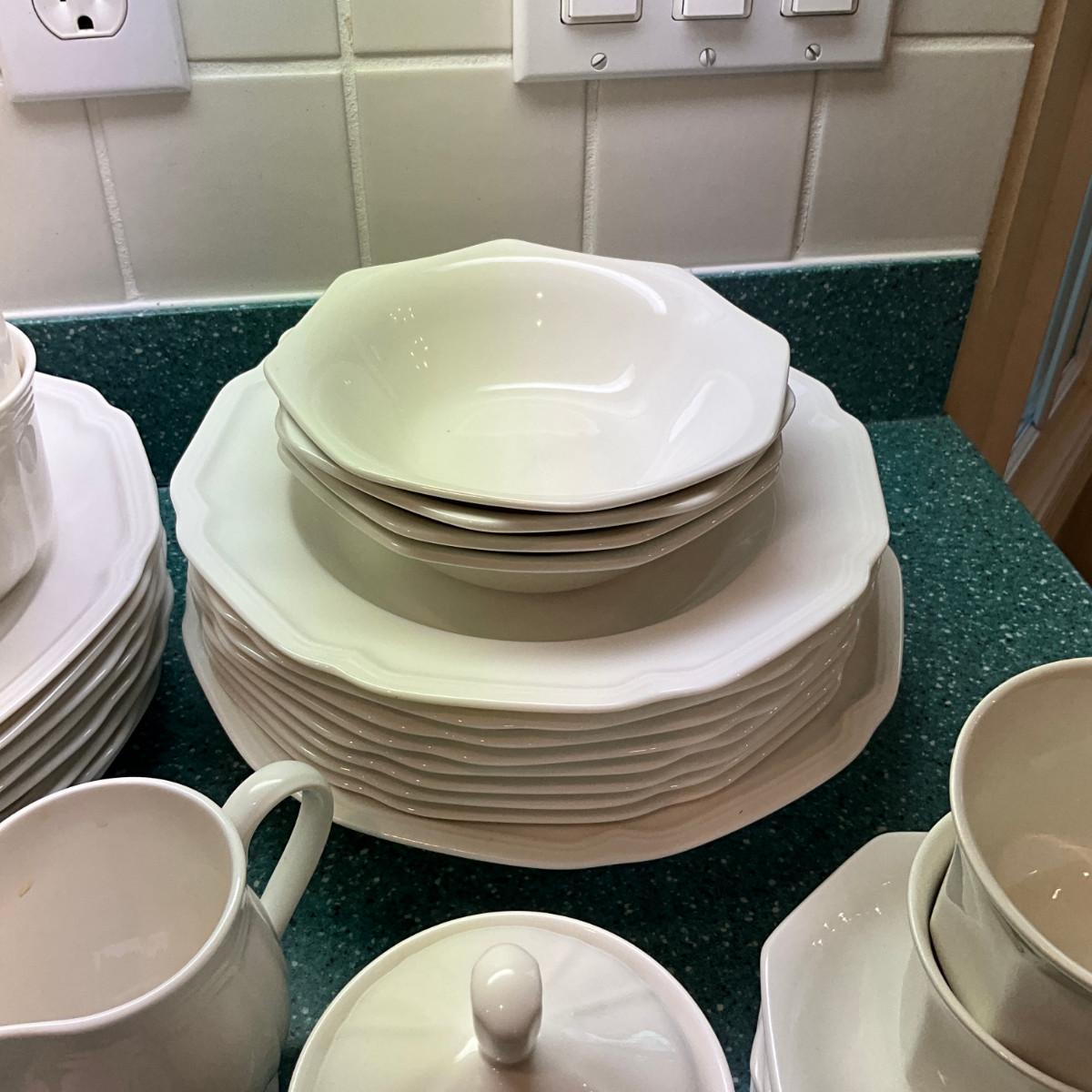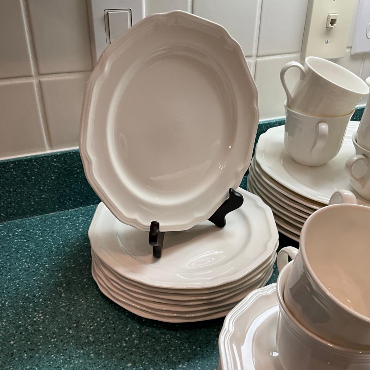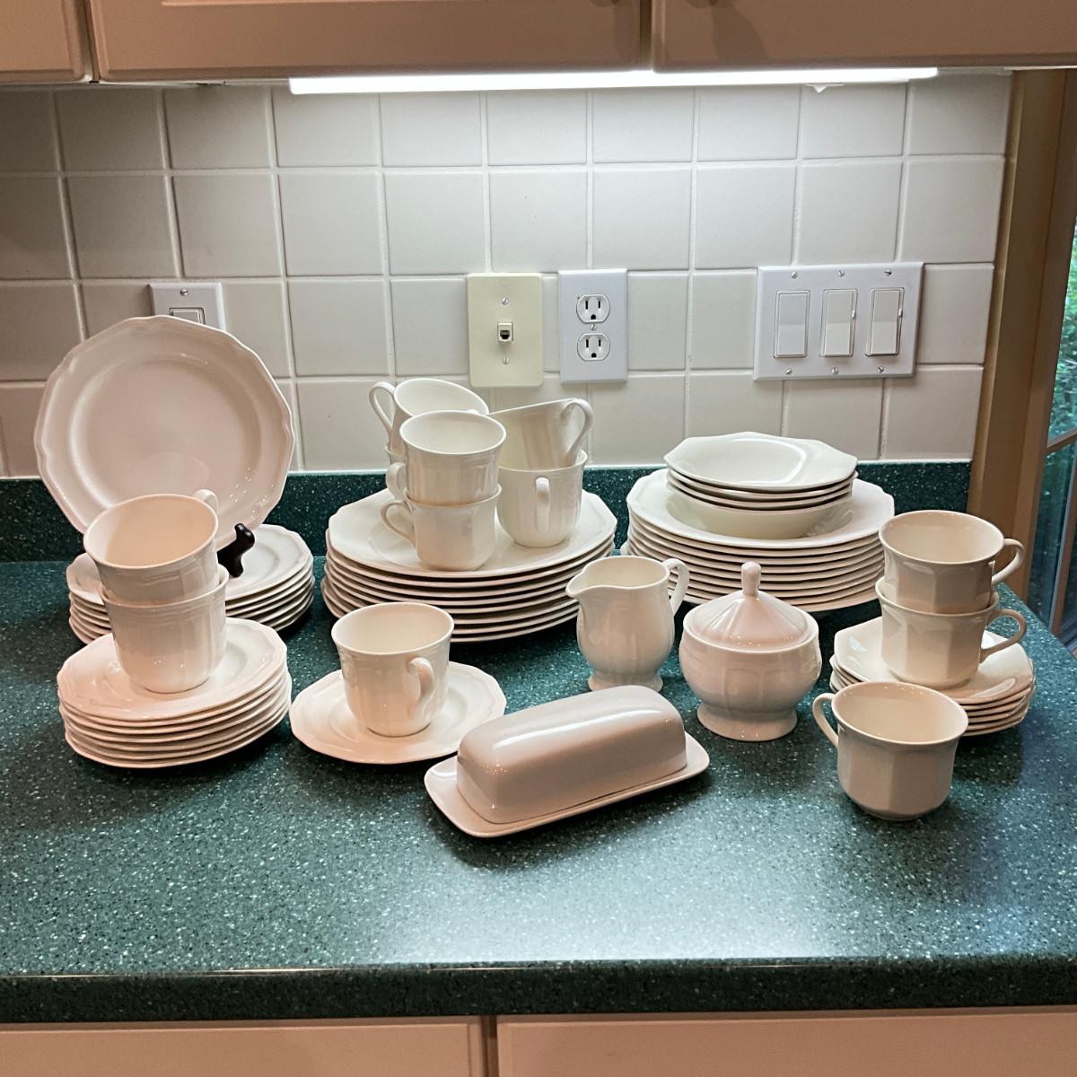 8 Saucers, 9 tea cups, 8 salad plates, 8 dinner plates, 8 rimmed soup bowls, 1 serving bowl