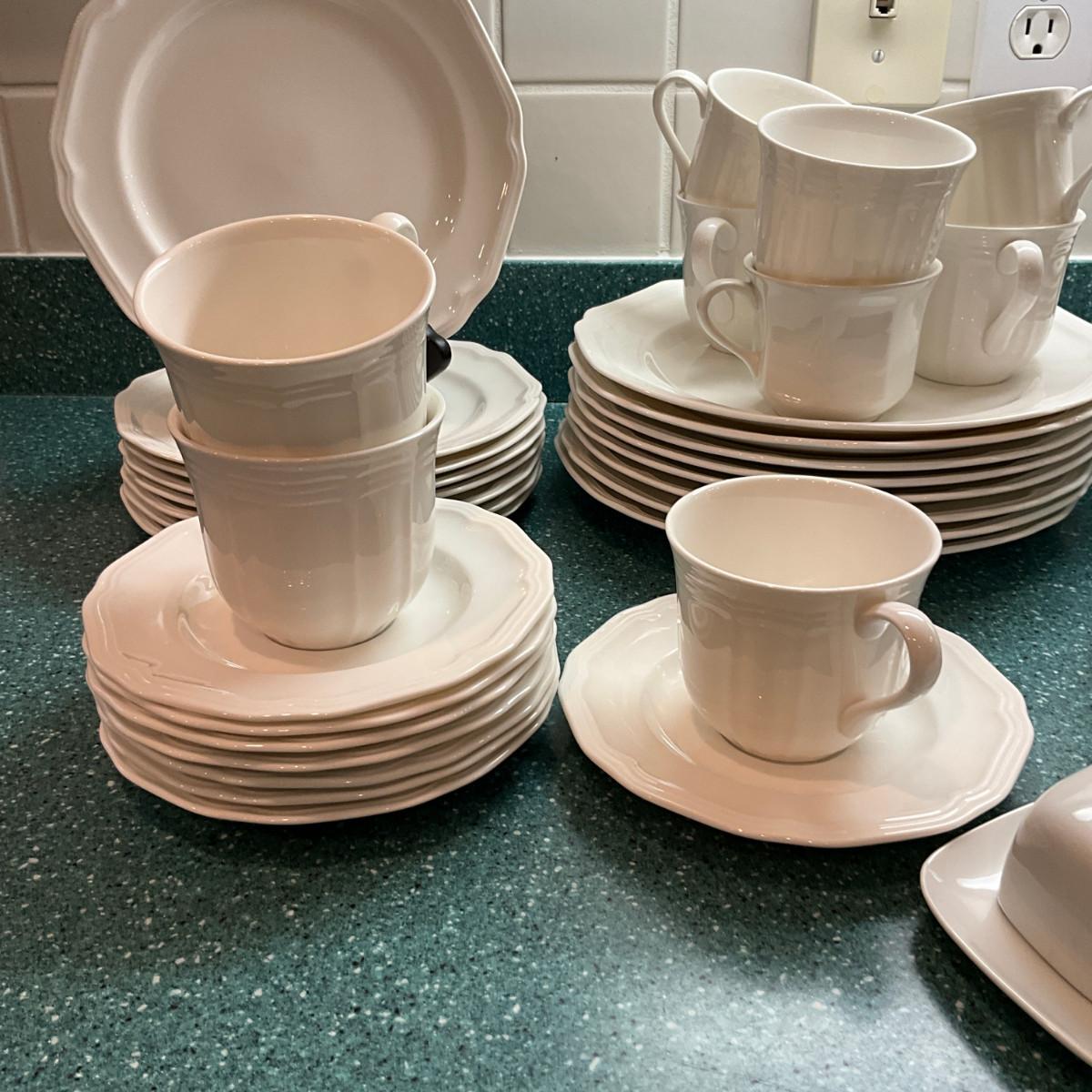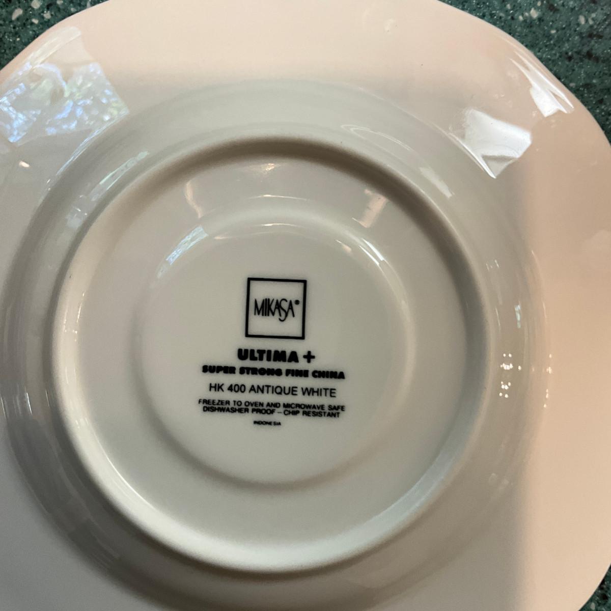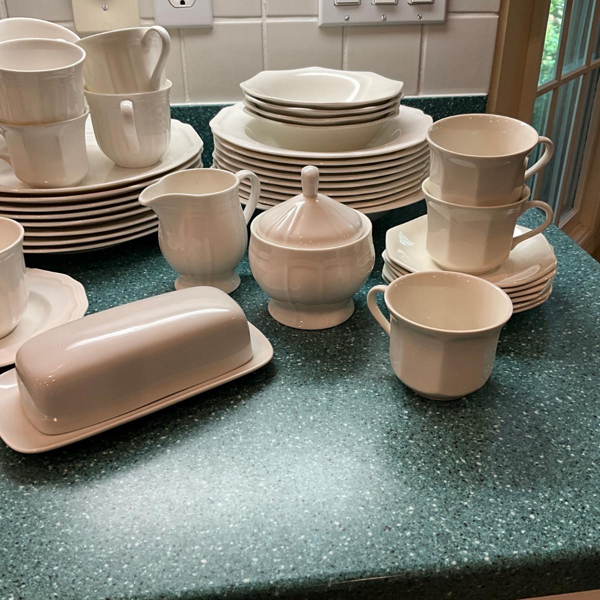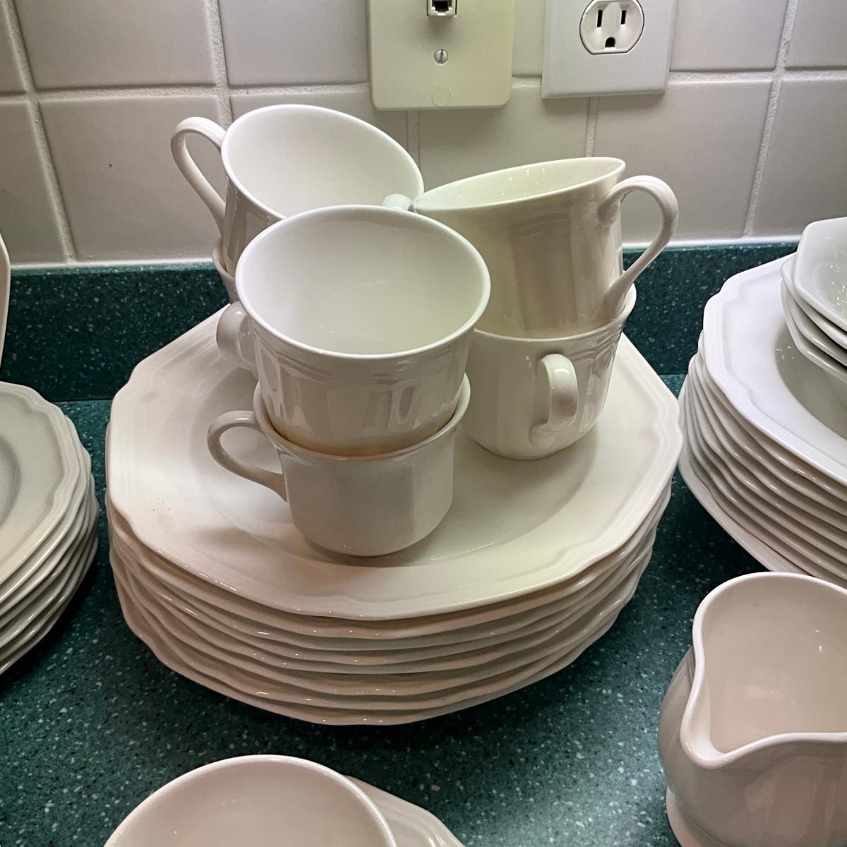 8 Saucers, 9 tea cups, 8 salad plates, 8 dinner plates, 8 rimmed soup bowls, 1 serving bowl