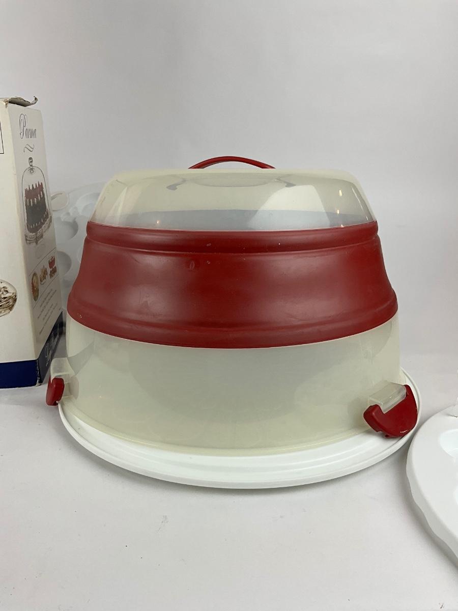 In box glass dome cake plate and cover, with two tier plastic carrier and collapsible.
