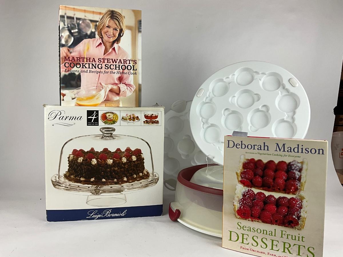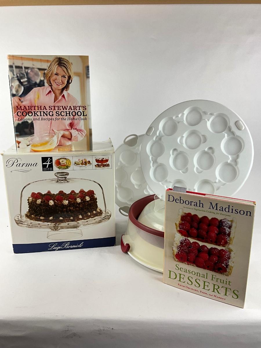 K843 Glass Cake Cover with Plastic 2-Tier Cake Carrier and Baking Cookbooks