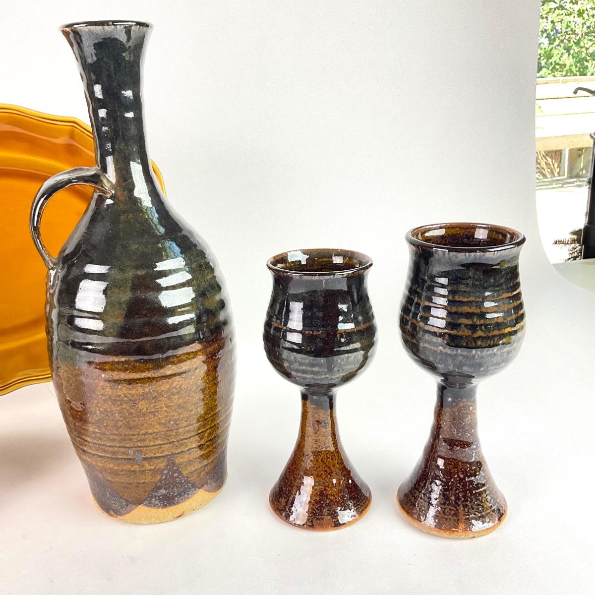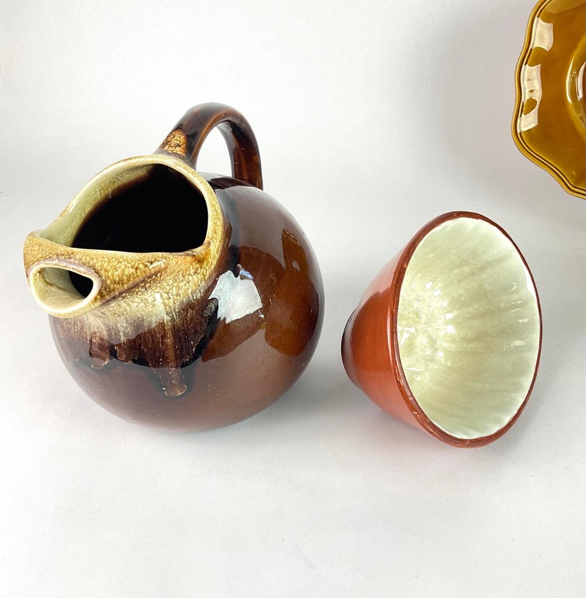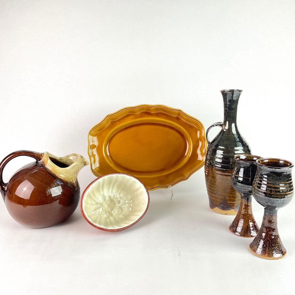 This lot comes included with hull pottery brown drip pitcher, 2 goblets stoneware, stoneware vase, stoneware flower mold. Luneville Louis XV honel platter.