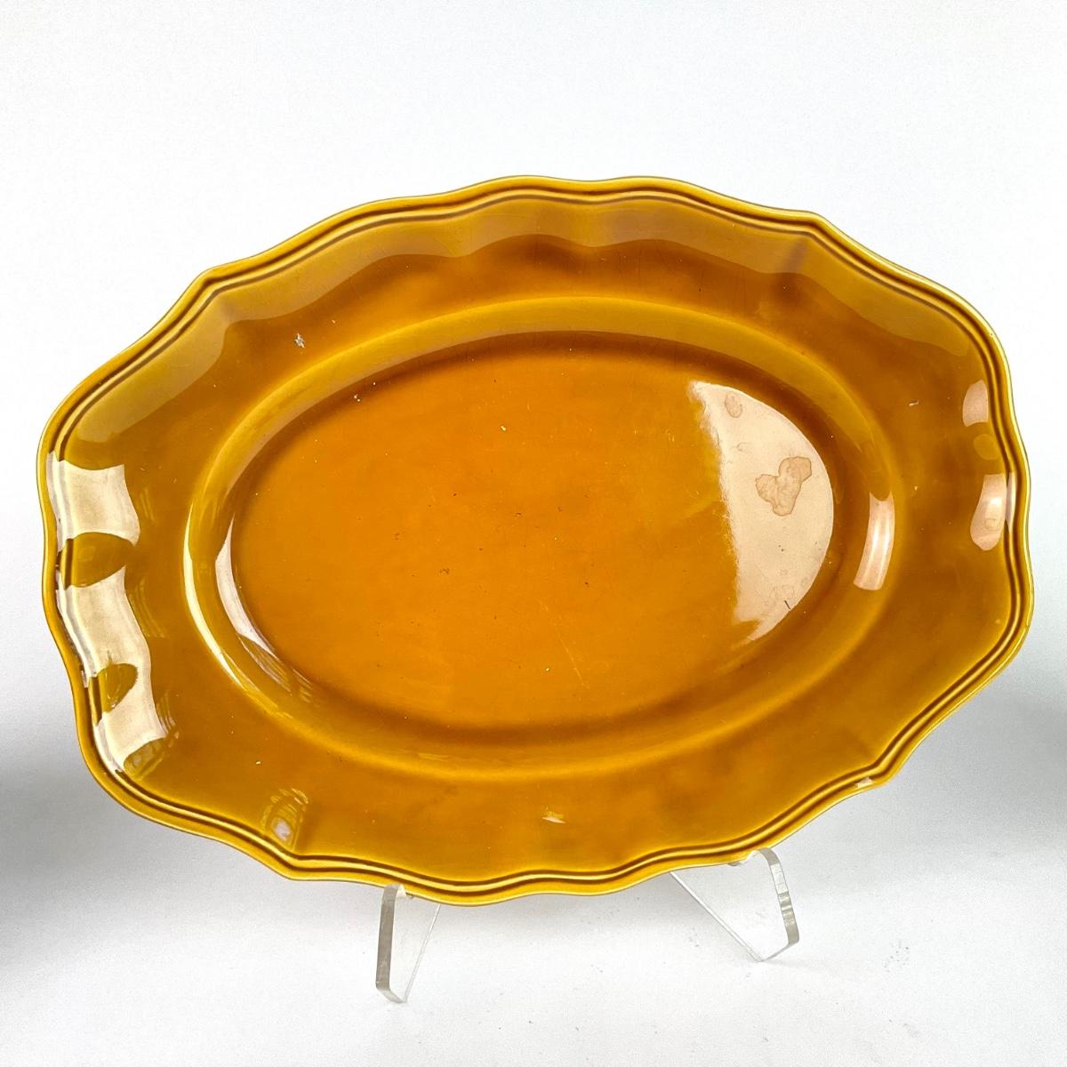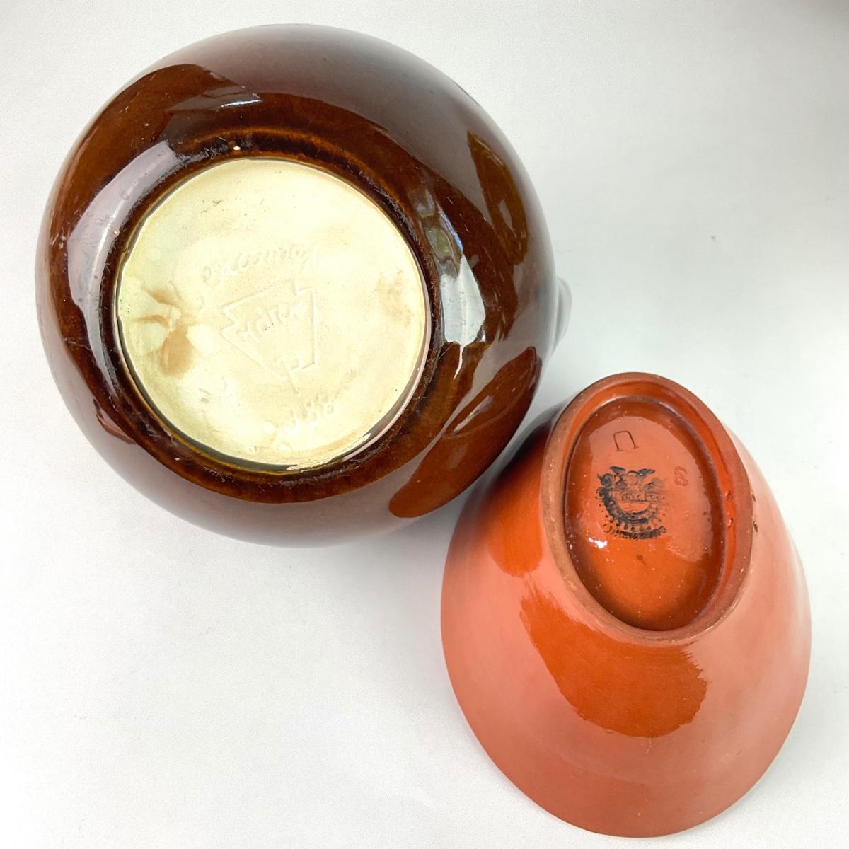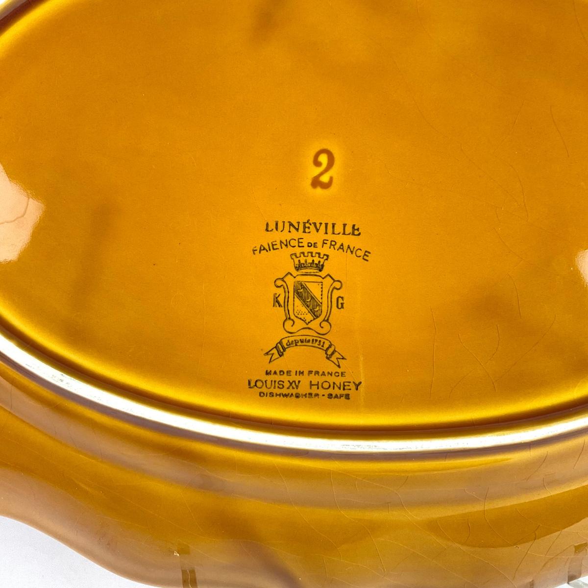 This lot comes included with hull pottery brown drip pitcher, 2 goblets stoneware, stoneware vase, stoneware flower mold. Luneville Louis XV honel platter.