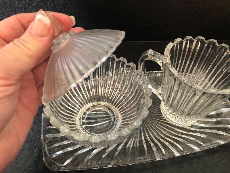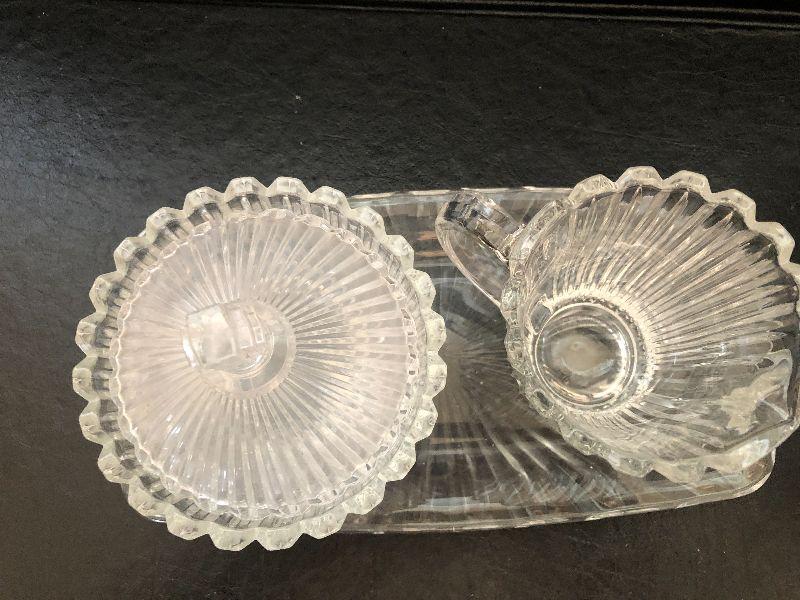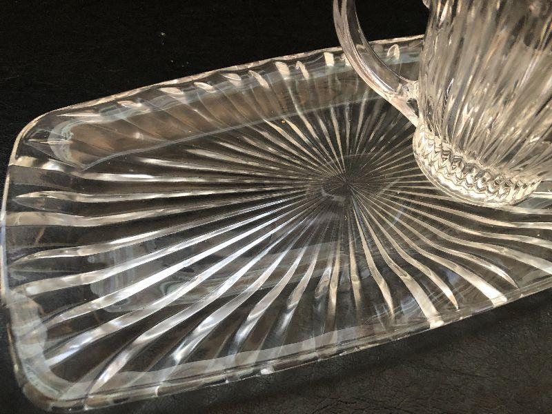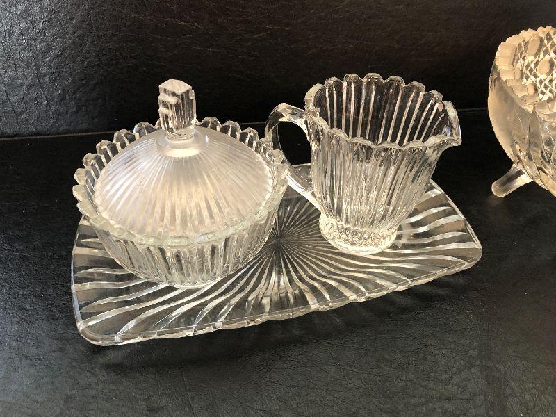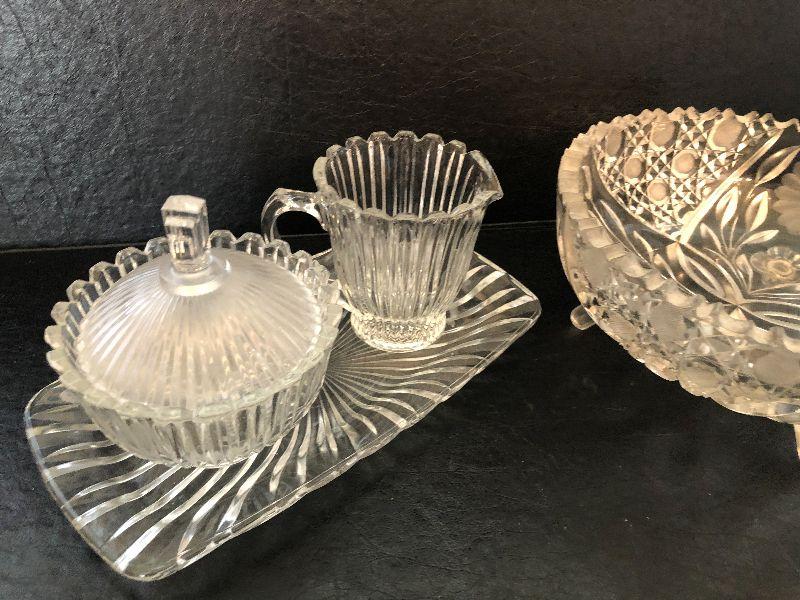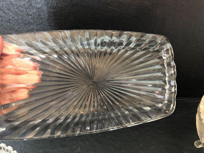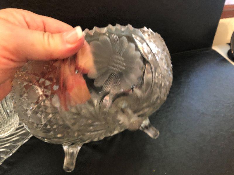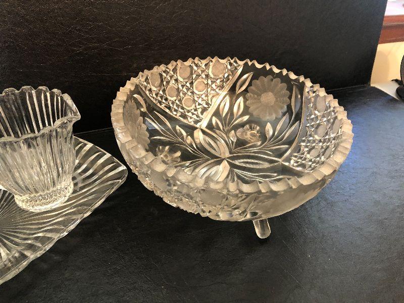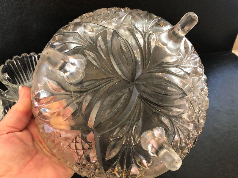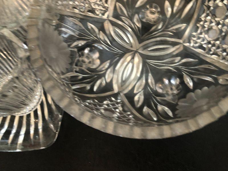 Nice lot of cut glass for serving. Please see all pictures for exact contents of the lot, condition of the items, and if measurements if taken. Thank you for looking and have fun bidding.