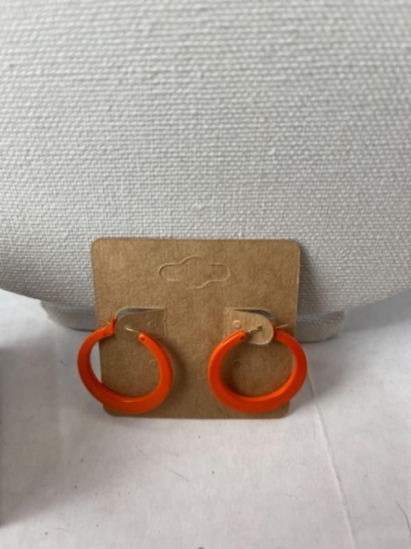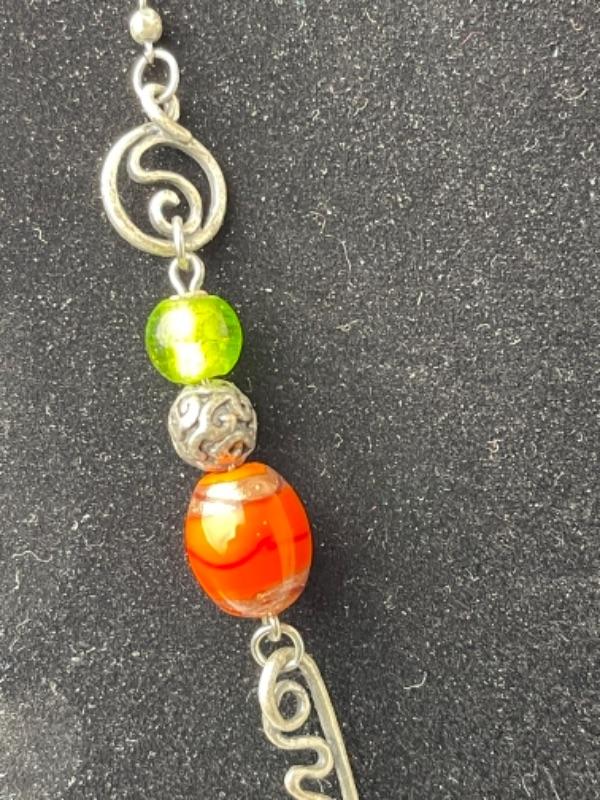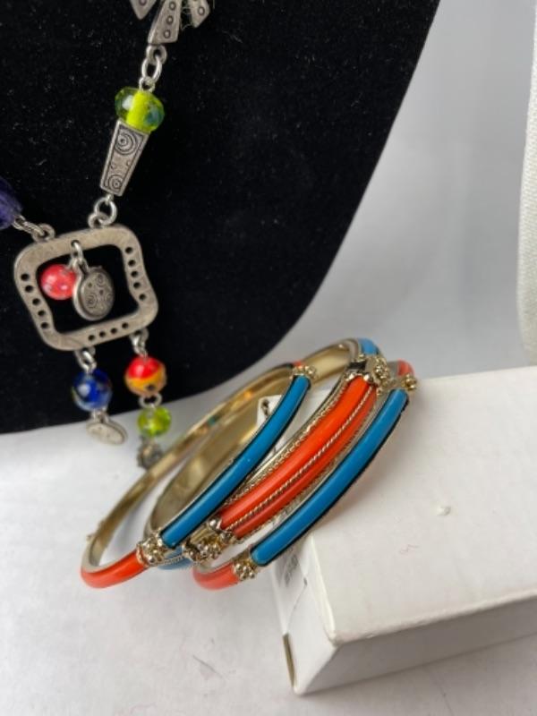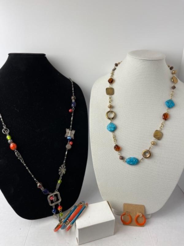 One beaded Silver Town Necklace by Chicos with three turquoise and orange colored slip on bangles one pair of orange pierced earrings and one turquoise gold tone style Necklace