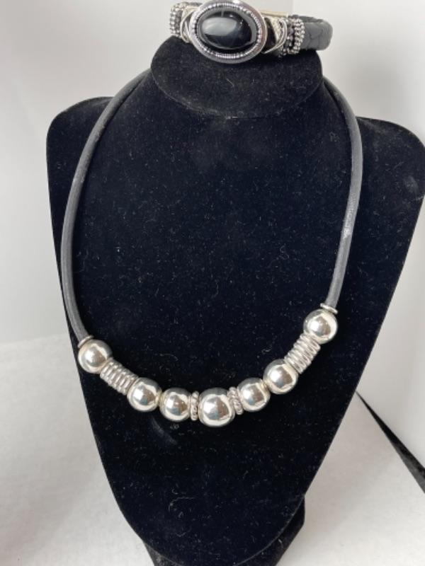 Necklace is marked sterling with leather