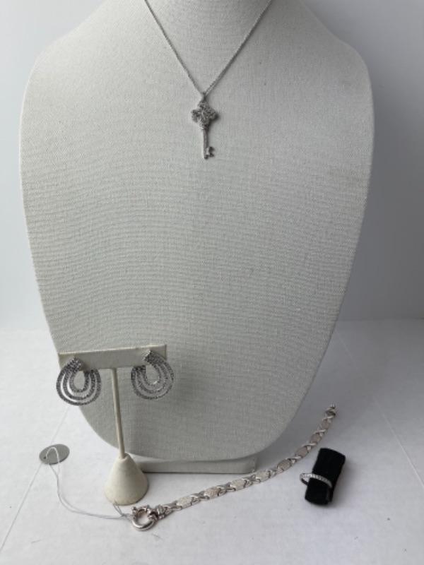 Necklace is 17” long , bracelet is 7” long earrings are 1.5” long and the ring is an eternity band and measures Size 8