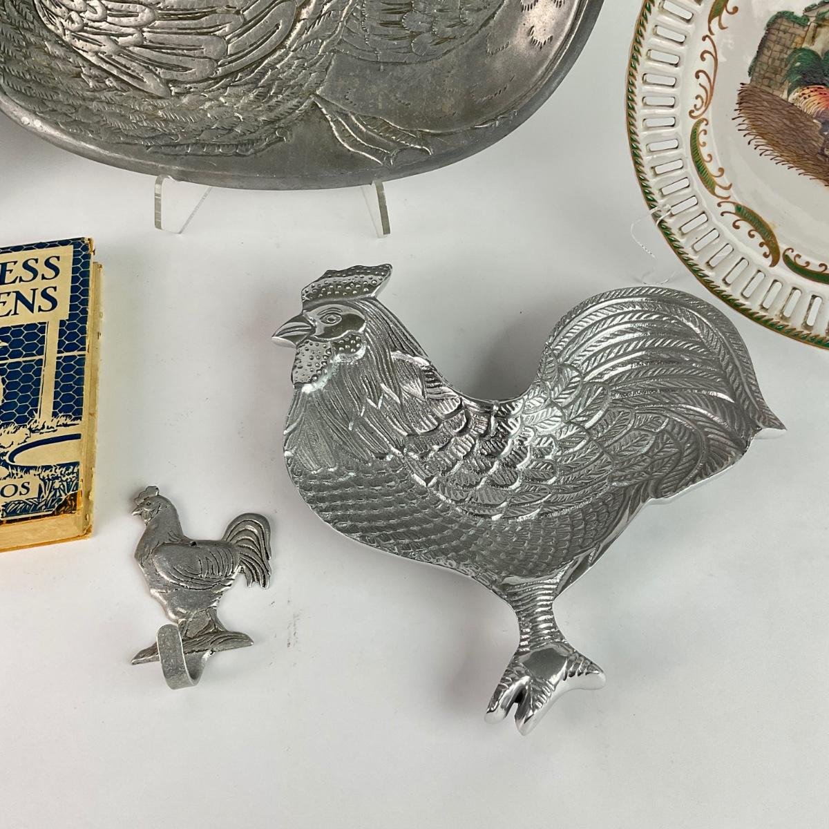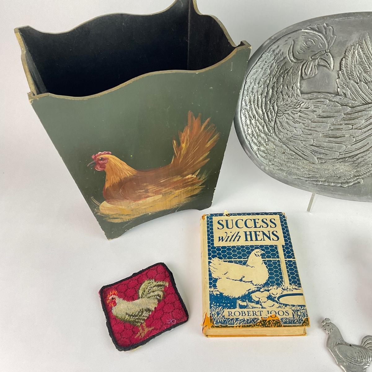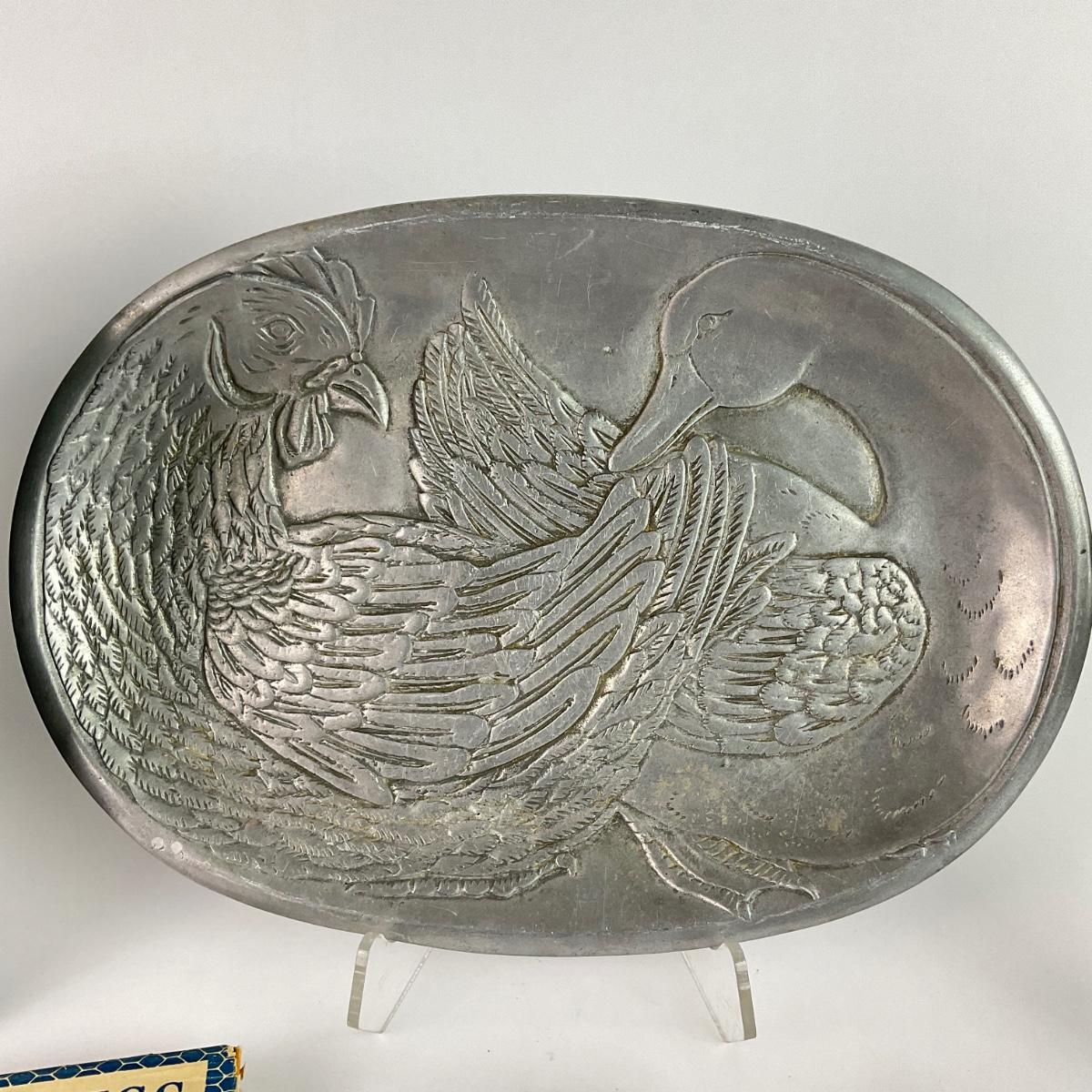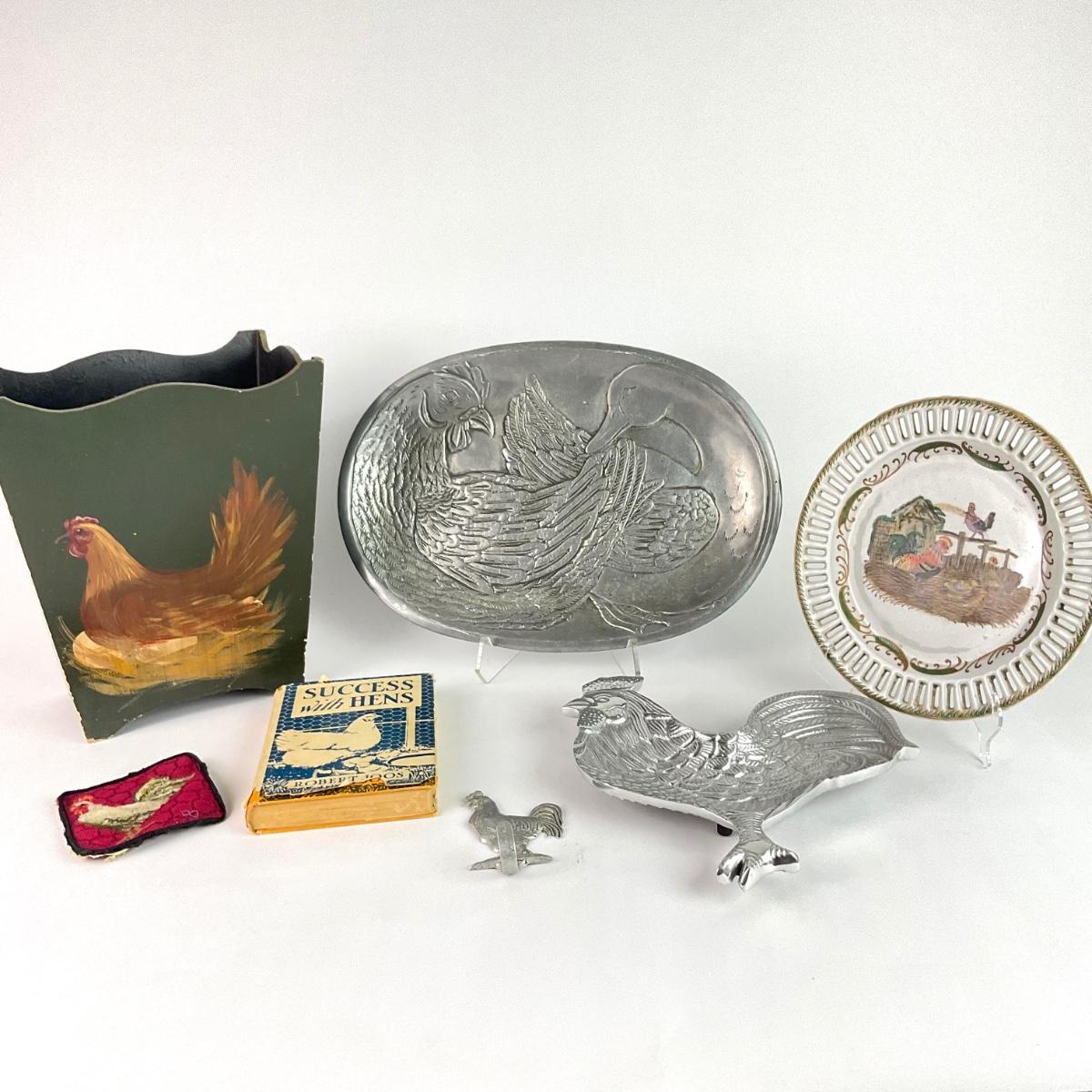 This lot includes 2 pewter trays, hand-painted in, one book, a needle point coaster, one coat hanger, one plate.