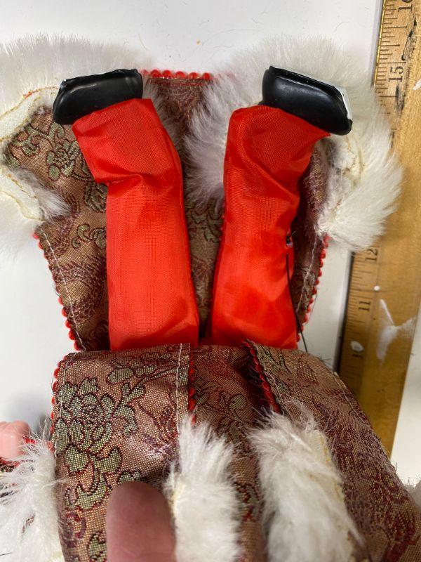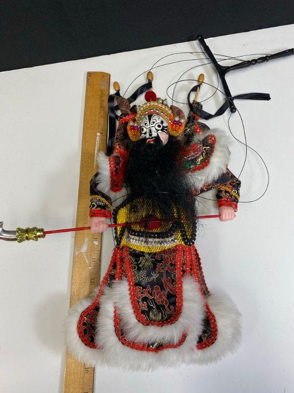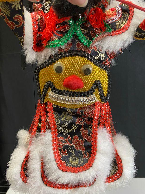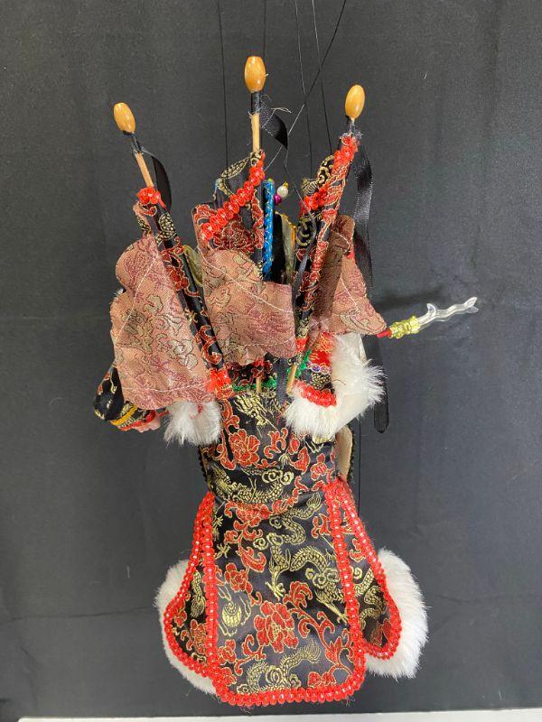 Vintage Kabuki Samurai warrior marionette. Asian string puppet, looks newer. He has a porcelain face but his hands, feet, strings, and weapons are plastic. Interesting costume has a googly eye face on the front. In good condition. Puppet measures about 15", total with strings is 22".