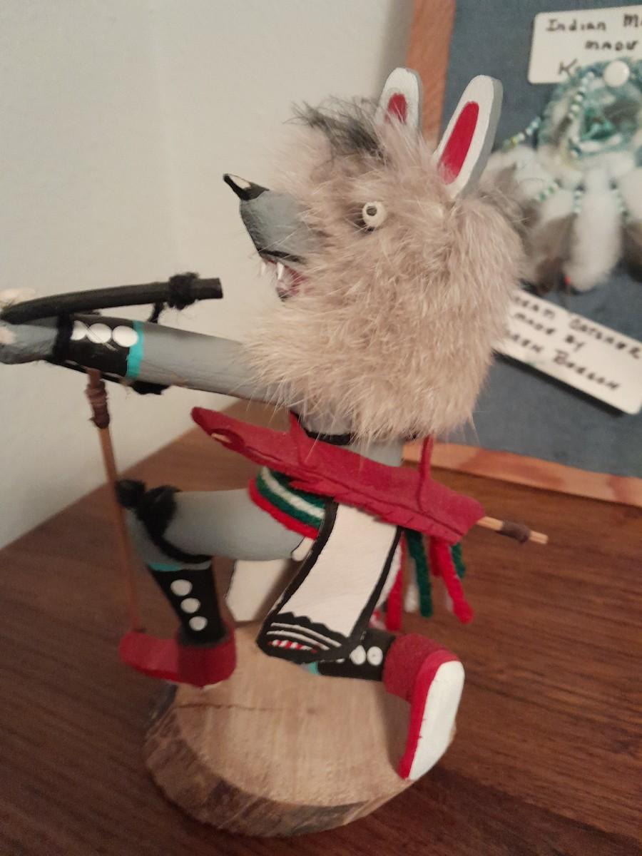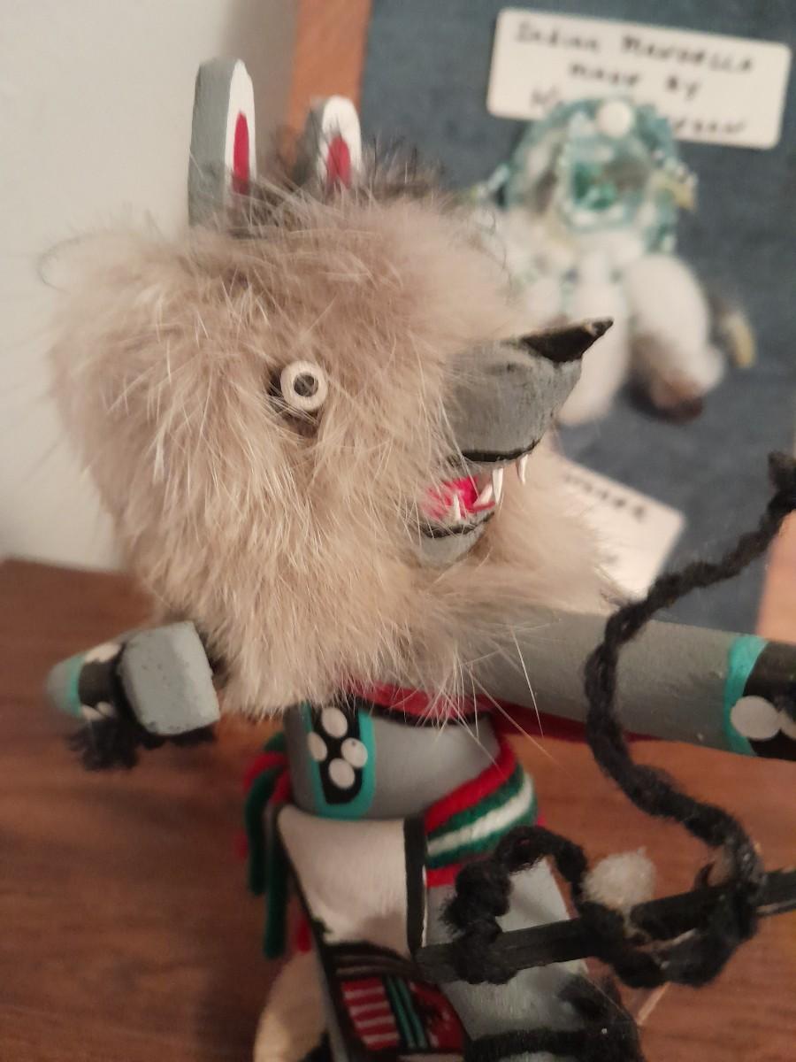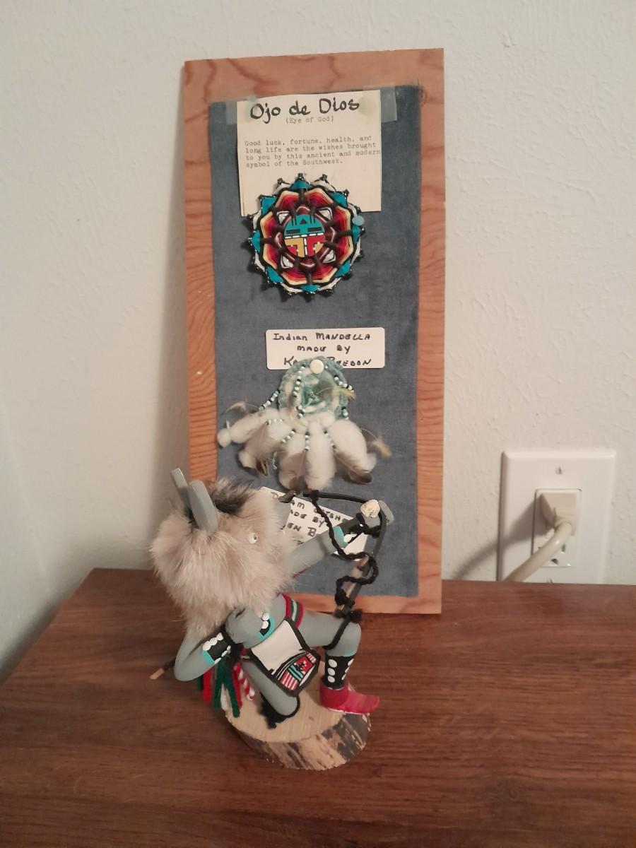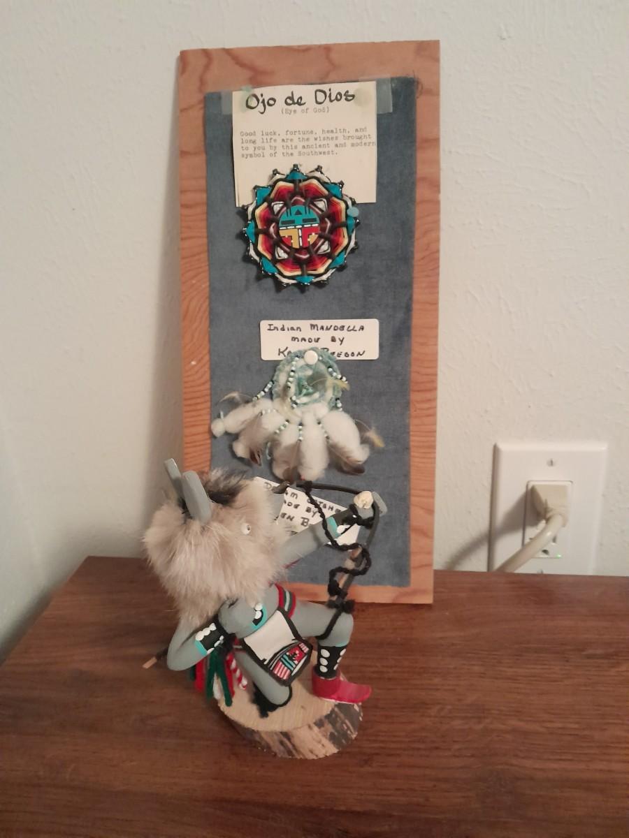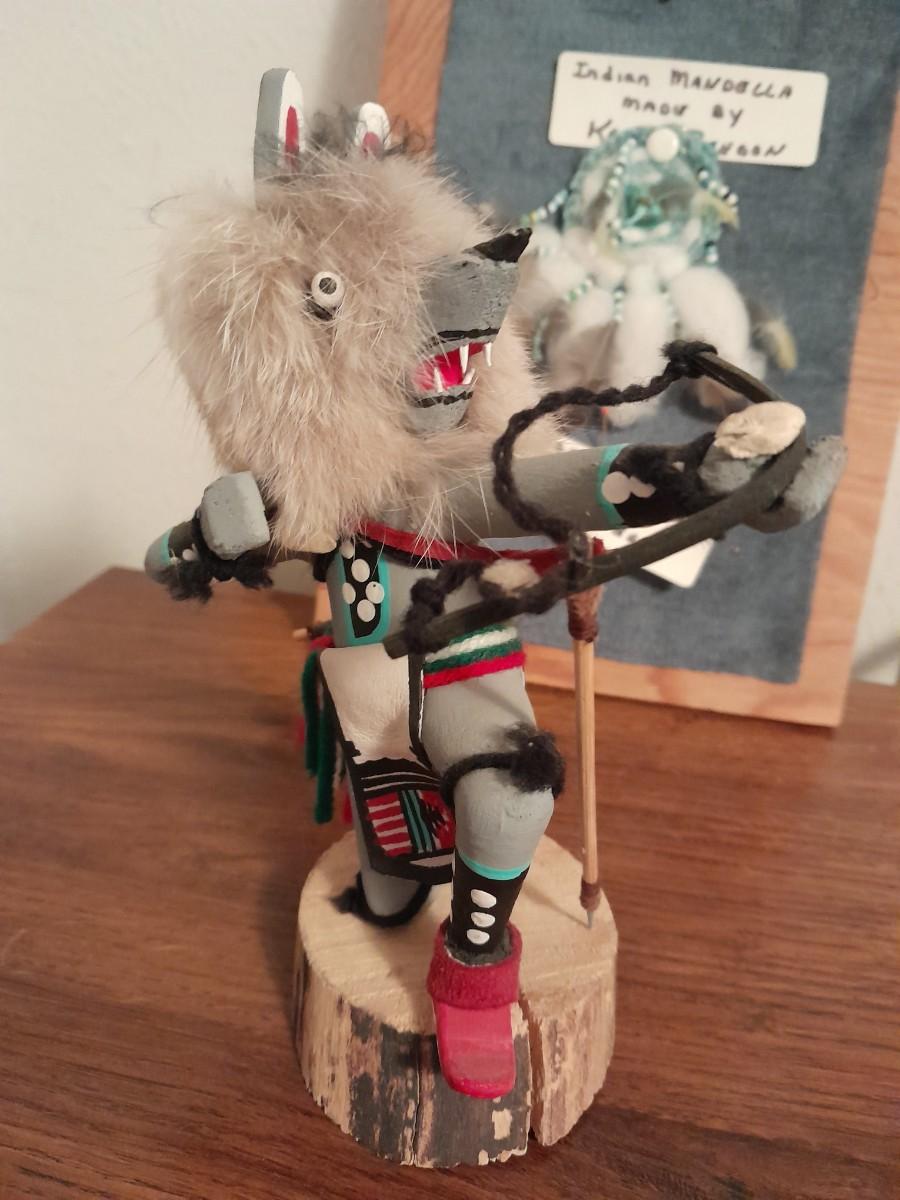 KACHINA GREY WOLF AND NATIVE DISPLAY MANDELLA DREAM CATCHER AND OJO DE DIOS