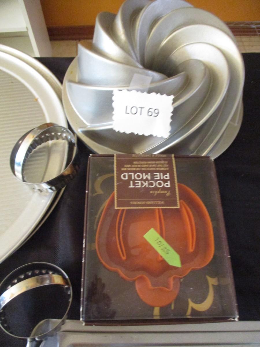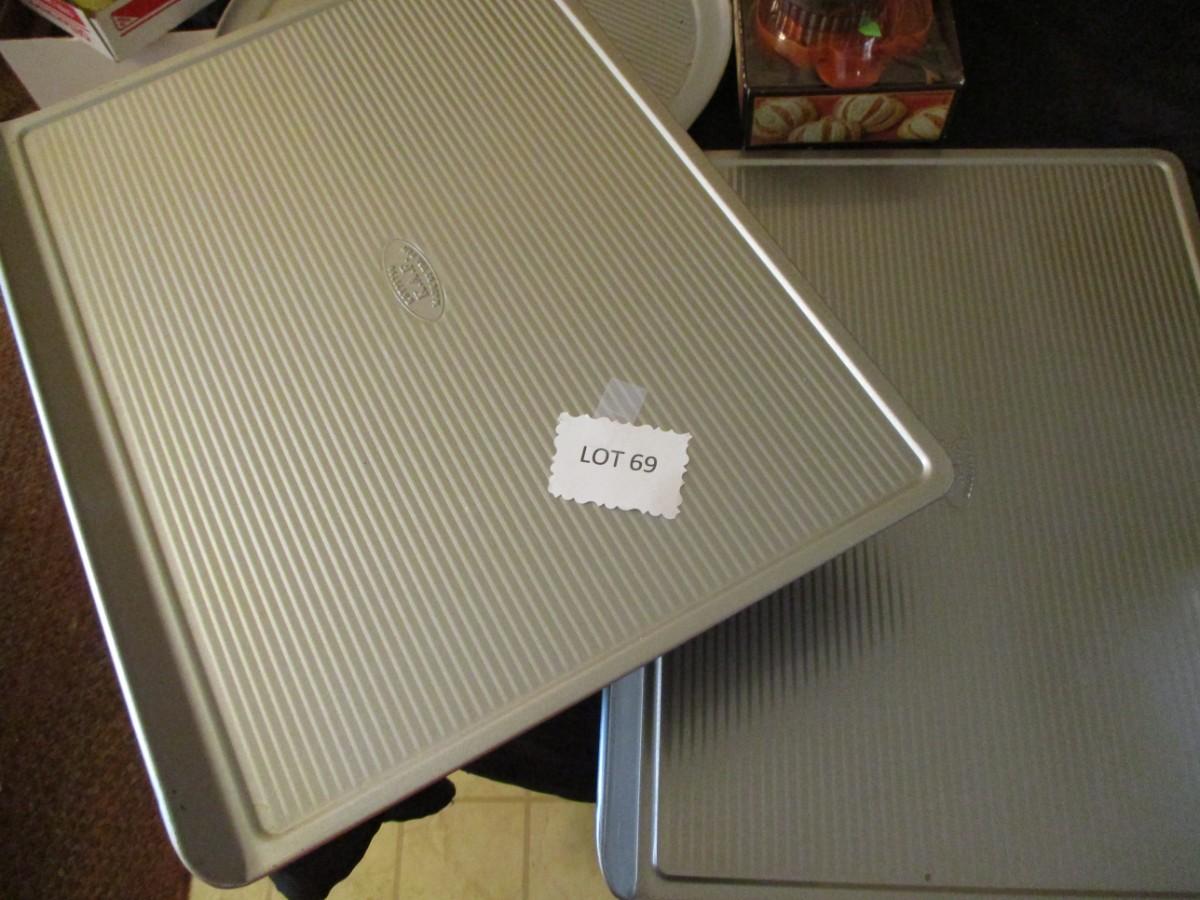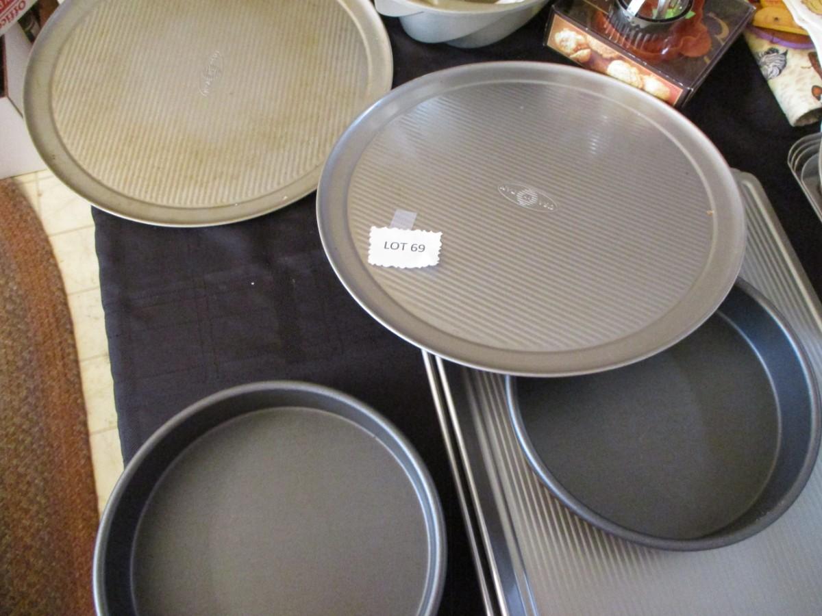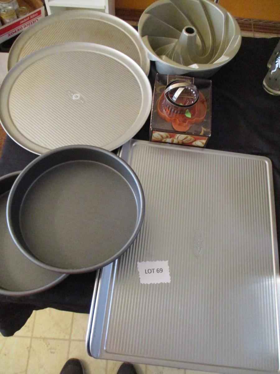 Large cookie sheets, 2 pizza pans, Two 10" cake pans, bundt pan