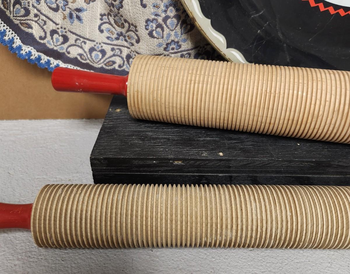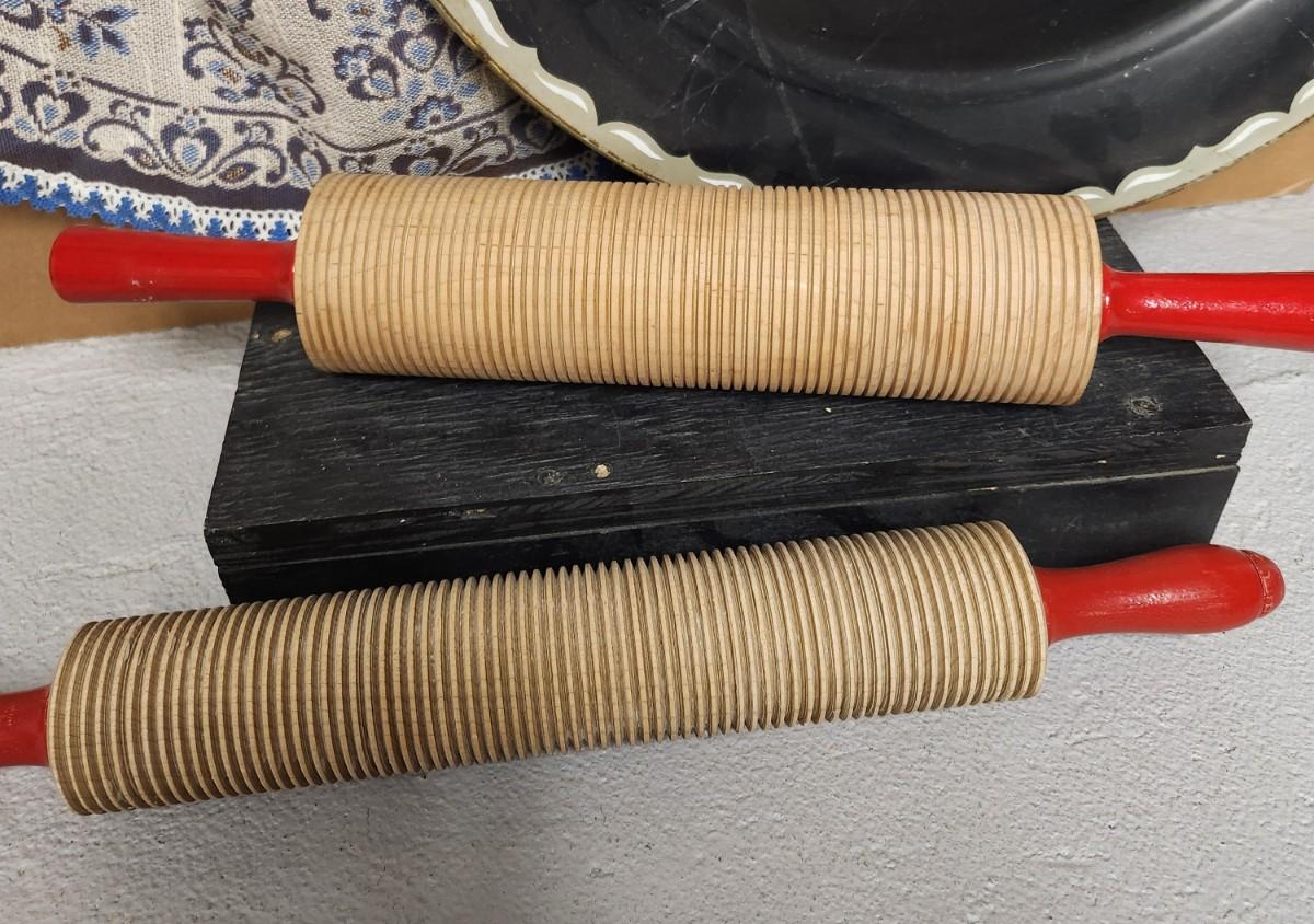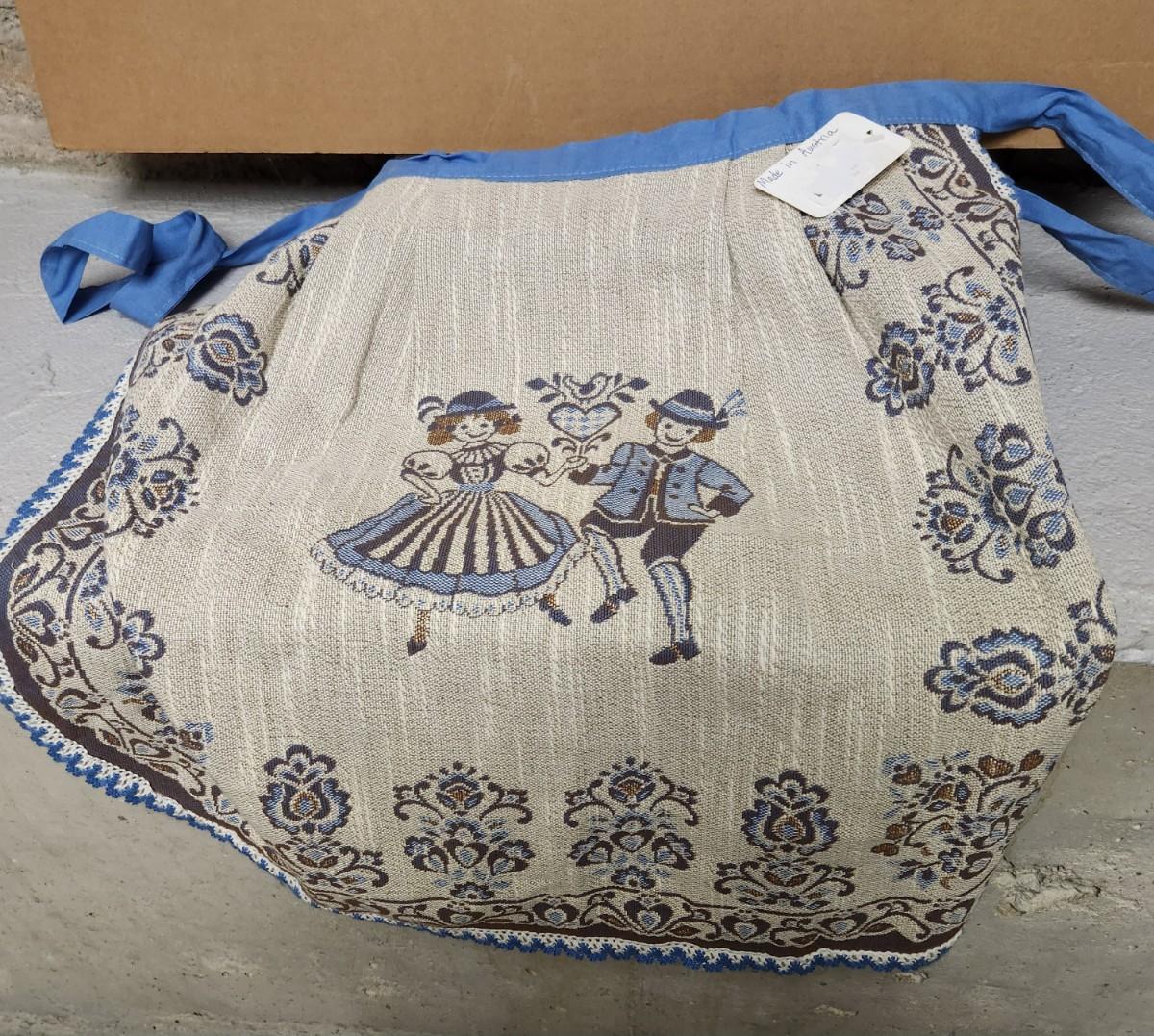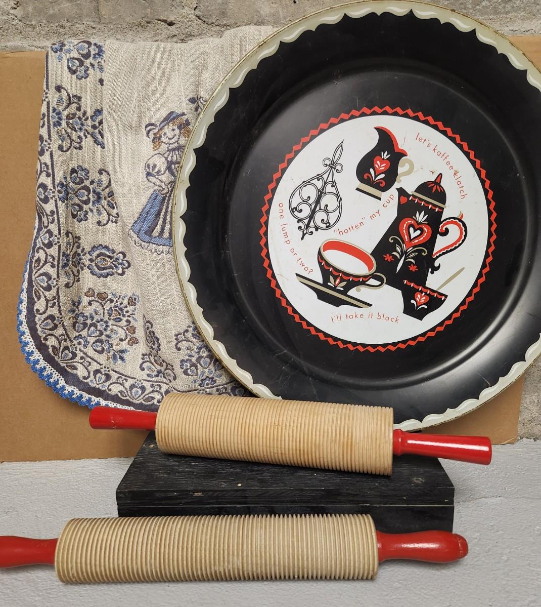 2 different sized correlated rolling pins, an awesome vintage tray and a beautiful Austrian apron