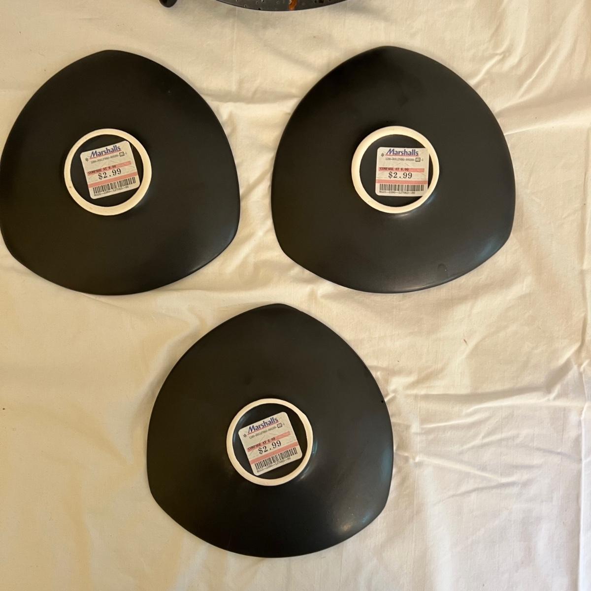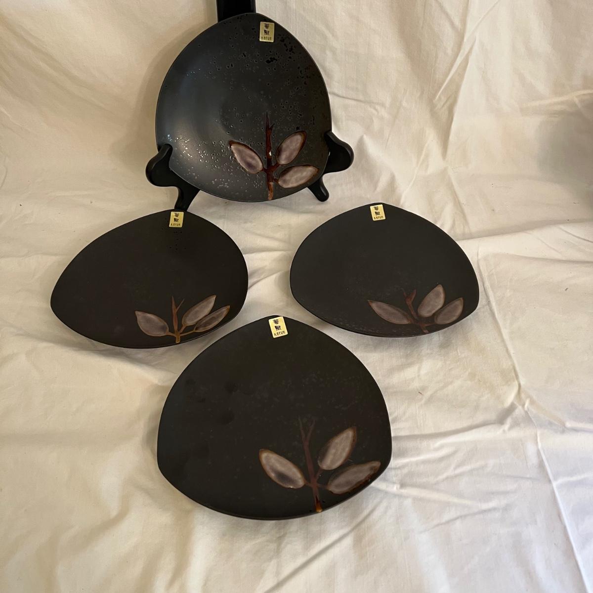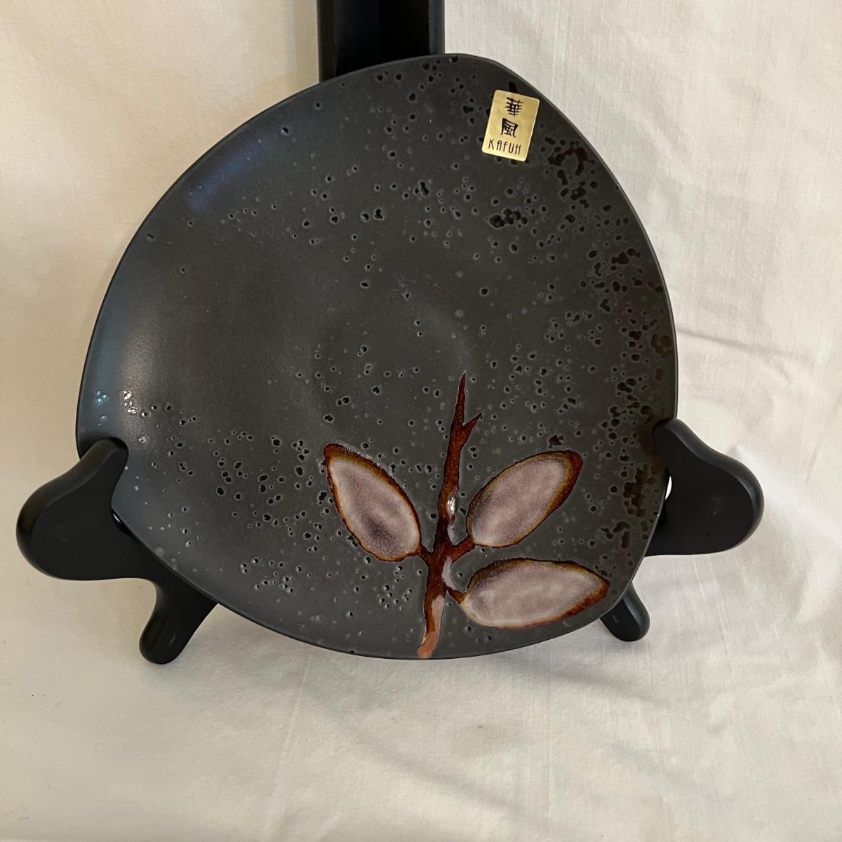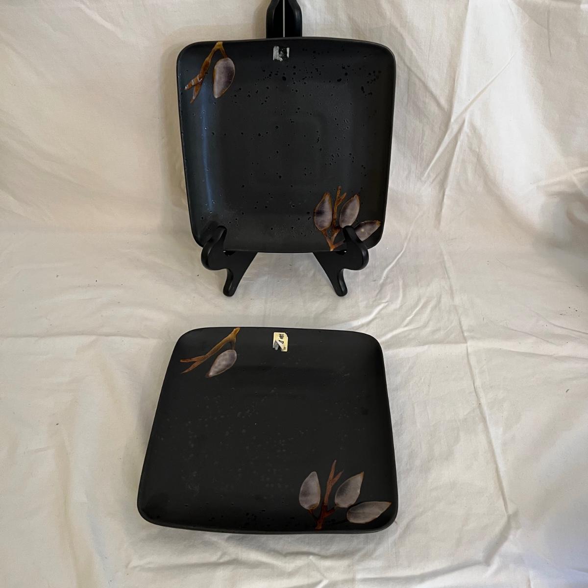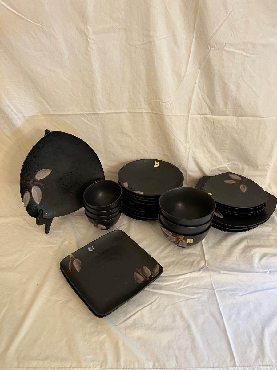 A collection of black, brown, and pale lavender dishes by Kafuh. Four smaller rice bowls 4.5”D x 3”H, three larger soup bowls 6”D x 4”H, and four salad size bowls 9”D x 1.75”H. Four larger triangular shaped dinner plates 10.5” x 11” x 1”H and four smaller triangular shaped plates measuring 8” x 8” x 1”H. Two plates are 8.5” square x 1”H and four plates are 9”D x 1”H.