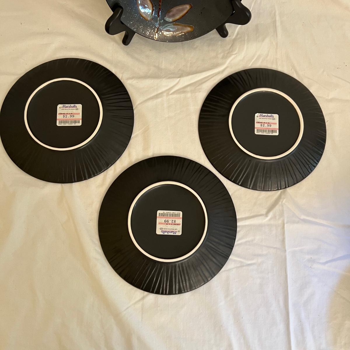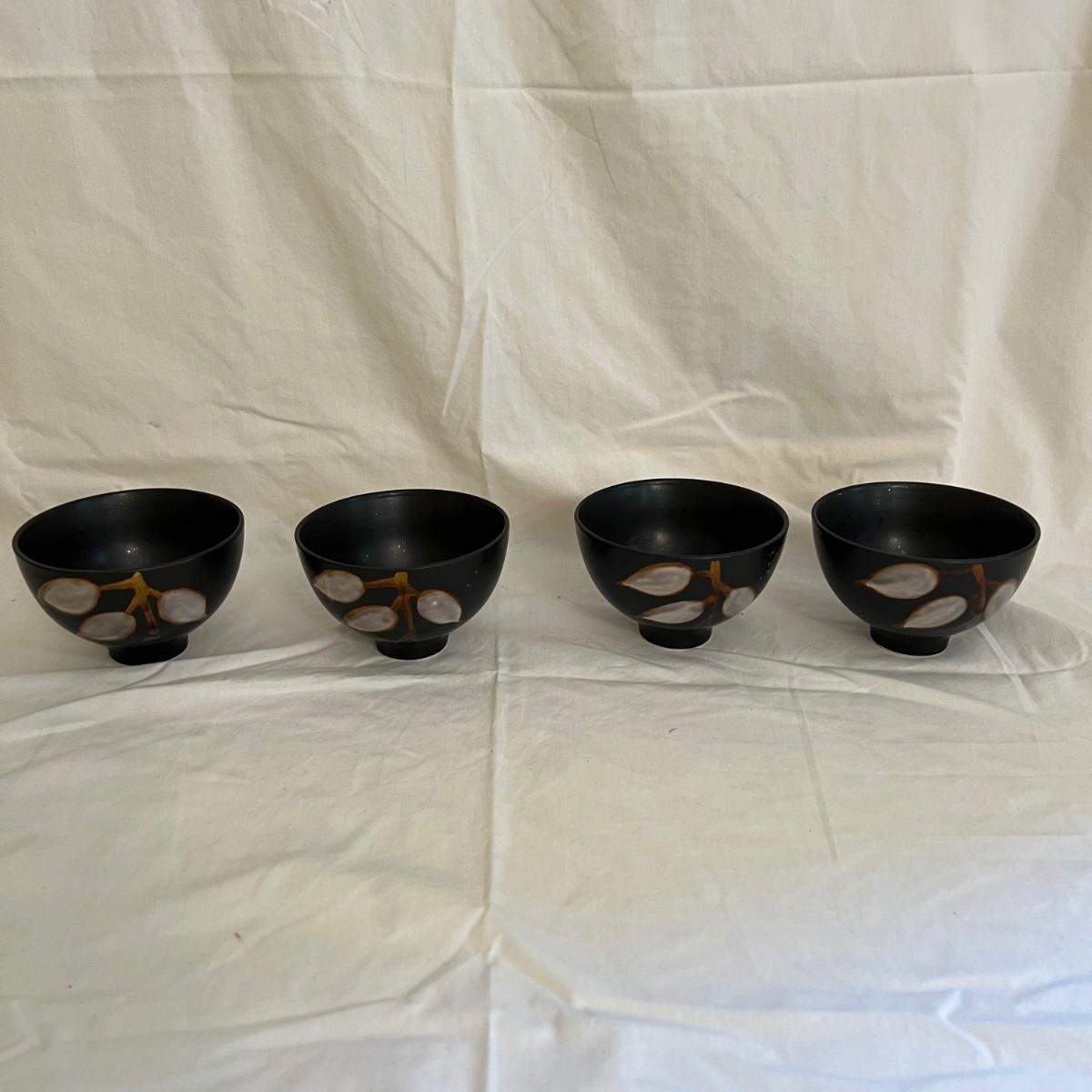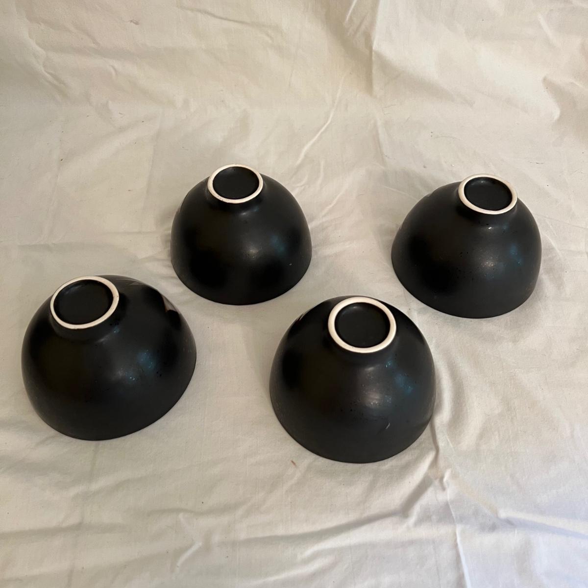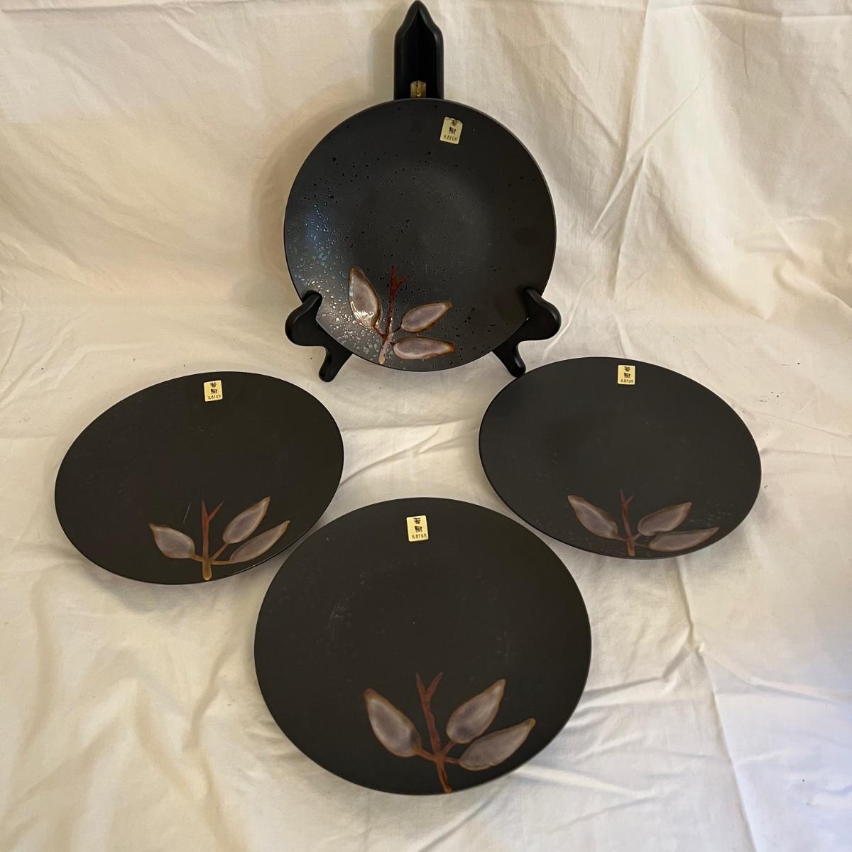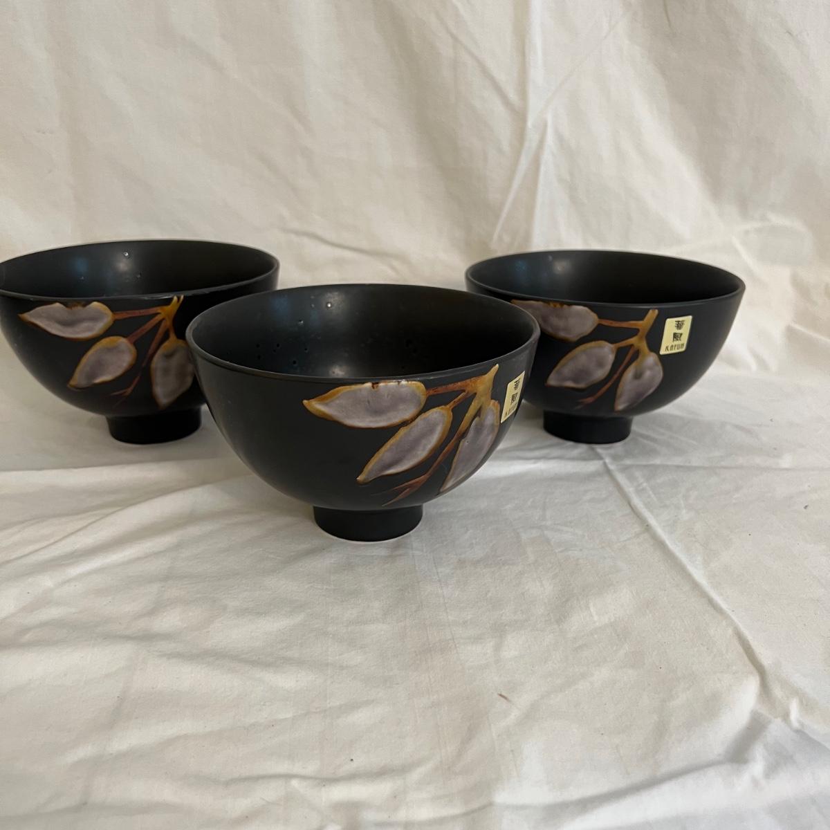 A collection of black, brown, and pale lavender dishes by Kafuh. Four smaller rice bowls 4.5”D x 3”H, three larger soup bowls 6”D x 4”H, and four salad size bowls 9”D x 1.75”H. Four larger triangular shaped dinner plates 10.5” x 11” x 1”H and four smaller triangular shaped plates measuring 8” x 8” x 1”H. Two plates are 8.5” square x 1”H and four plates are 9”D x 1”H.