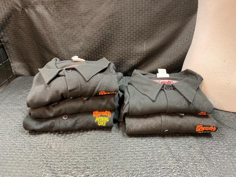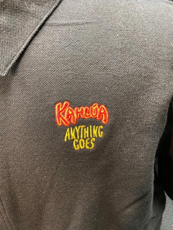 5 Kahlua Anything Goes shirts. Button down shirts with a polo shirt look. 3 are size large and 2 are Xlarge. New old stock.