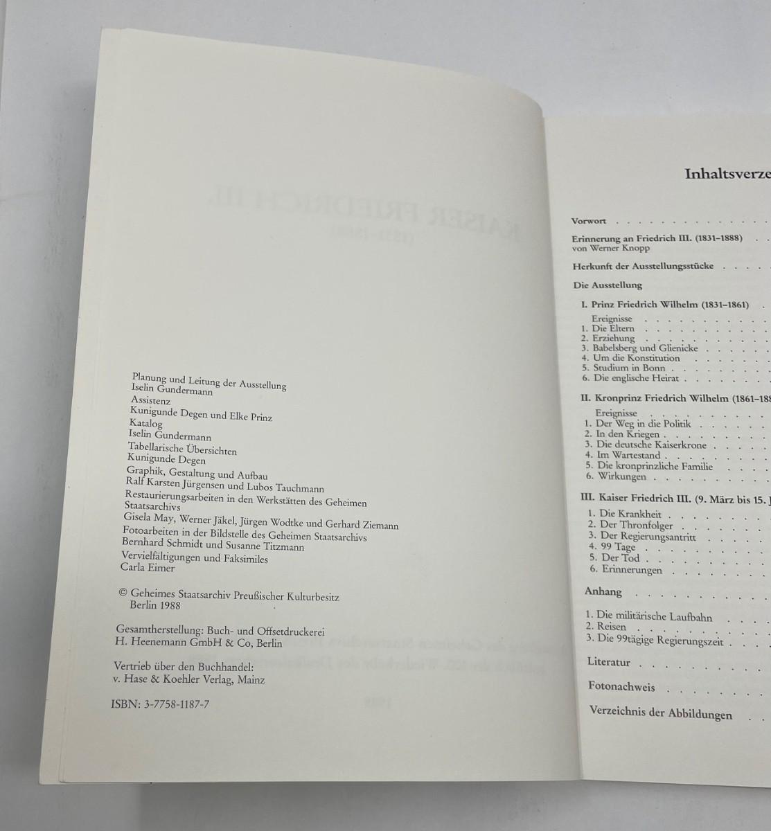 Description: KAISER FREIDRICH III. (1831 - 1888). Ausstellung des Geheimmen Staatsarchivs Preubishcher Kulturbesitz anlablich der 100. Wiederkehr des Dreikaiserjahres 1888. Publised 1988. Material: Paper