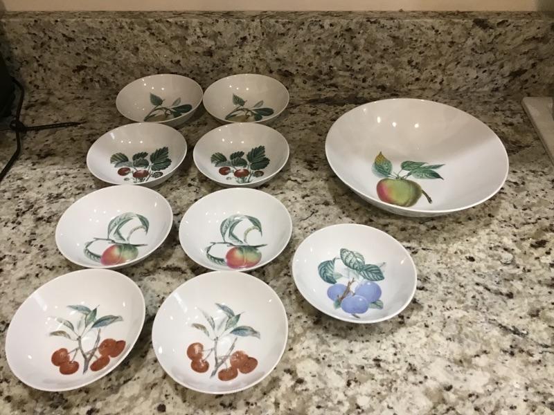 Beautiful set of “Kaiser” 9 fruit patterned bowls approx 5.5” bowls and one larger 9” bowl.