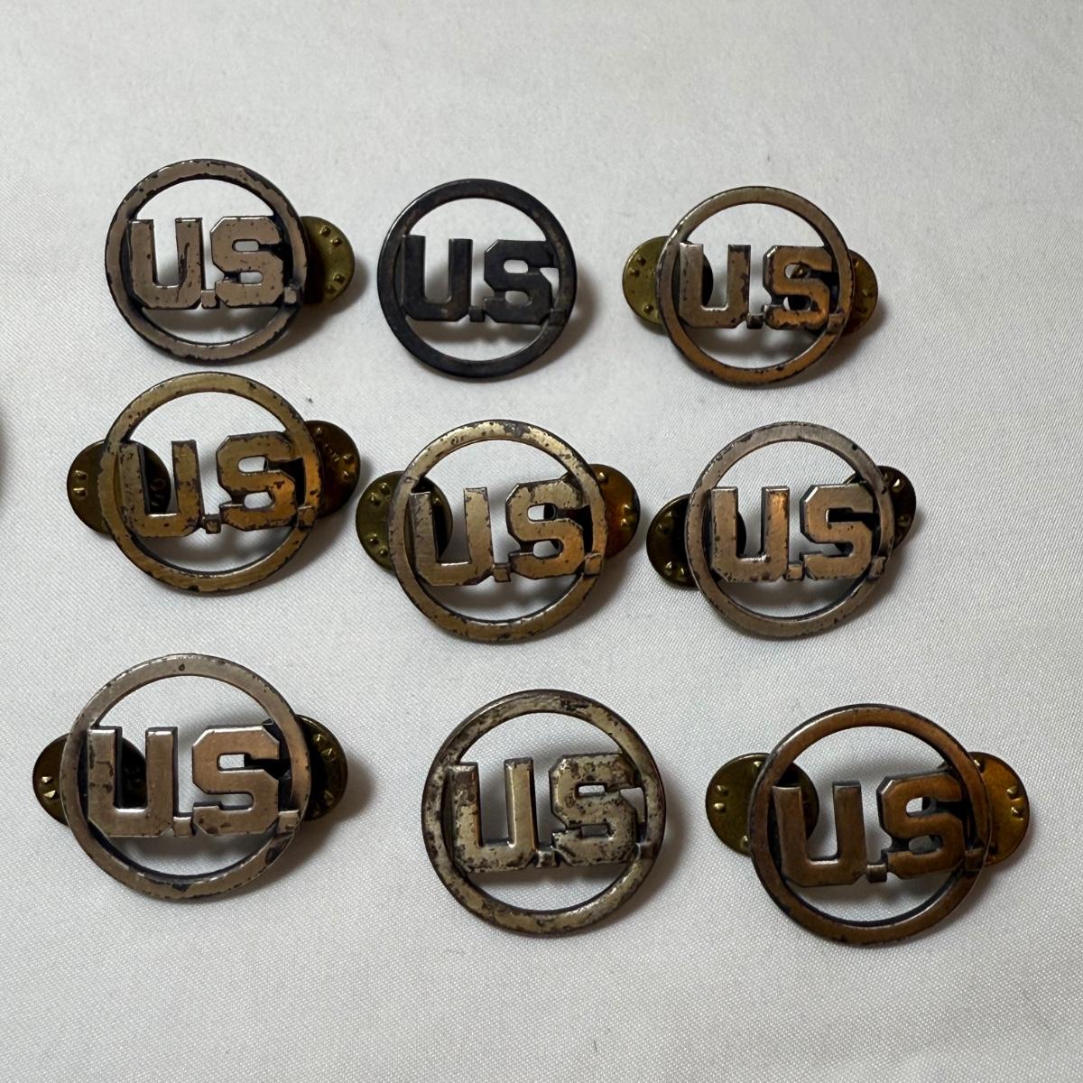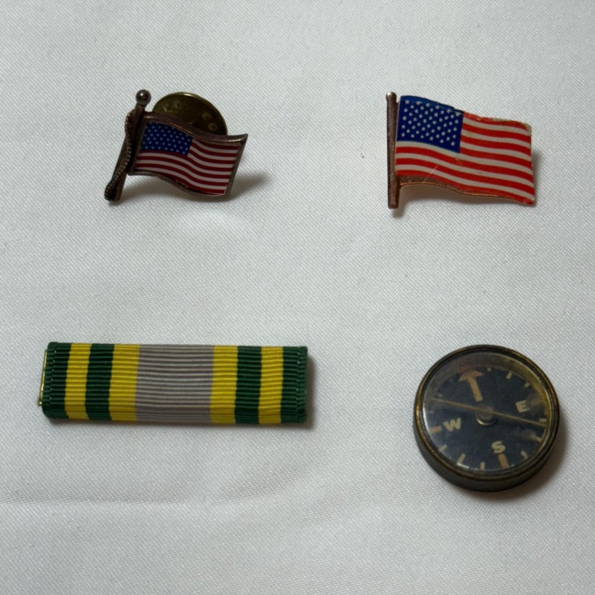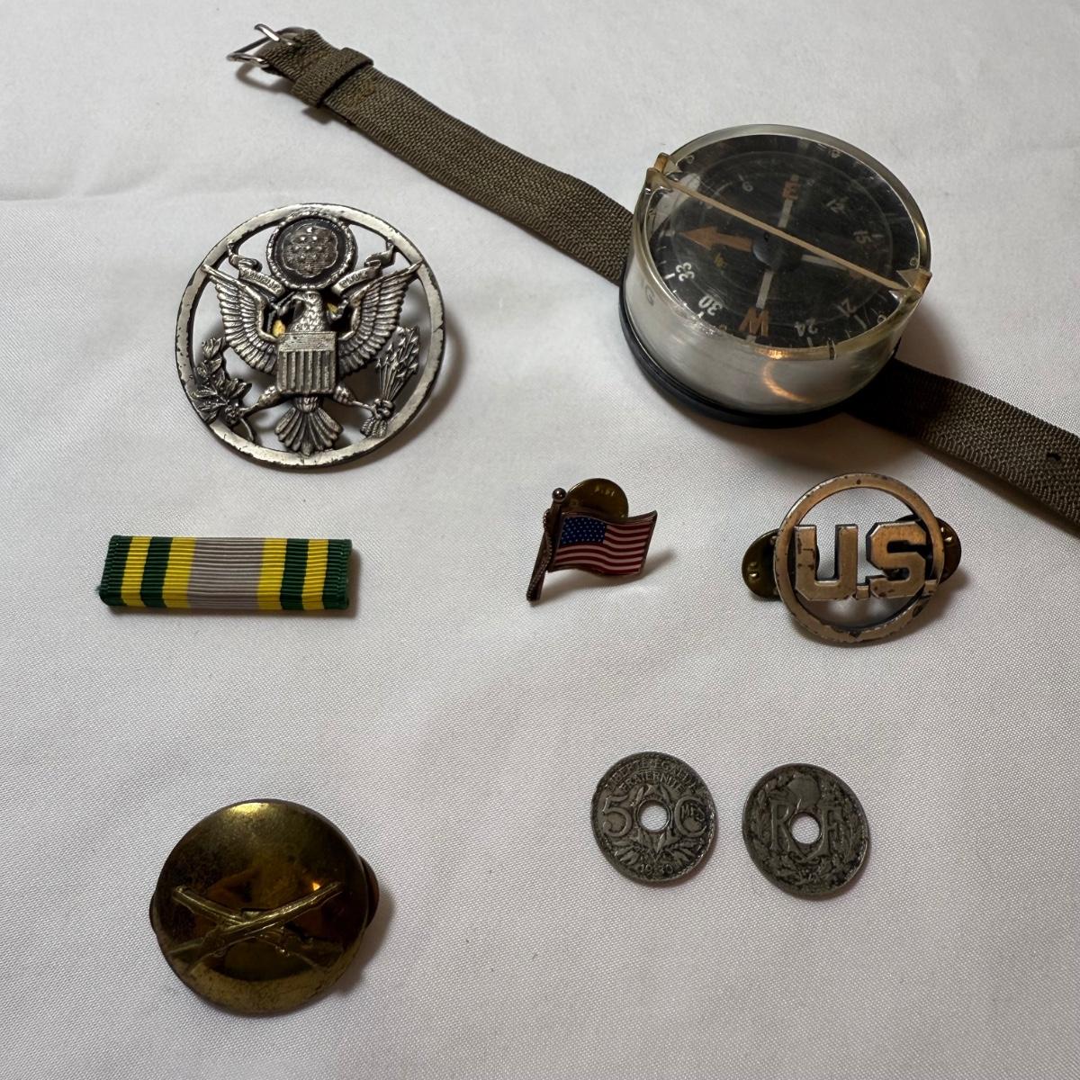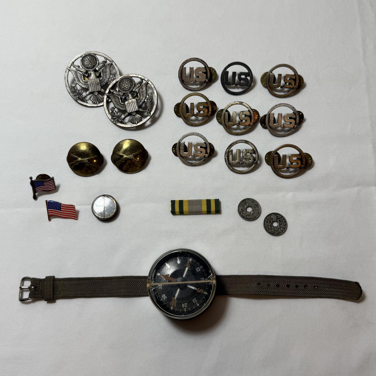 A collection of militaria including two U.S. Air Force service cap pins featuring the U.S. Coat of Arms, nine U.S. collar lapel pins, and two brass pins featuring crossed rifles, likely from WWII. There are also two French 5 centimes coins, one from 1930 and the other from 1938 (pre-WWII era). Also included is a Kalart Co. wrist compass, plus one small compass (plastic face is cracked), two U.S. flag pins, and a USAF ribbon. The Kalart compass is encased within a plastic shell that is 1.75”D.