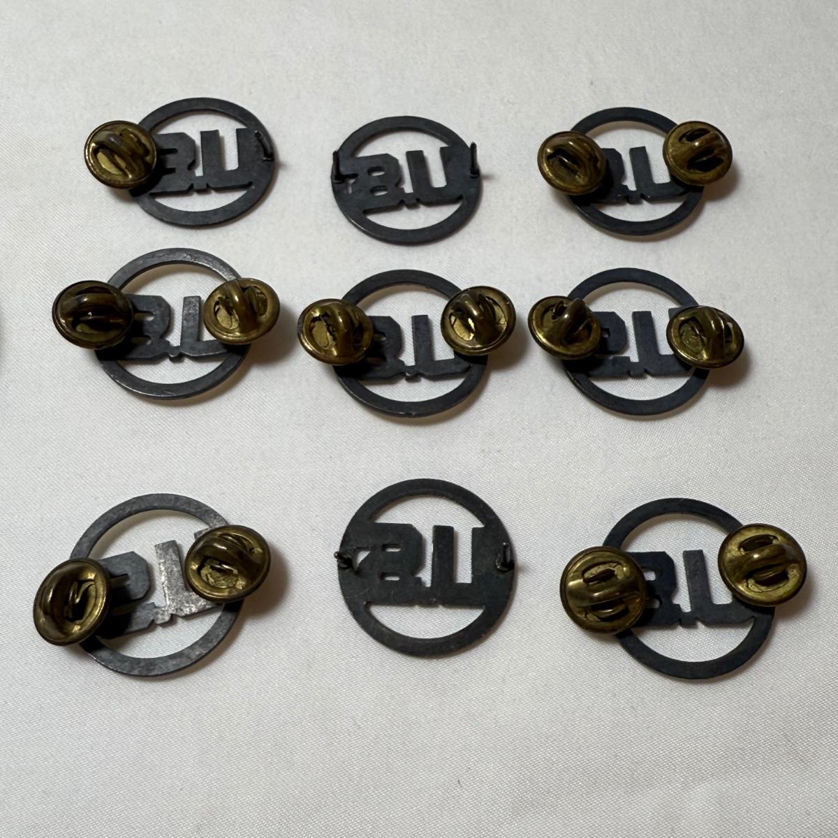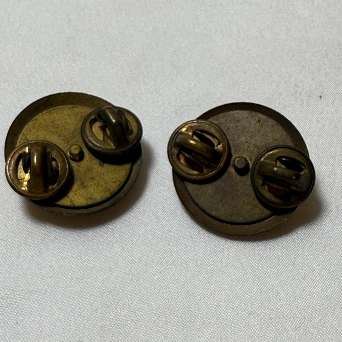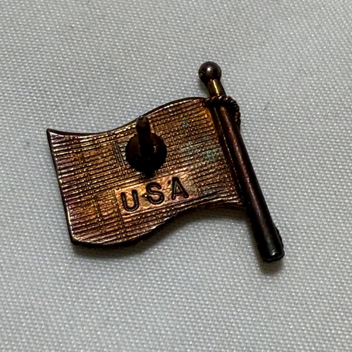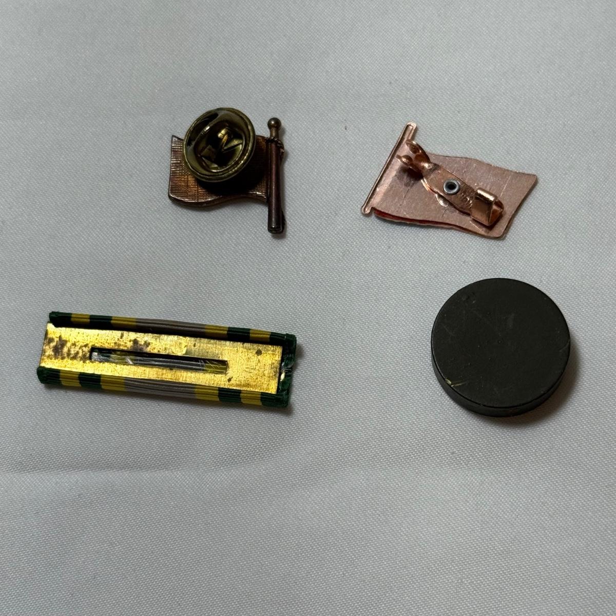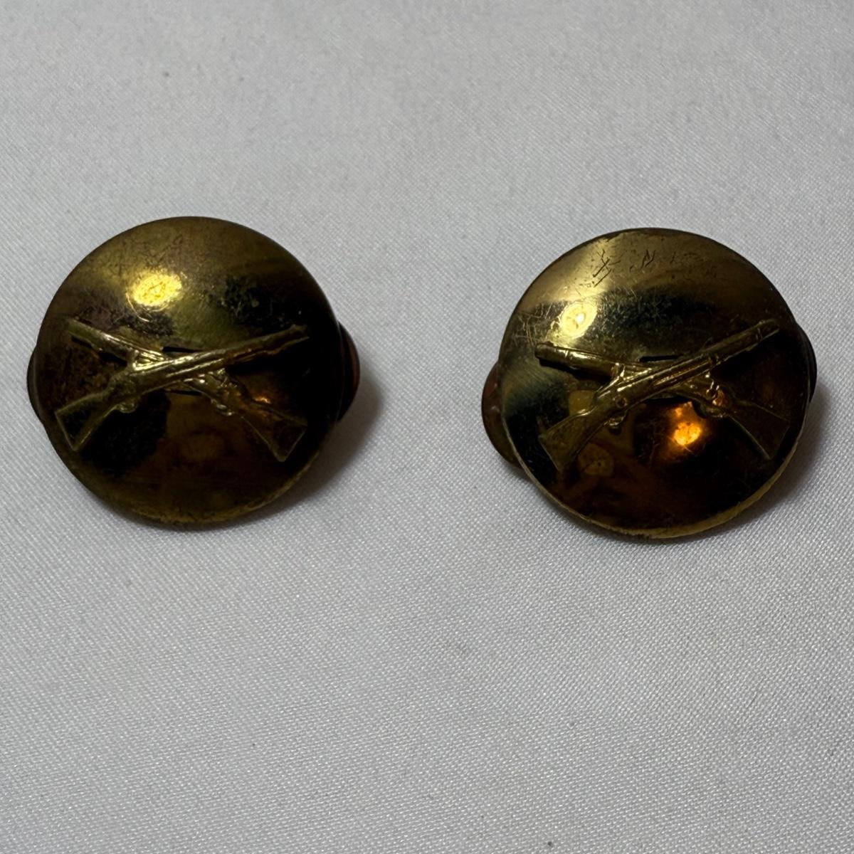 A collection of militaria including two U.S. Air Force service cap pins featuring the U.S. Coat of Arms, nine U.S. collar lapel pins, and two brass pins featuring crossed rifles, likely from WWII. There are also two French 5 centimes coins, one from 1930 and the other from 1938 (pre-WWII era). Also included is a Kalart Co. wrist compass, plus one small compass (plastic face is cracked), two U.S. flag pins, and a USAF ribbon. The Kalart compass is encased within a plastic shell that is 1.75”D.