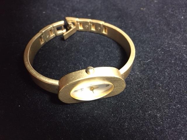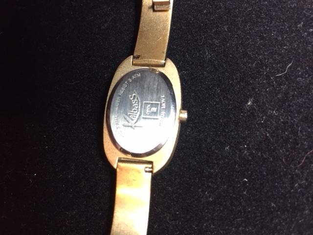 Ladies watch by Kalbass Opex with oval white face inset in a wide oval brushed gold tone bezel. Brushed gold tone solid band with several adjustable links.