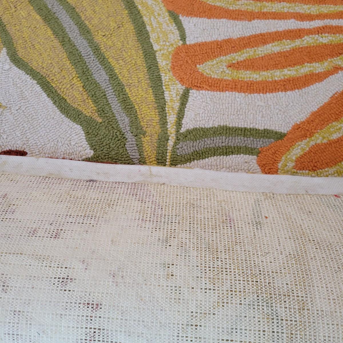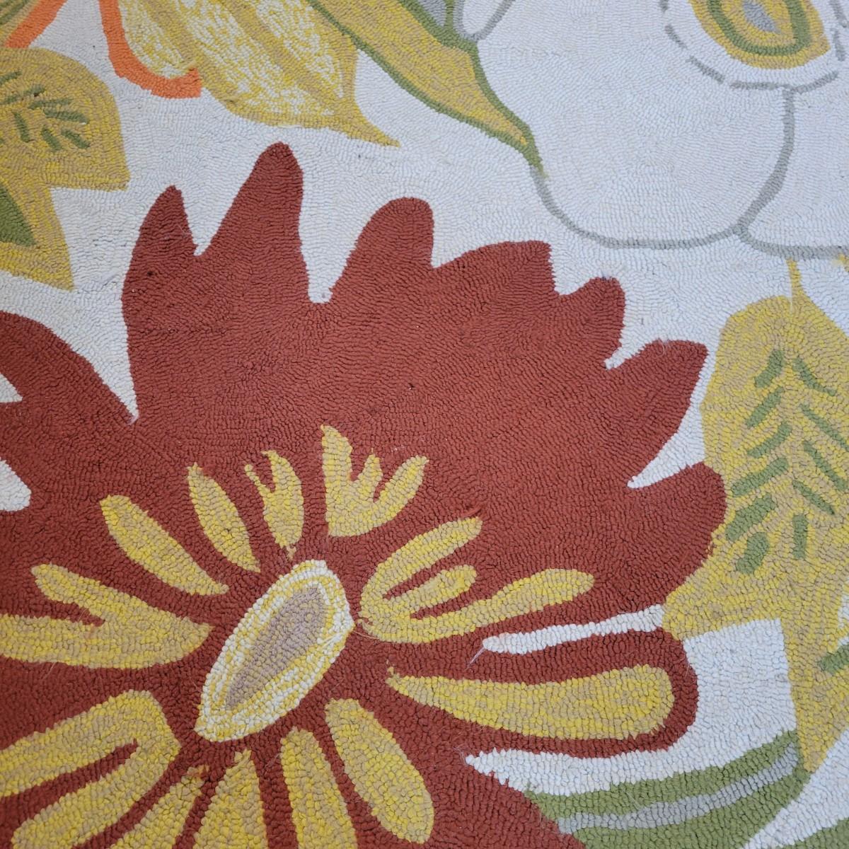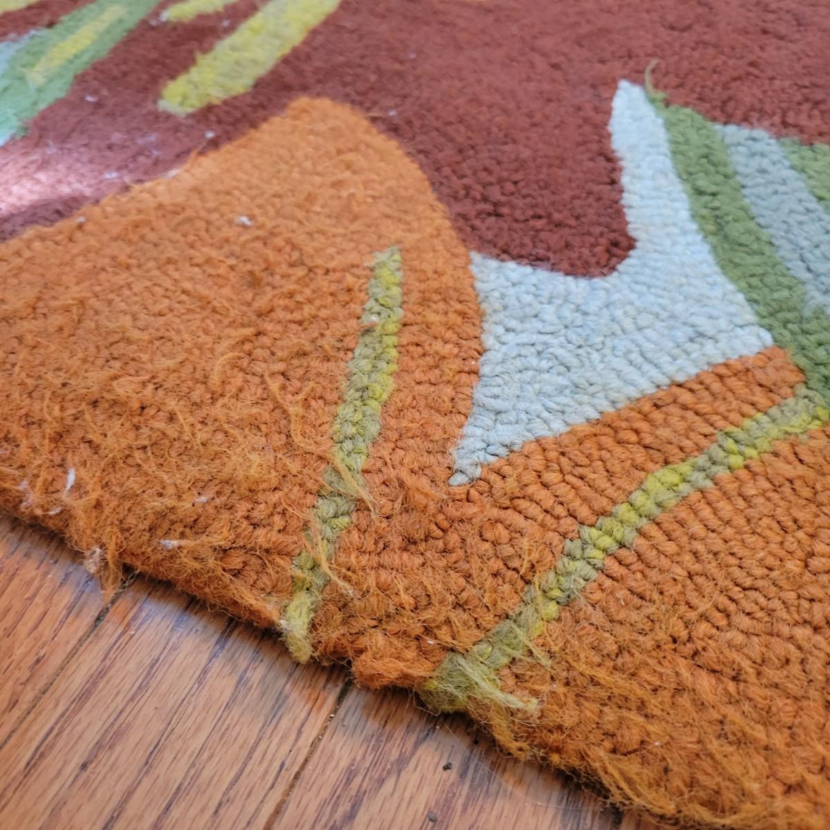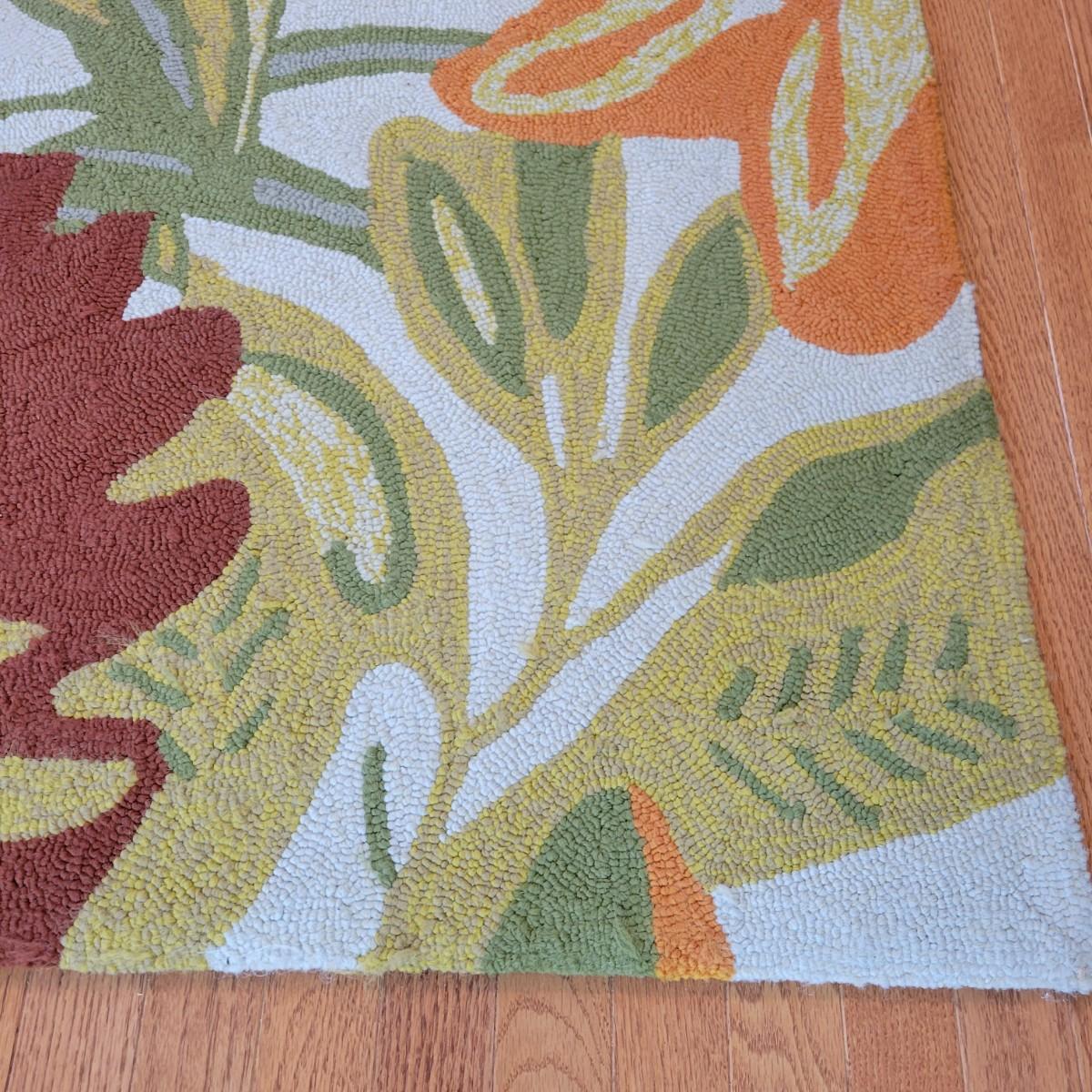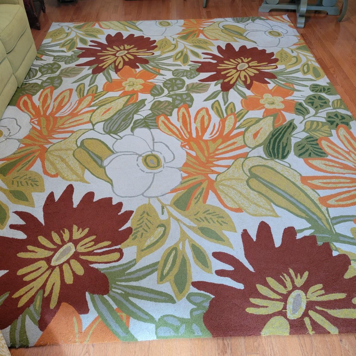A large, contemporary area rug by Kaleen in the pattern Matira. It features vivid colors with tropical leafs and flowers. It measures approximately 8'6" x 11'6" and does have pulls along the edges. A rug pad is included with purchase. Local pickup only. Winning bidder must bring assistance to help move and load this item due to its weight and/or size.