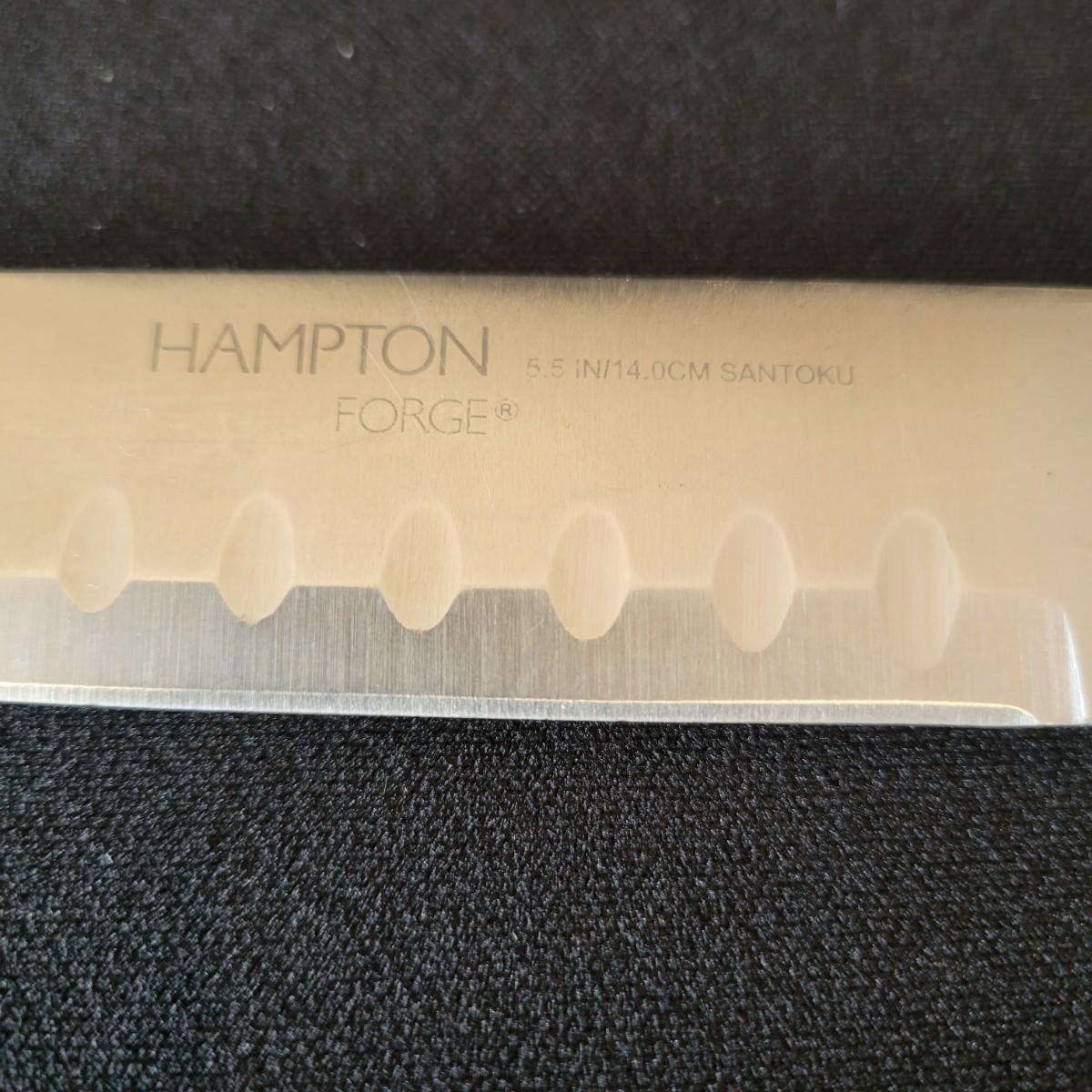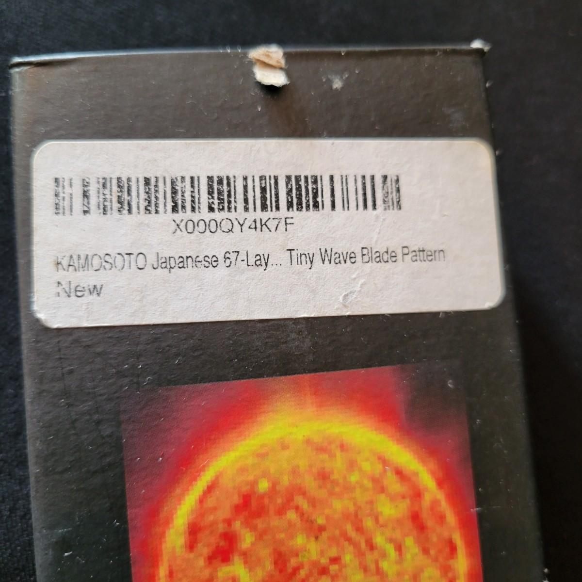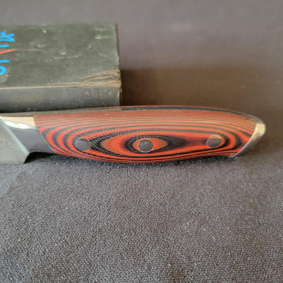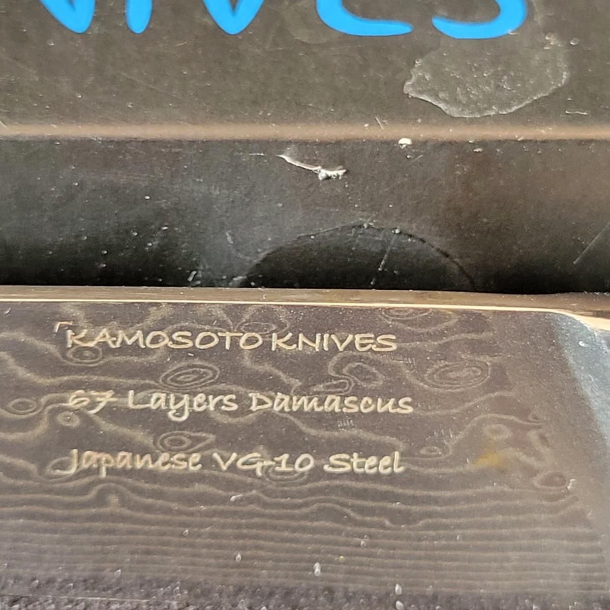 A Kamosoto 4.5" 67 layer Damascus steel knife in its original packaging that does not appear to have been used. Also included are three Emeril branded knives, a Hampton 5.5" Santoku knife,a Wisthof Dreizack pairing knife, a Henkels serrated knife and an Edge serrated knife. Shipping available