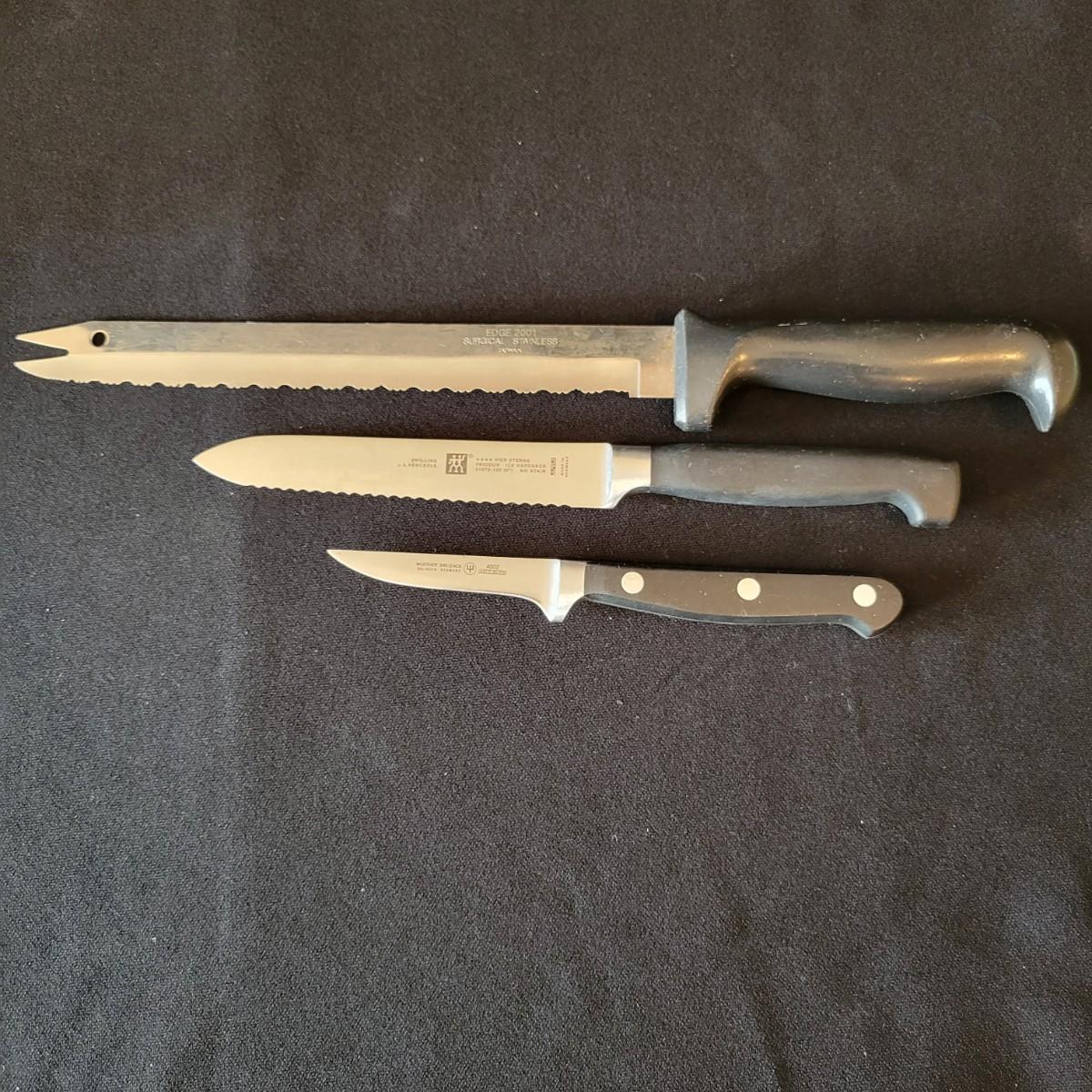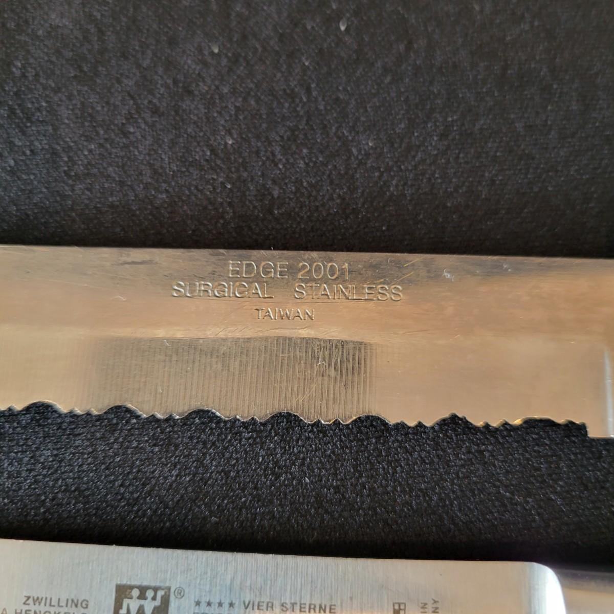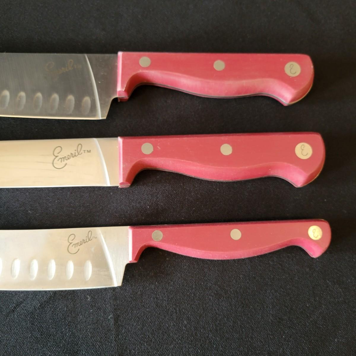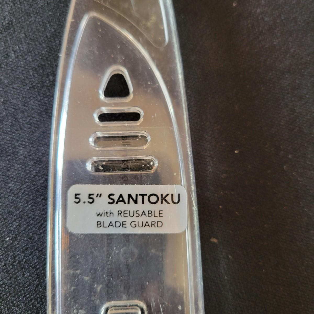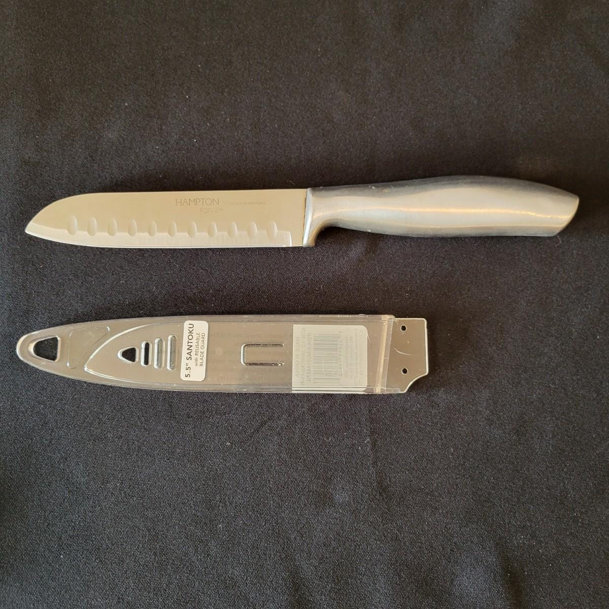 A Kamosoto 4.5" 67 layer Damascus steel knife in its original packaging that does not appear to have been used. Also included are three Emeril branded knives, a Hampton 5.5" Santoku knife,a Wisthof Dreizack pairing knife, a Henkels serrated knife and an Edge serrated knife. Shipping available