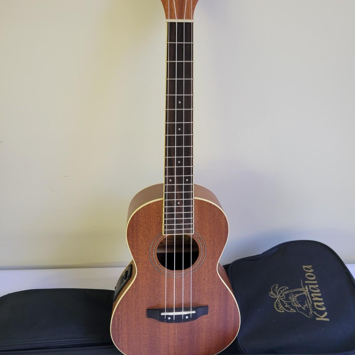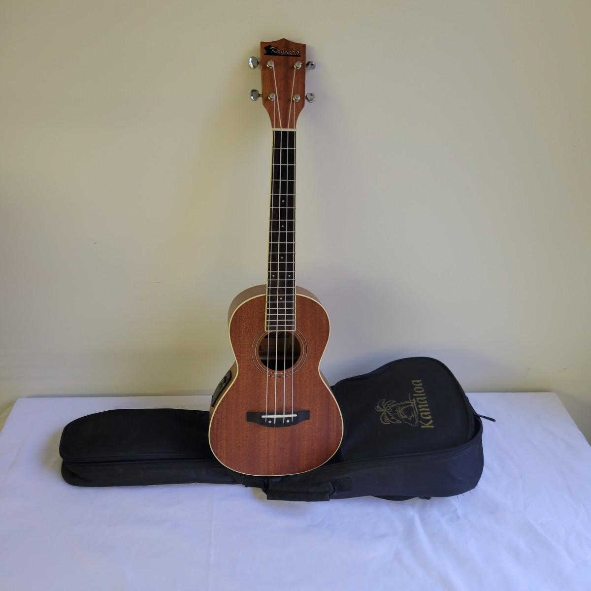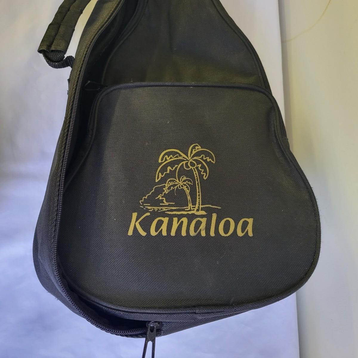 A Kanaloa ukulele that includes a carrying bag, music and finger picks. This item was not tested due to not having a 9 volt battery. It measures approximately 26.5" x 3" x 8.5"H. Local pickup only