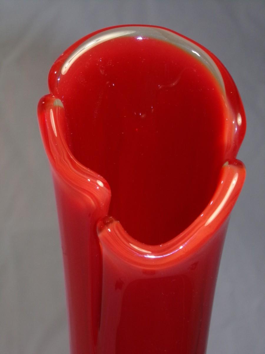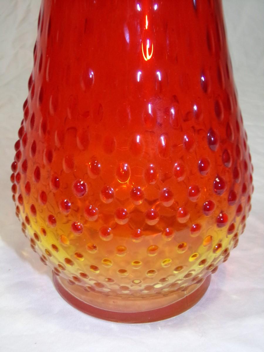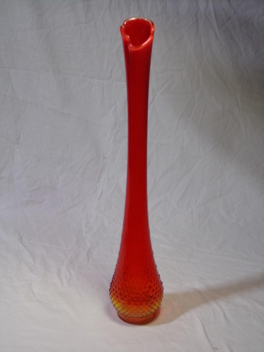 WOW! Kanawha persimmon (red-orange) Amberina hobnail swung glass vase, about 25-1/2"t. c. mid 1960s