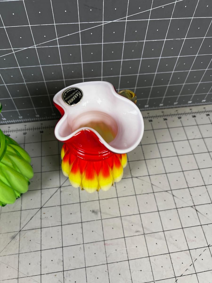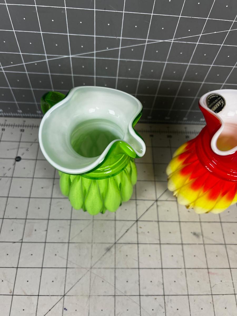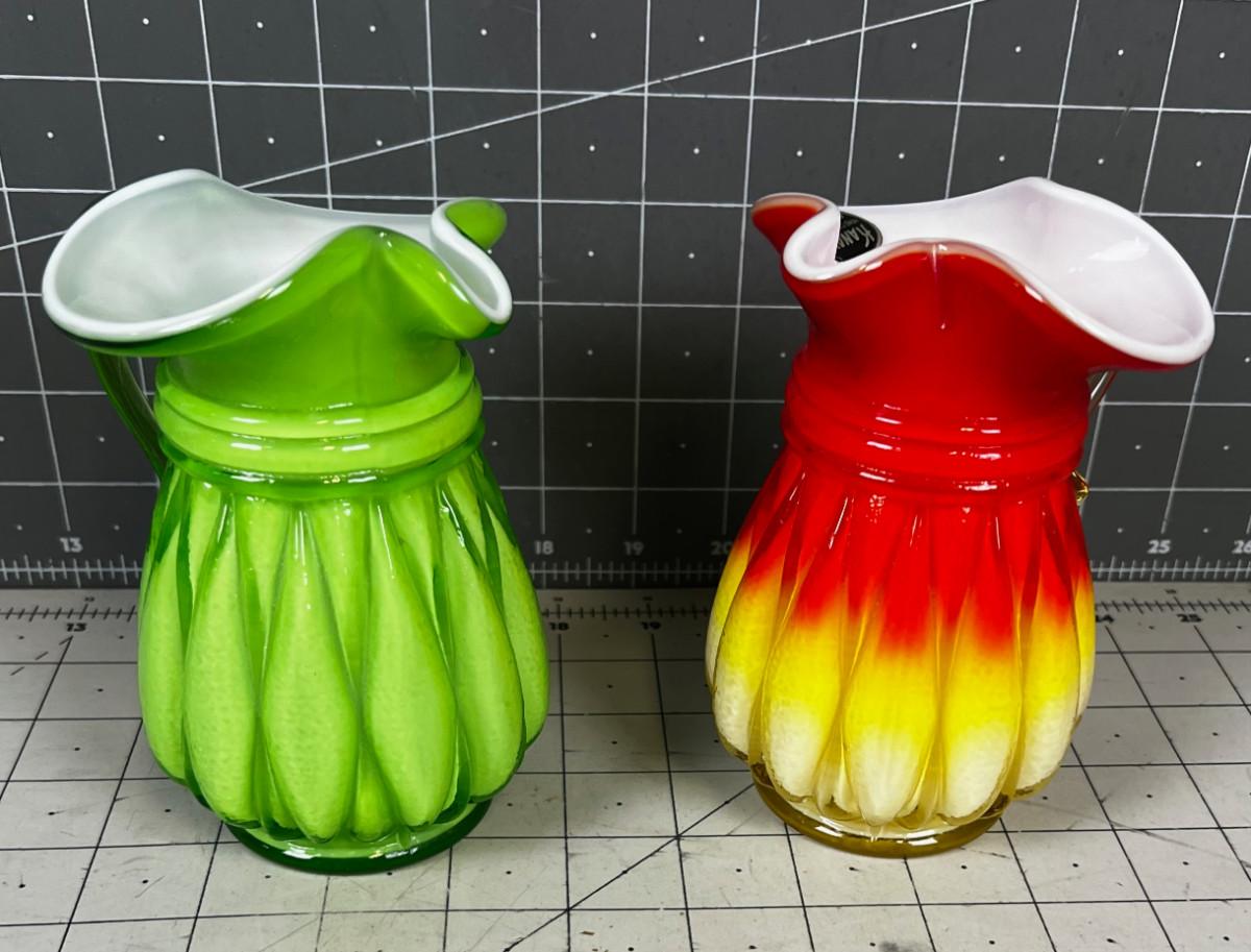 Kanawha Cased Glass Small Pitchers (2) Green & Orange/Yellow.
