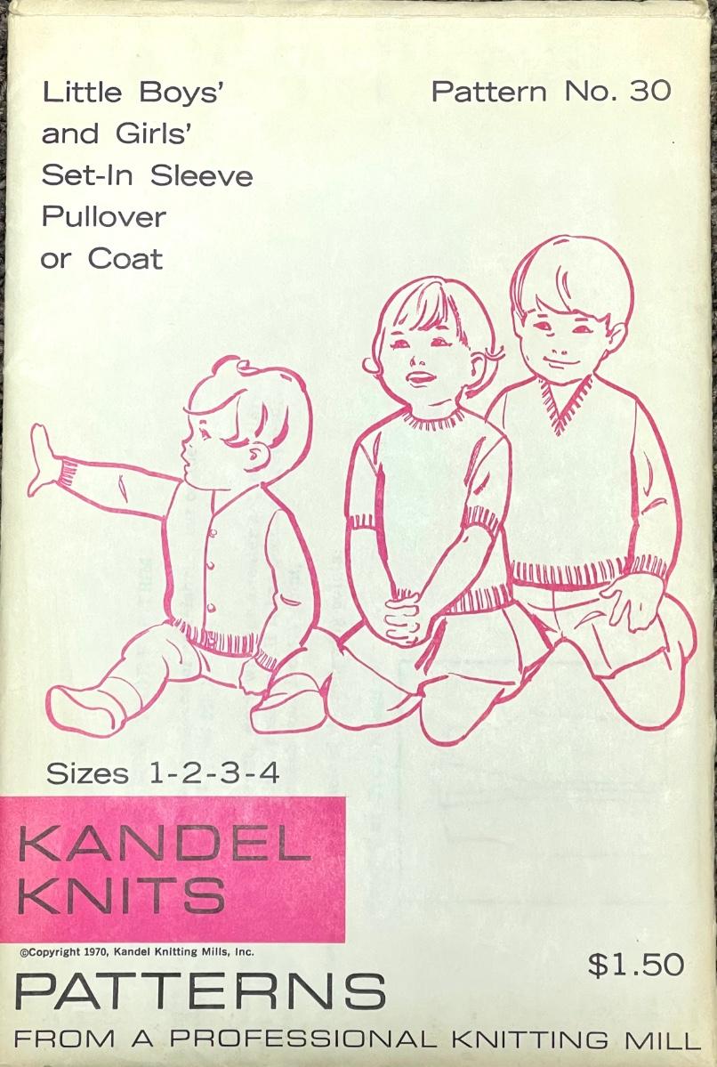 Kandel Knits Pattern No. 30 Little Boys’ and Girls’ Set-in Sleeve Pullover or Coat sizes 1-2-3-4 1970. All pieces verified.