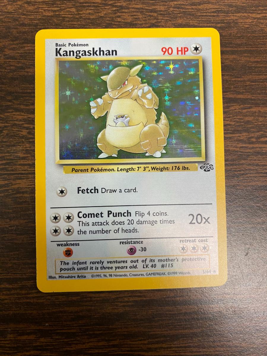 This card is a Kangaskhan from the Jungle Edition of the Pokemon Trading Card Game. It features 90 HP and includes moves Fetch and Comet Punch. The card is marked as 5/64 and was printed in 1999 by Wizards of the Coast. Condition is noted as light play, with minor wear visible on edges and surfaces.