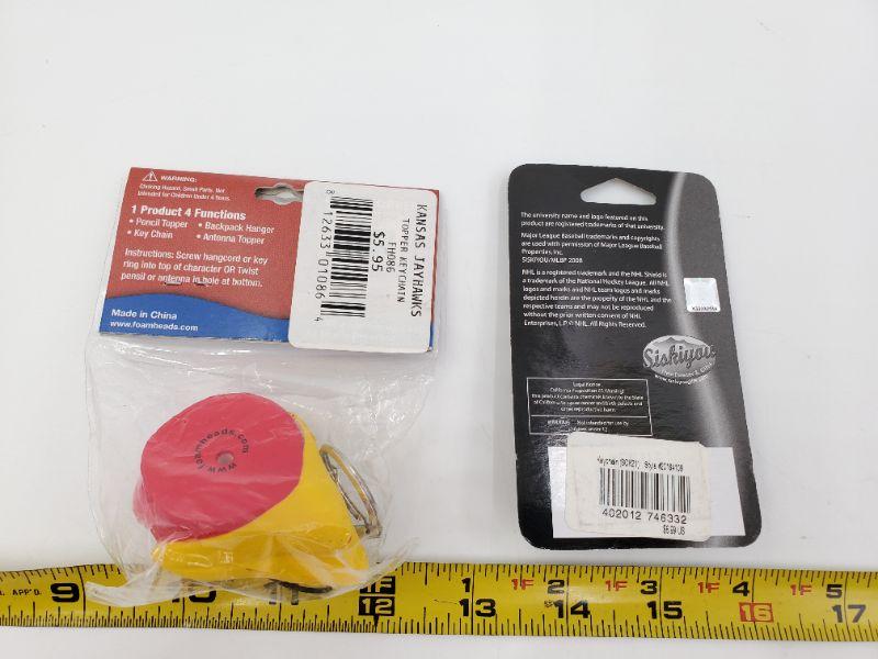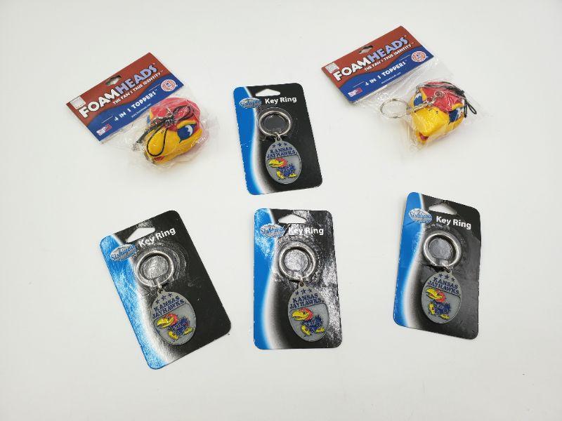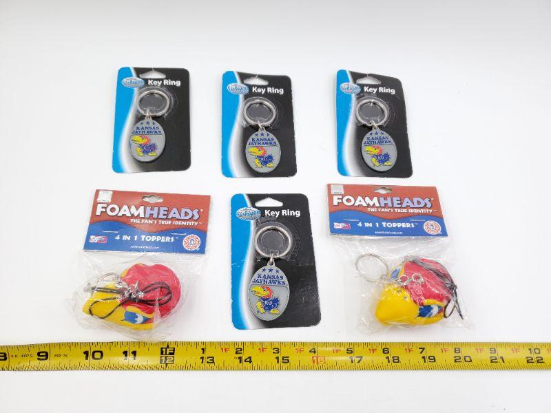 2 foam head Jayhawk keychains, 3 metal Kansas Jayhawks keychains, all new