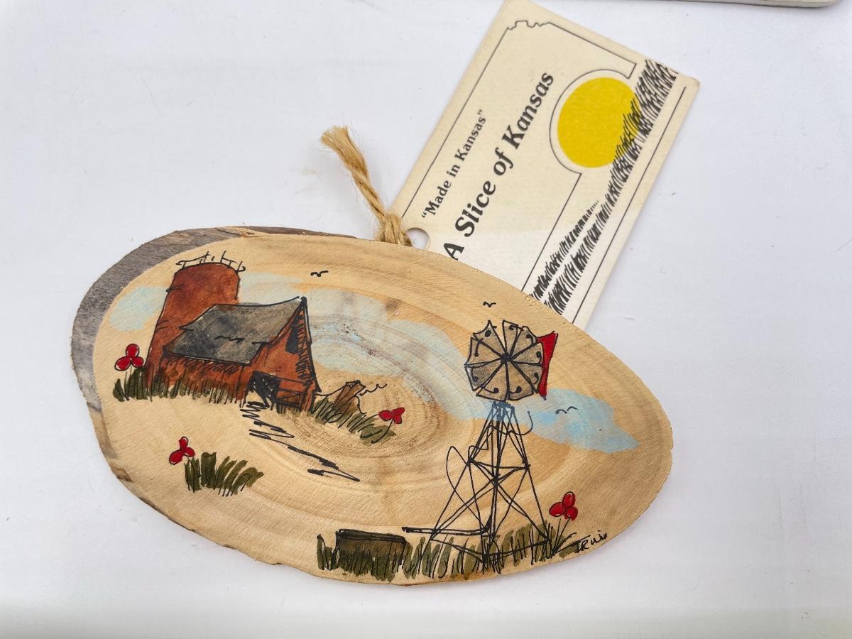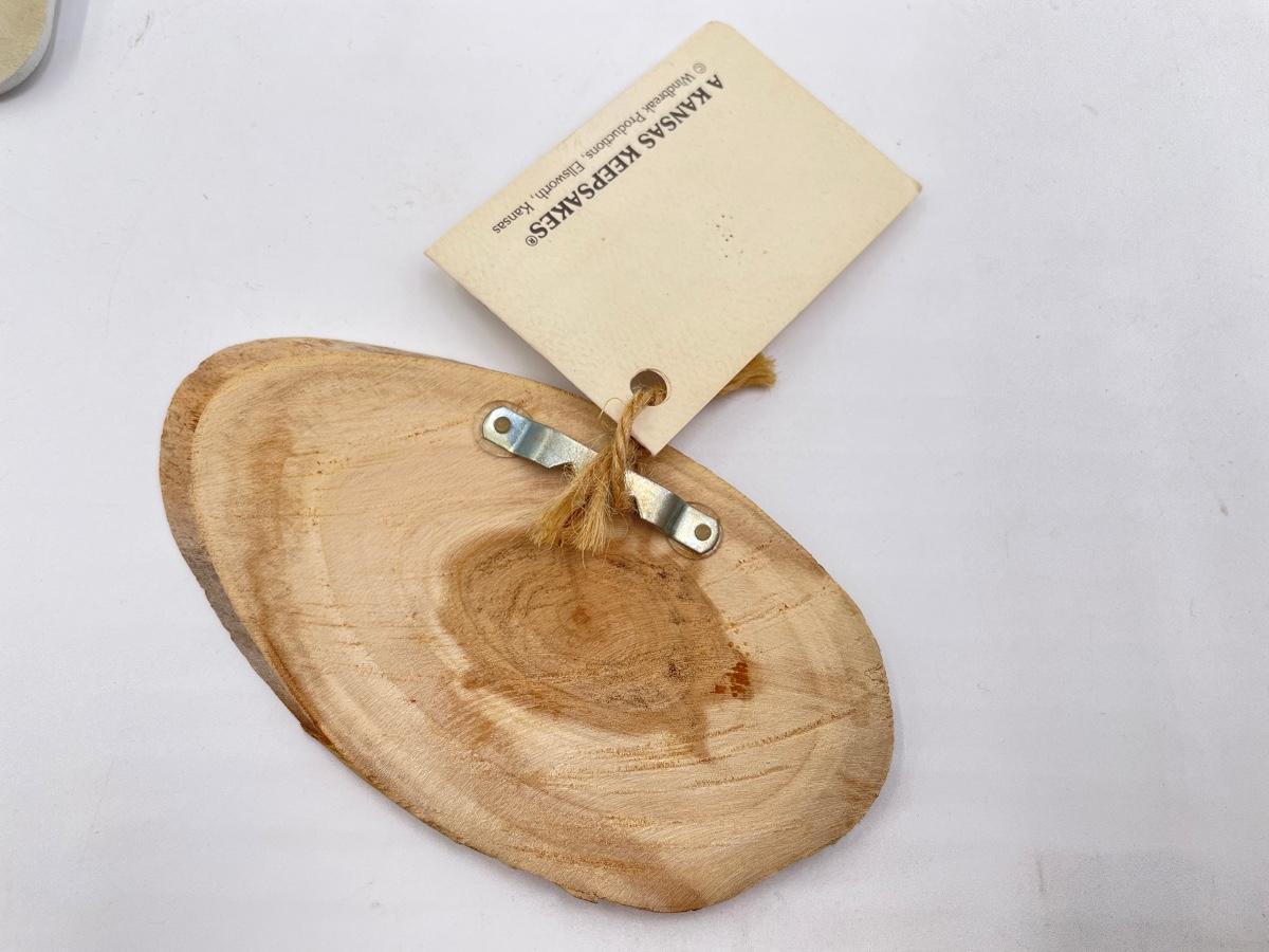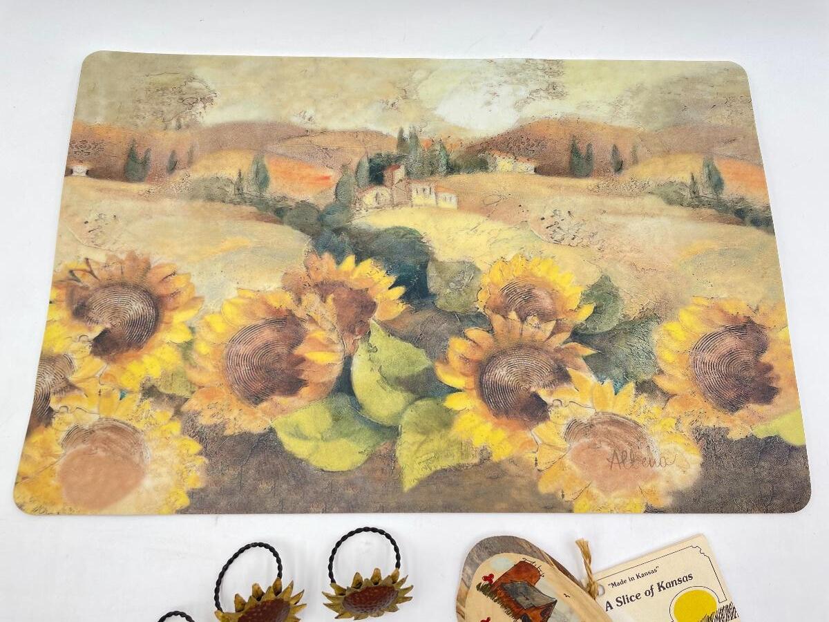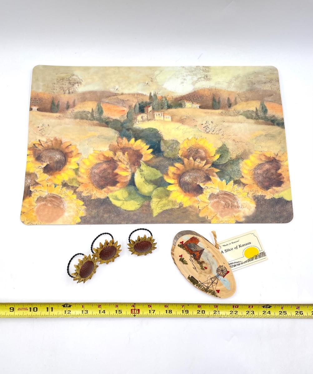 (1) large placemat or pad, (3) sunflower napkin rings, (1) “Slice of Kansas” wooden slab artwork piece by Sandy Irwin.