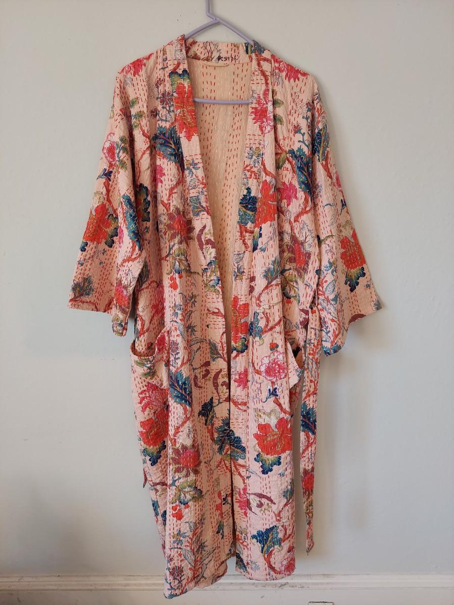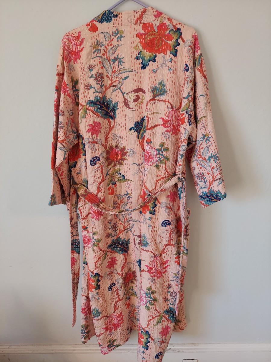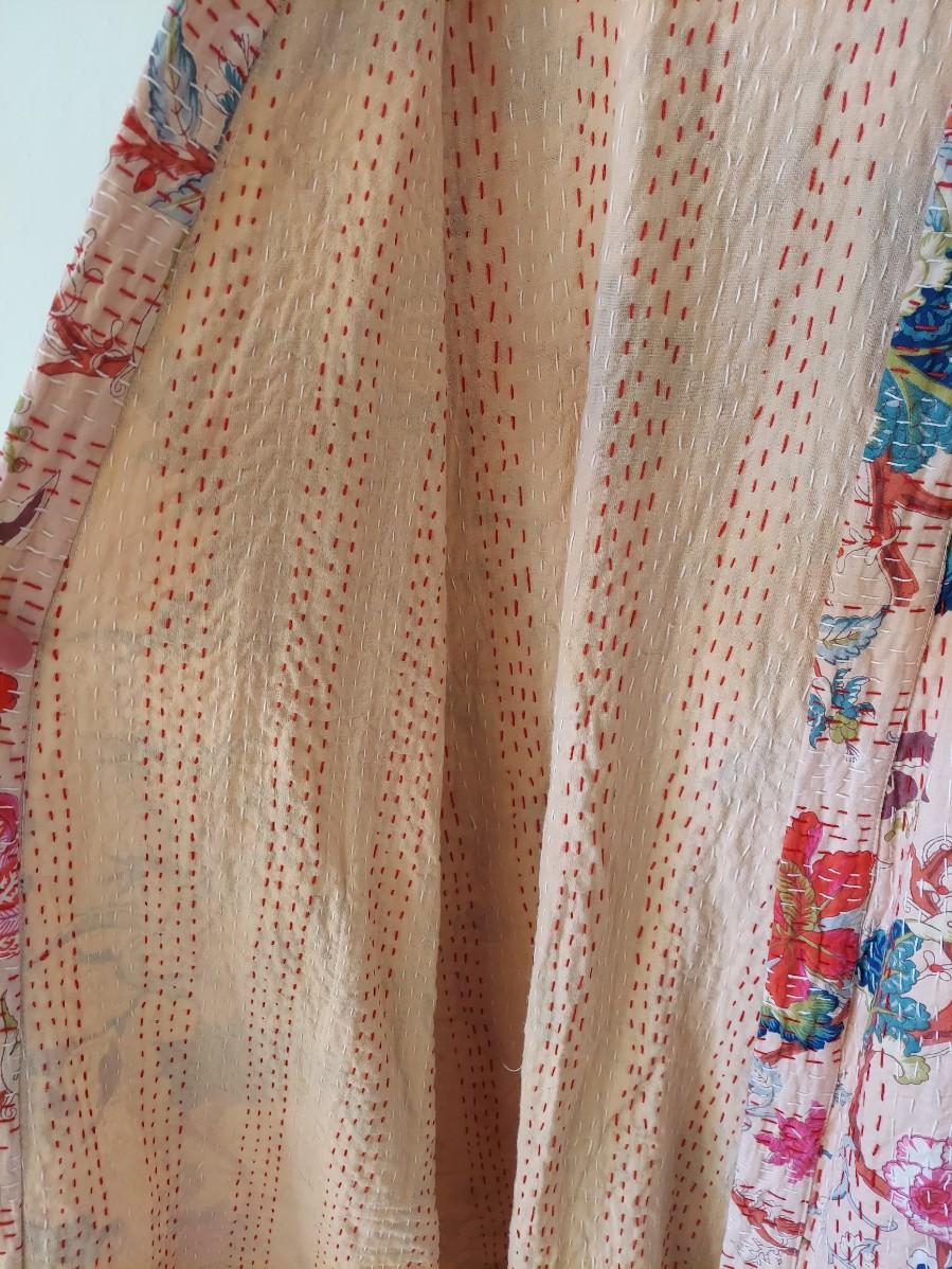 Beautiful floral cotton robe that is done in a kantha style. There are no tags so we are unsure if this is Indian kantha or a nicely done reproduction. Fits approximate medium. Has writing unrelated to branding on the collar. Please see photos for details. Shipping available