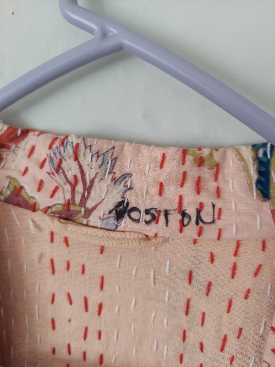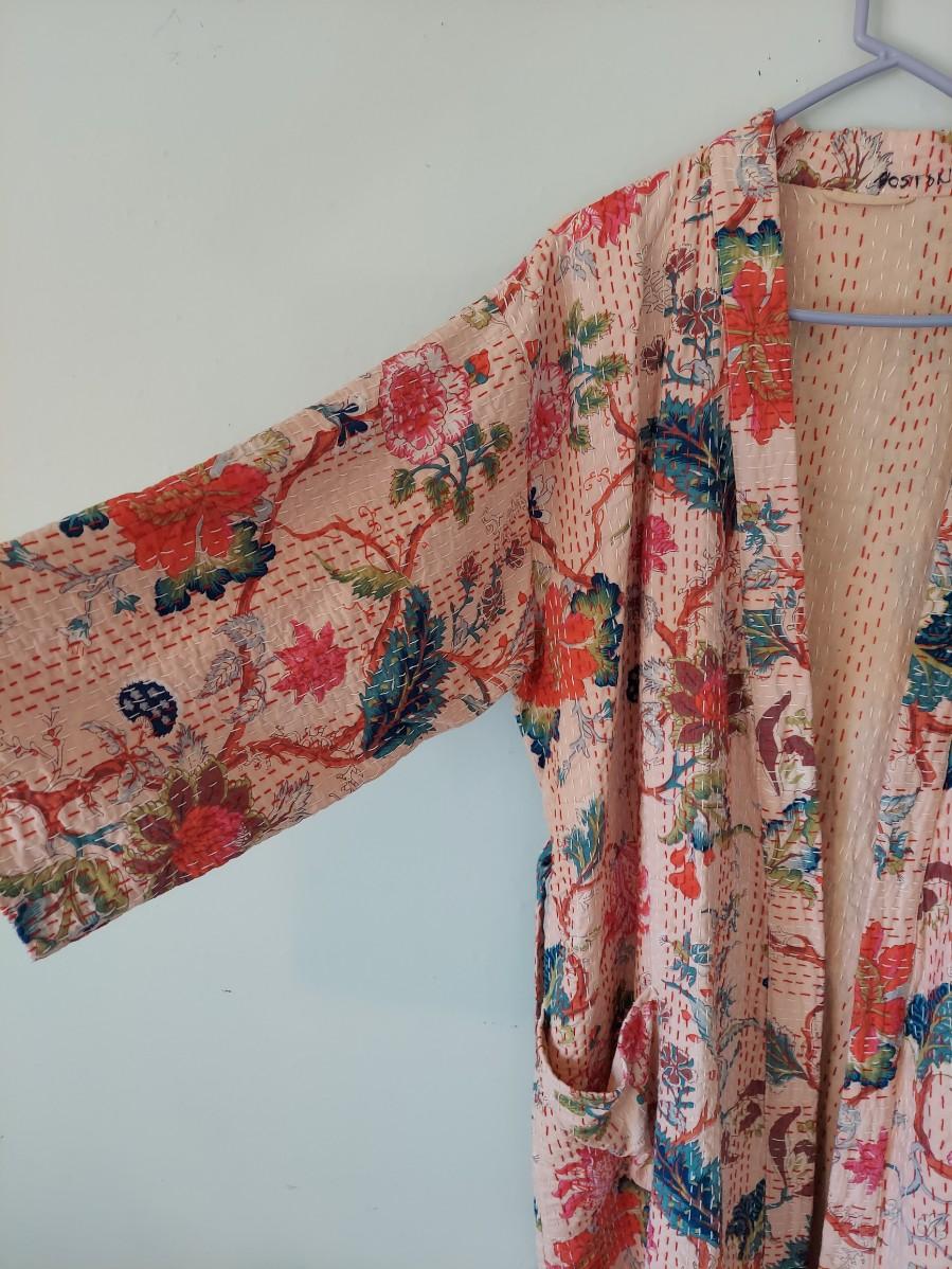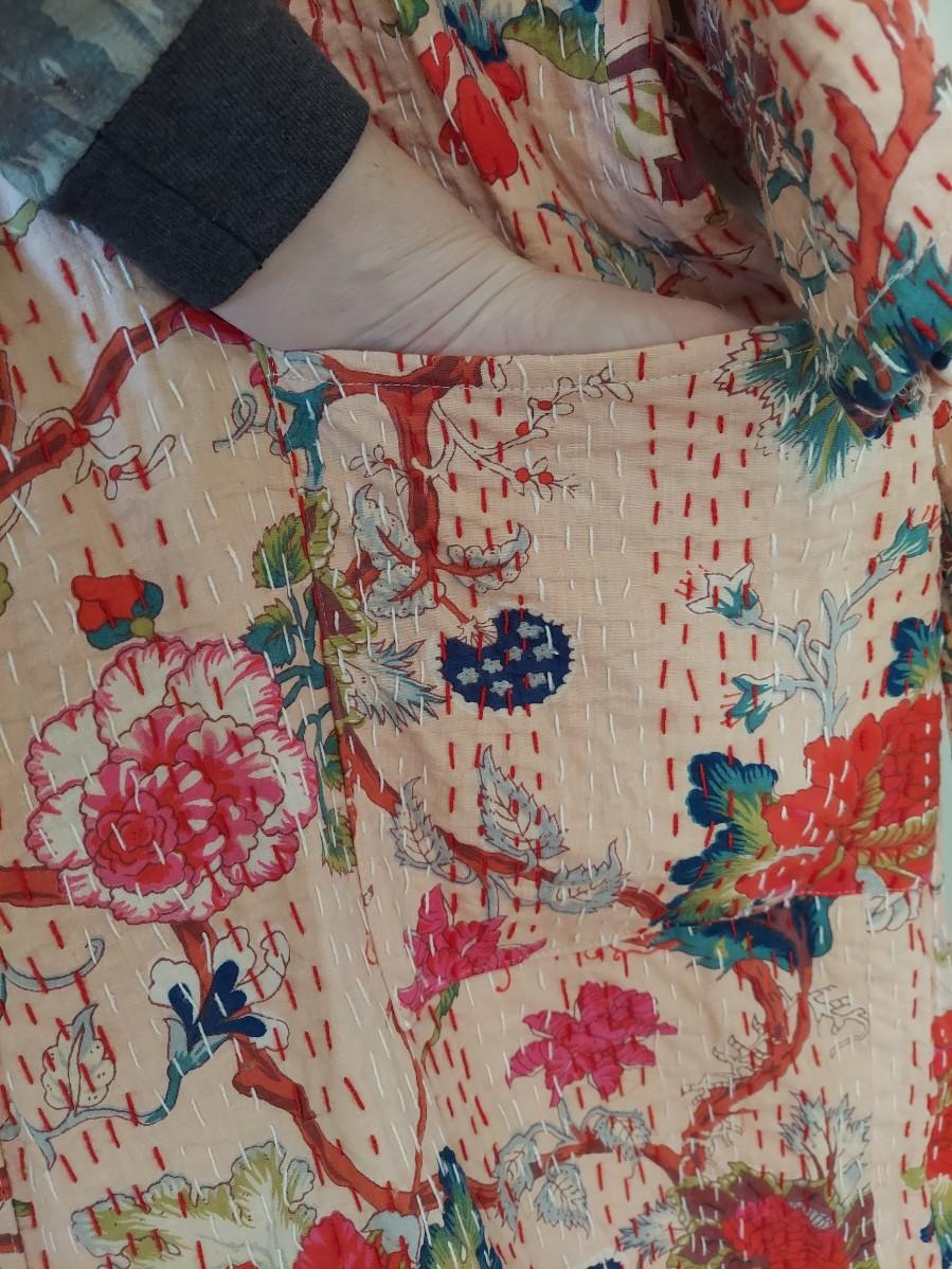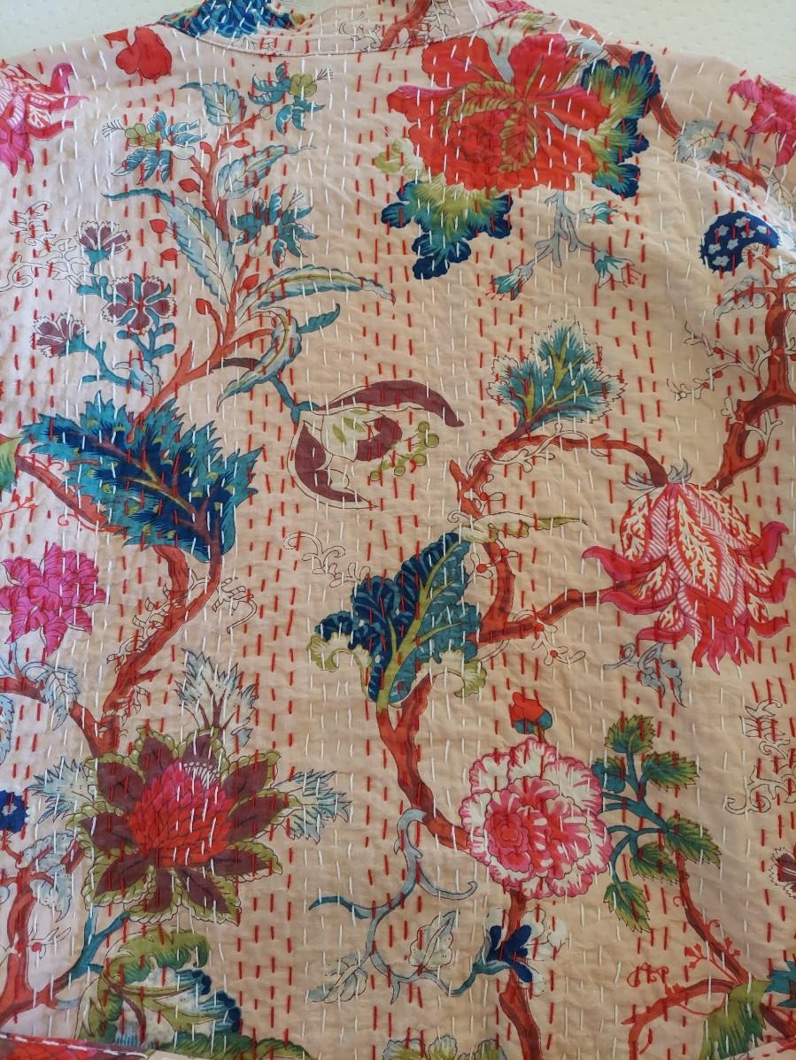 Beautiful floral cotton robe that is done in a kantha style. There are no tags so we are unsure if this is Indian kantha or a nicely done reproduction. Fits approximate medium. Has writing unrelated to branding on the collar. Please see photos for details. Shipping available