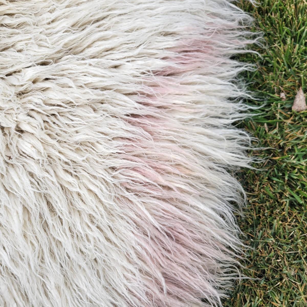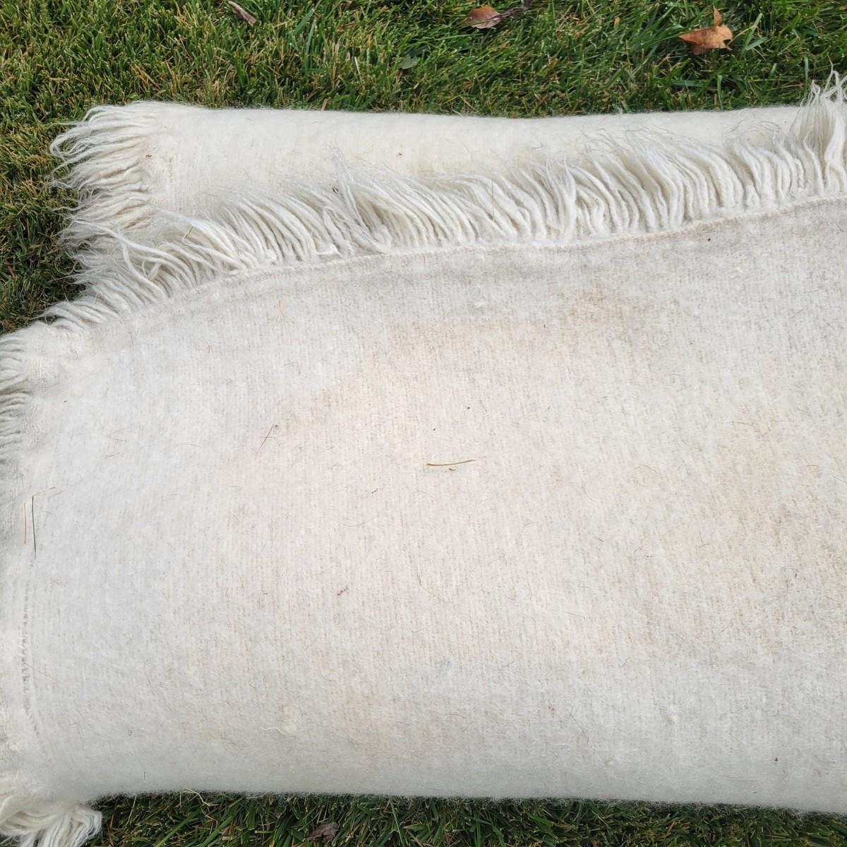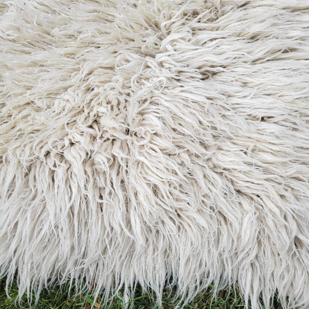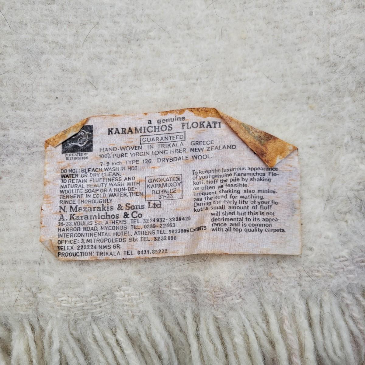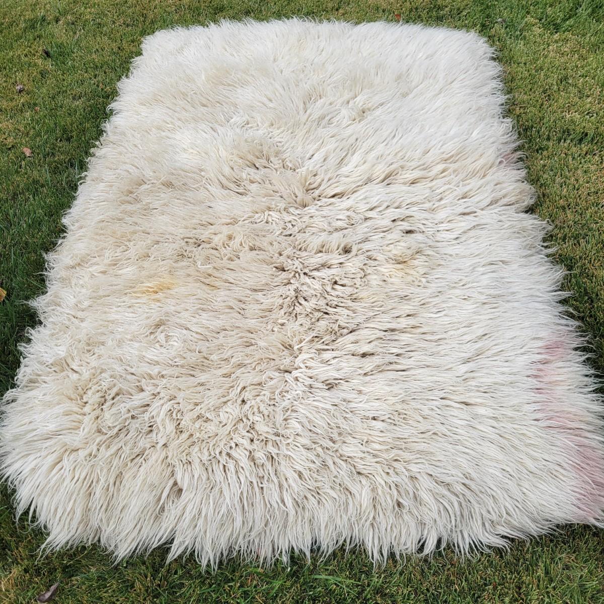 A Karamichos Flokati hand woven 100% Virgin long fiber wool rug. It measures approximately 6' x 4'. It does have two notable stains; see photos. Shipping available. Shipping can be costly. We suggest contacting our preferred local shipping provider, Postage Express, with dimensions and getting an estimate before bidding: (828) 670-5501 or postageexpress@yahoo.com.